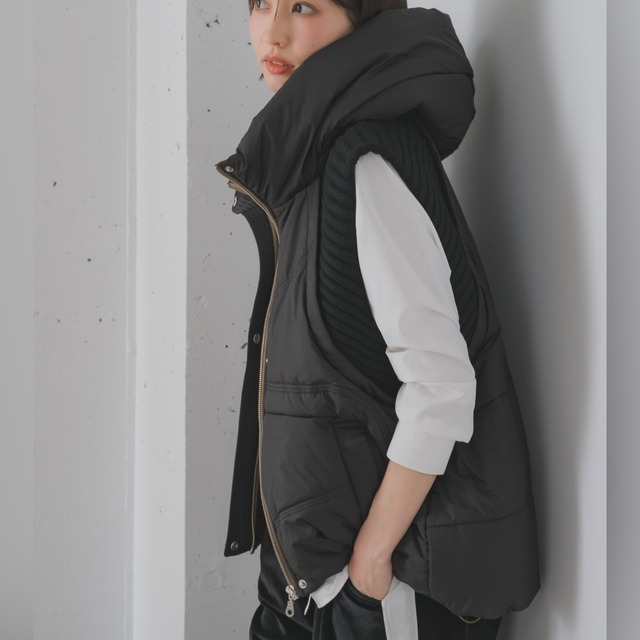 ●素材 本体 ポリエステル 100% 裏地 ポリエステル 100% リヴ ポリエステル 100% 中綿 ポリエステル 100% ●サイズ 肩幅 : 45cm 身幅 : 62cm 着丈 : 67cm ● 陽だまりのような暖かさを感じるニットコンビ中綿ベスト。軽量でありながらしっかりとした中綿が、寒い季節でも心地よい暖かさを提供します。スタイリッシュなデザインは、カジュアルなコーディネートから少しフォーマルなシーンまで幅広くお使いいただける一着です。シンプルなデザインながら、スタンドカラーとアームのニットデザインが特徴でリラックスした着心地ながらも、きちんと感を損なわないため、カジュアルな日常使いからちょっとしたお出かけにも最適です。 ●売り切れの場合お取り寄せも承ります。お取り寄せで在庫があった場合、ご注文から土日祝挟まず5日間の発送の猶予をお願い致します。