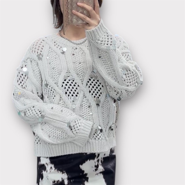 ●素材 アクリル80%ウール20% ●サイズ 身幅 : 55 着丈:55 ●華やかなラウンドスパンコールニットが登場!煌めくスパンコールが施されており、光の加減で様々な表情を楽しめる一枚です。冬の装いにさりげない華やかさを添える、スパンコールニット。立体感のある編み地に大きめと小さめのスパンコールが散りばめられておりカジュアルにも、きれいめコーデにもマッチする主役級ニット。伸縮性に優れ動きやすさも考慮しています。いつものスタイルに華やかさをプラスして、おしゃれを楽しんでください。 ●売り切れの場合お取り寄せも承ります。 お取り寄せで在庫があった場合、ご注文から土日祝挟まず5日間の発送の猶予をお願い致します。