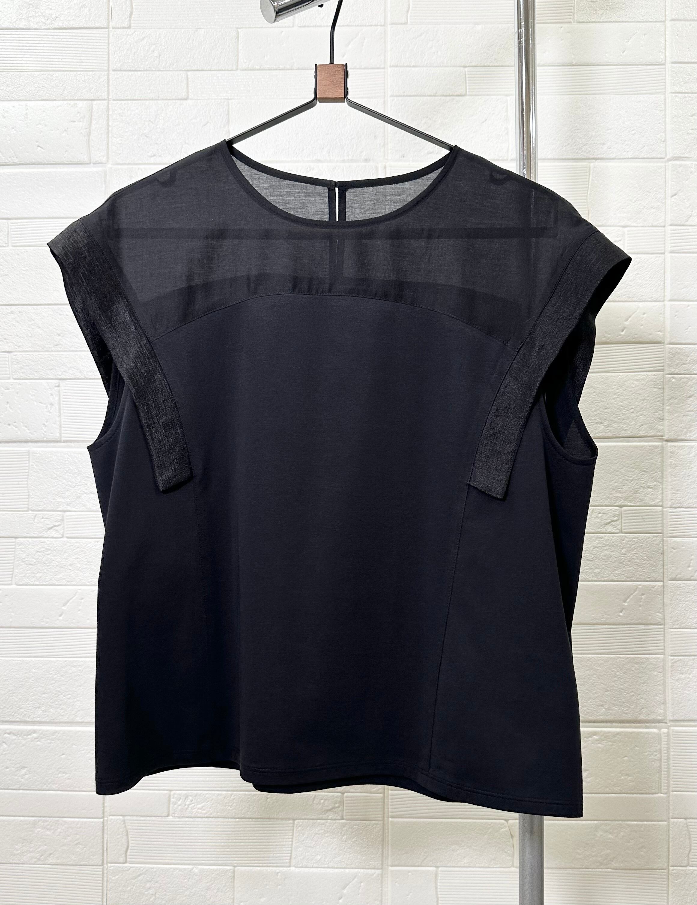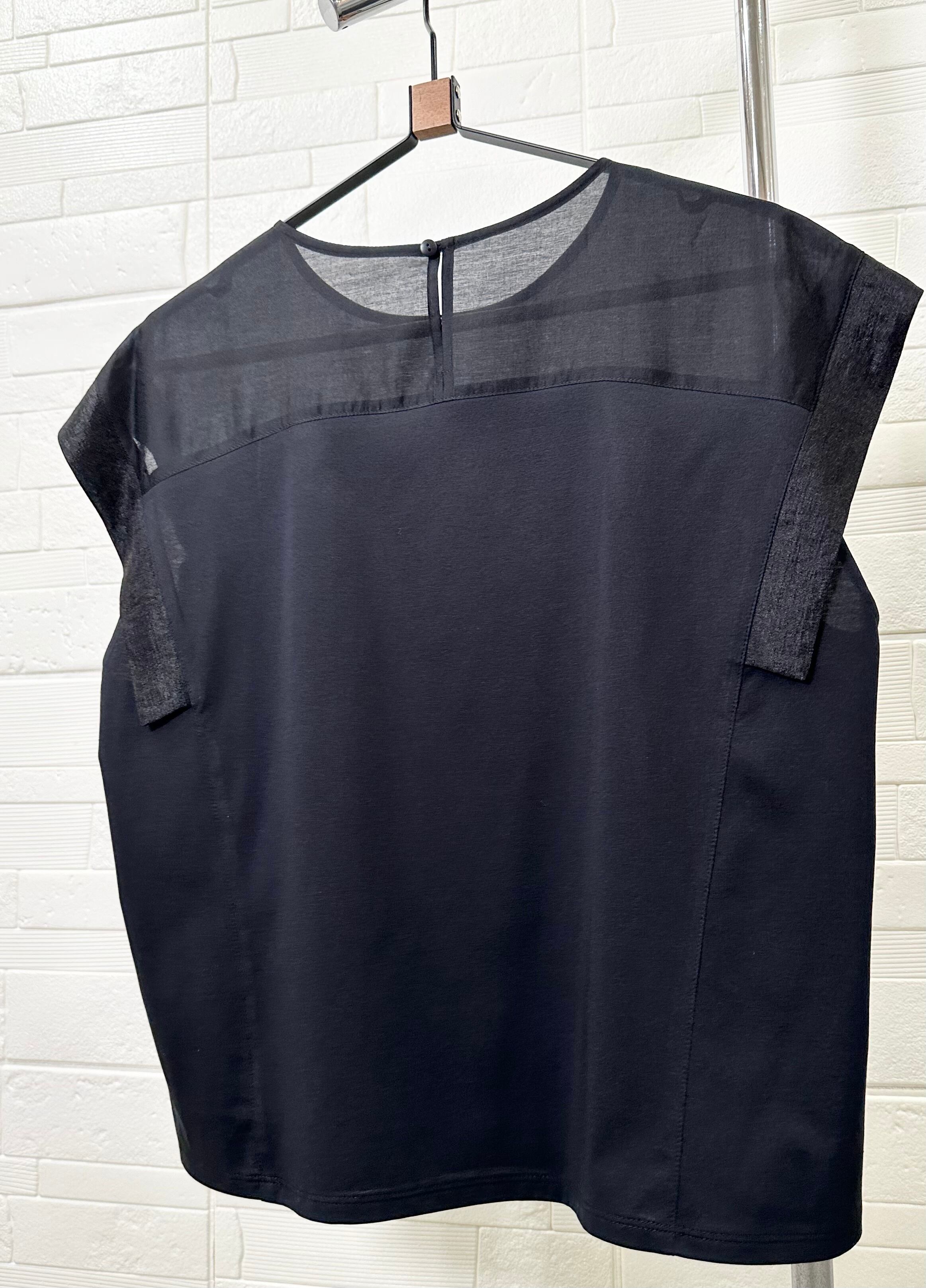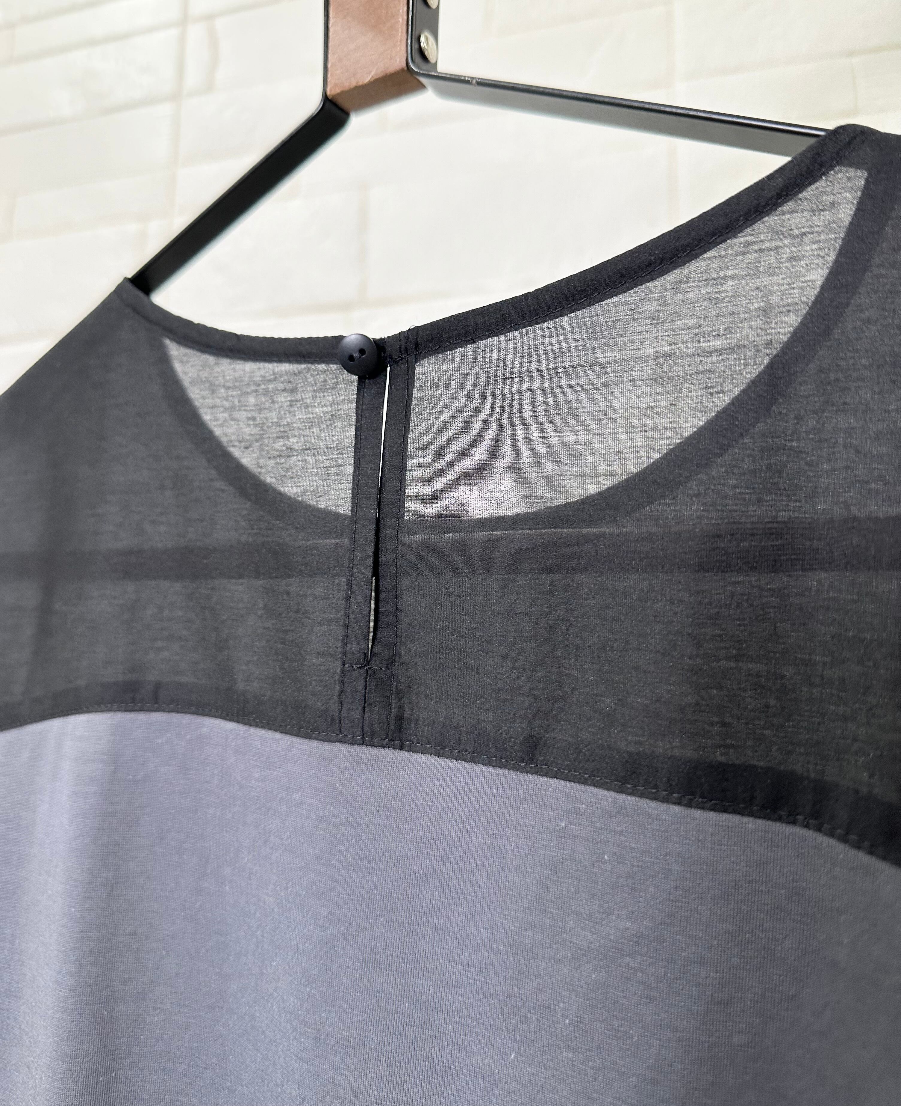 ●スタイリッシュなバイカラー切り替えTシャツ✨柔らかいカットソー素材と涼しげなブラウス素材を使用した異なる素材が組み合わさったTシャツ。バイカラーの切替デザインがスッキリとしオフィス使いも出来そうな大人っぽさあるTシャツです✨
