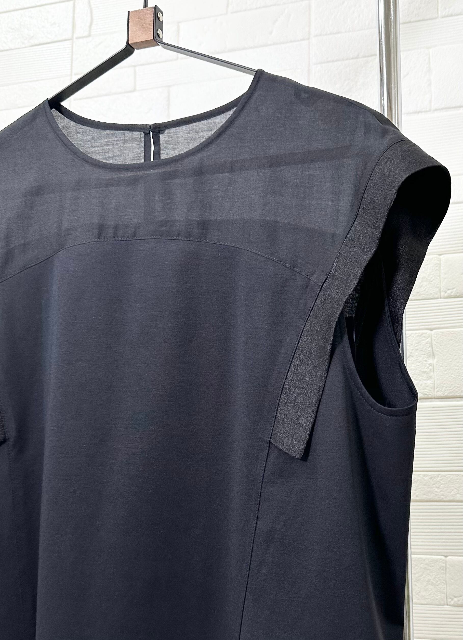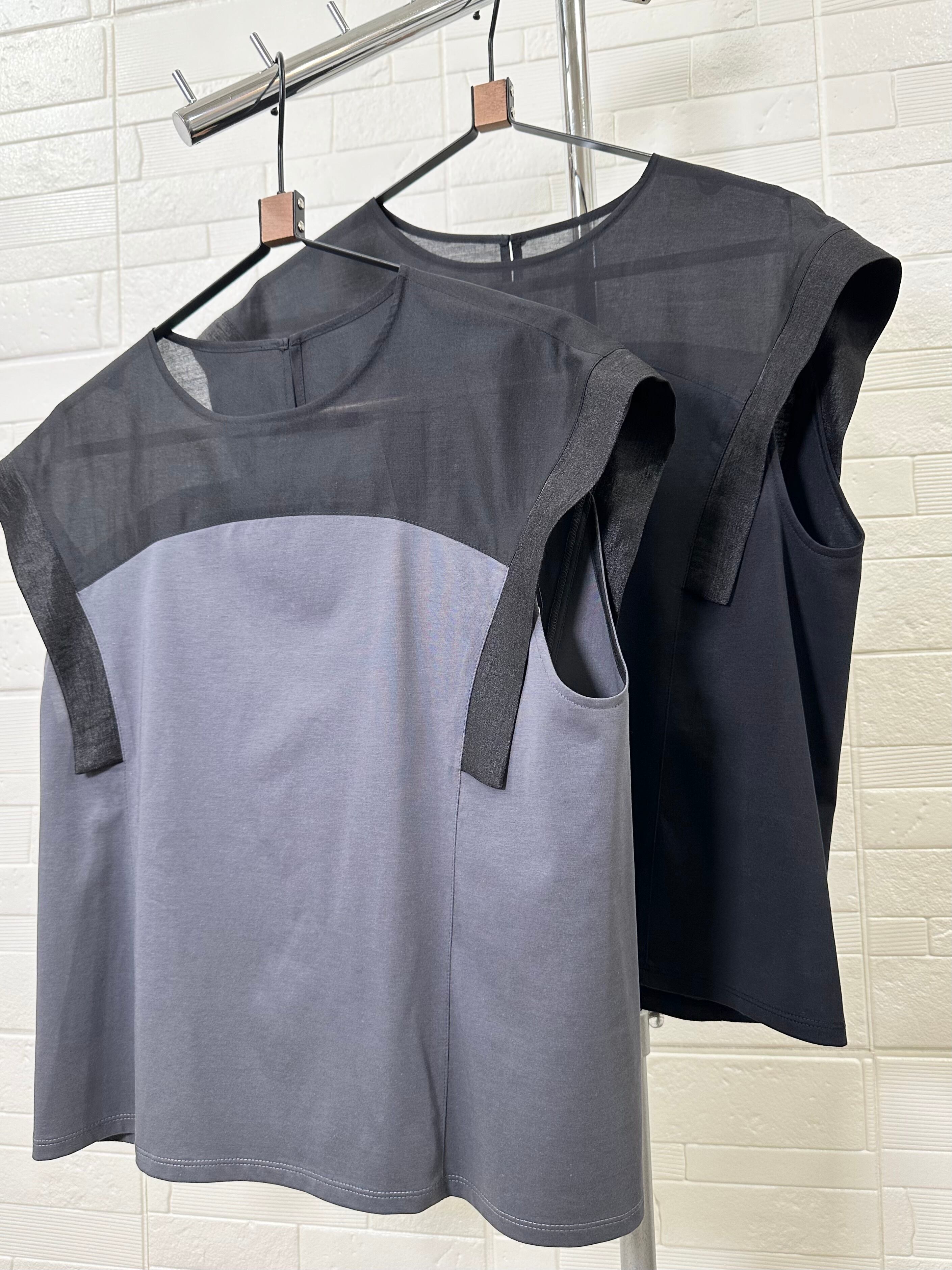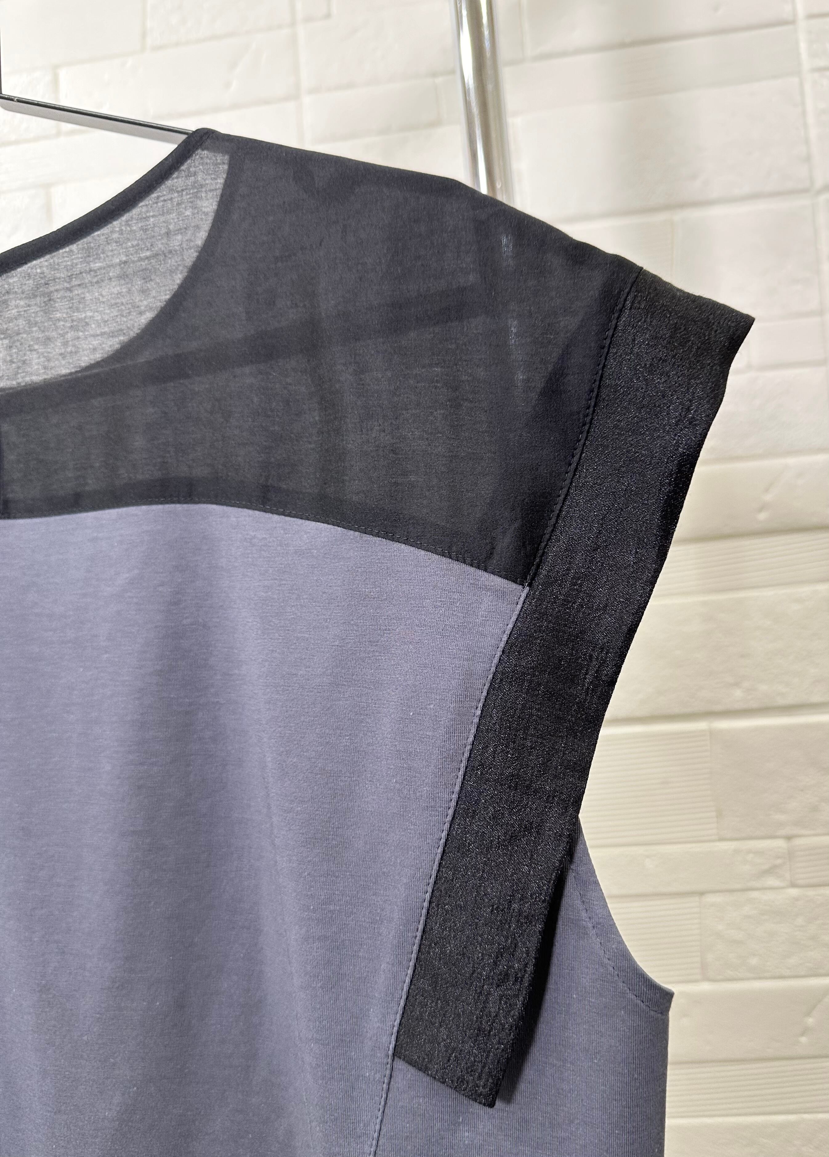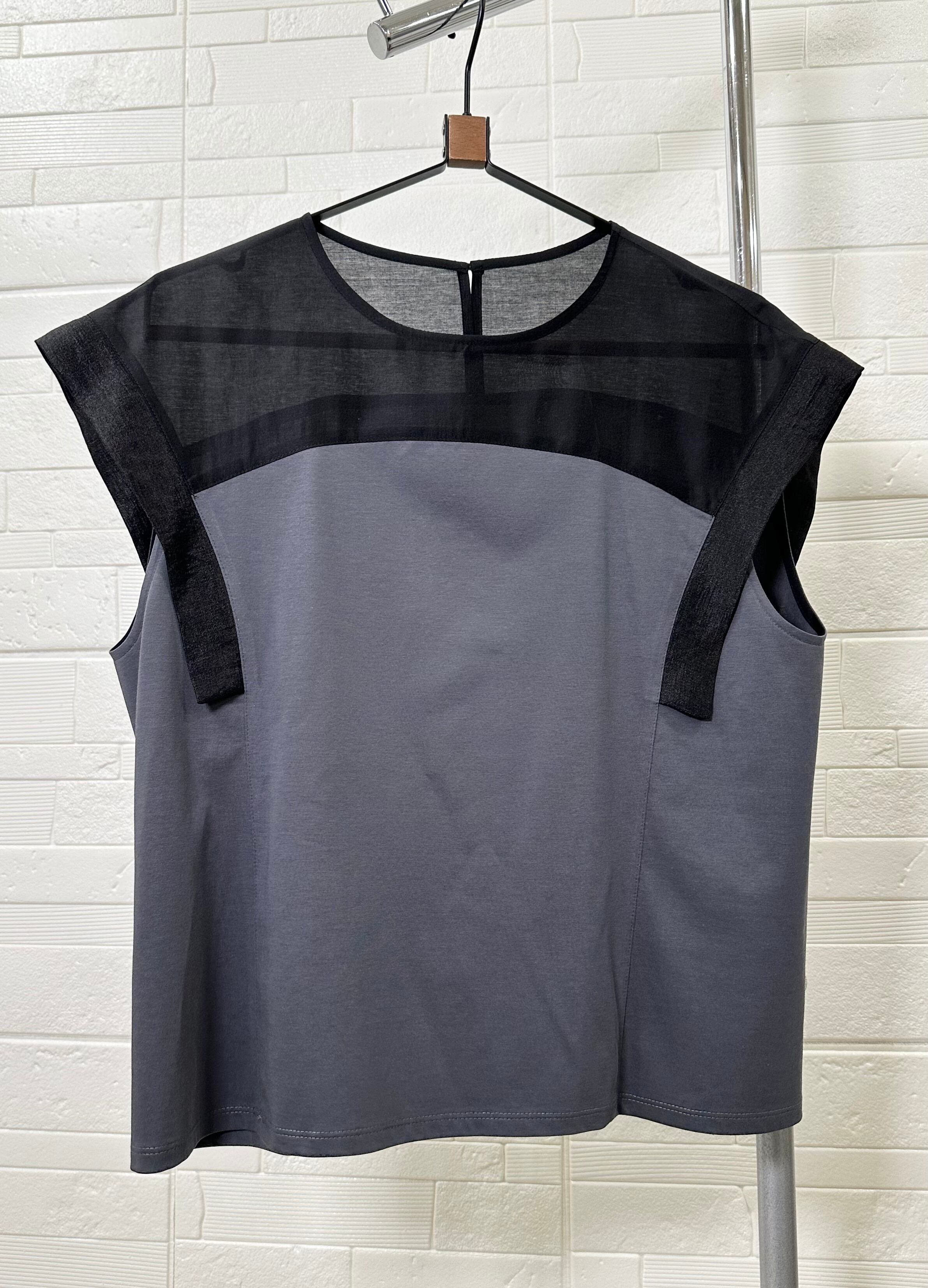 ●スタイリッシュなバイカラー切り替えTシャツ✨柔らかいカットソー素材と涼しげなブラウス素材を使用した異なる素材が組み合わさったTシャツ。バイカラーの切替デザインがスッキリとしオフィス使いも出来そうな大人っぽさあるTシャツです✨