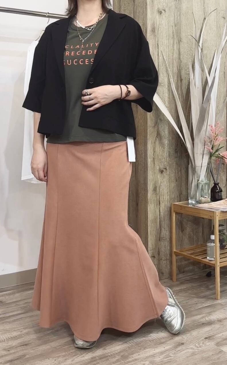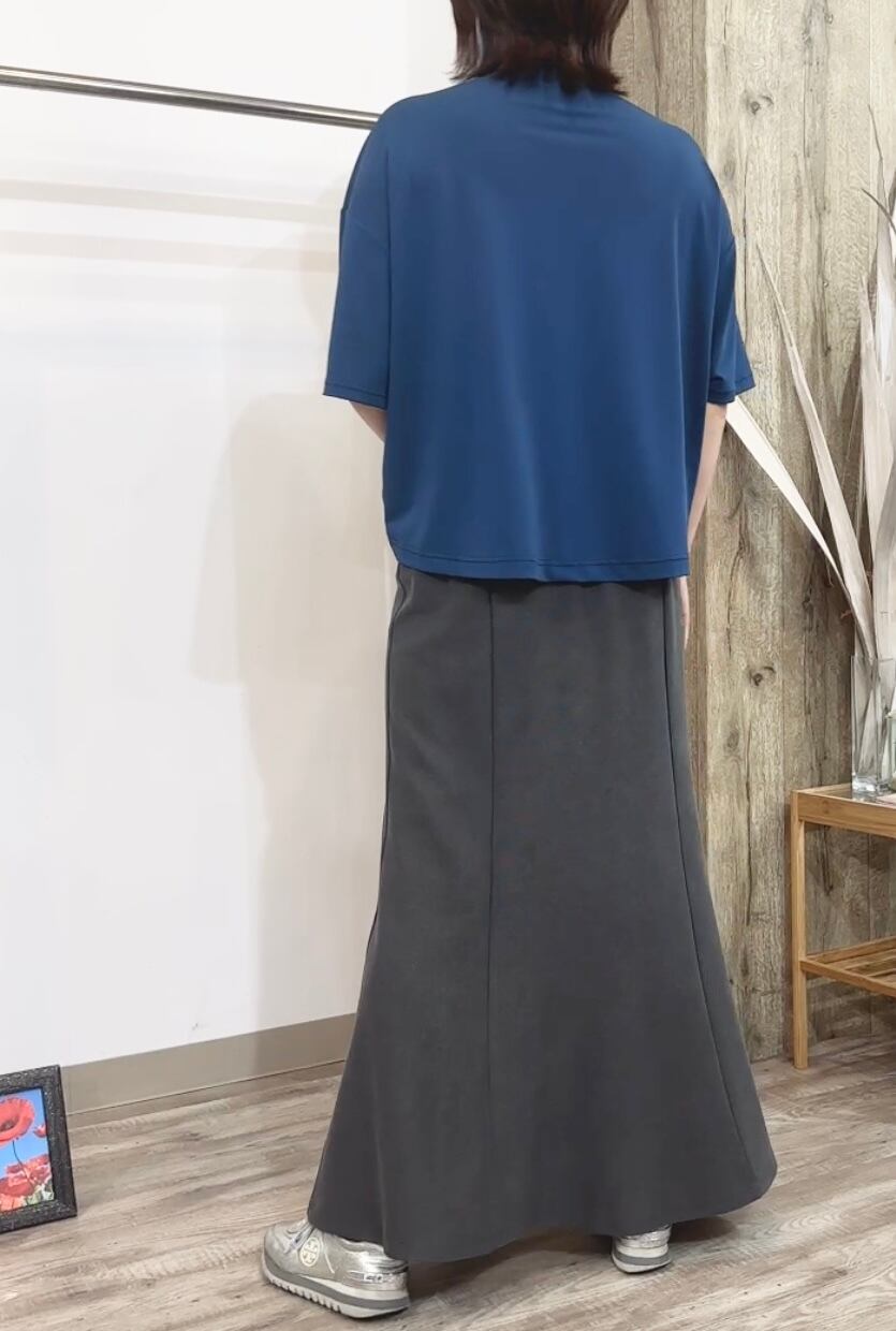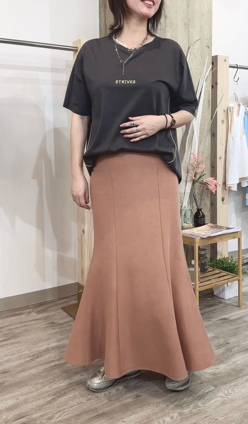 柔らかな肌触りが心地よいミニワッフル素材に、奥行きのある製品染めを施すことで、こなれたカジュアル感を演出します。ウエストは後ろゴム仕様なので、楽ちんなのにトップスインもきれいに決まり、ストレスフリーな穿き心地。裾に向かって優雅に広がるマーメイドシルエットは、