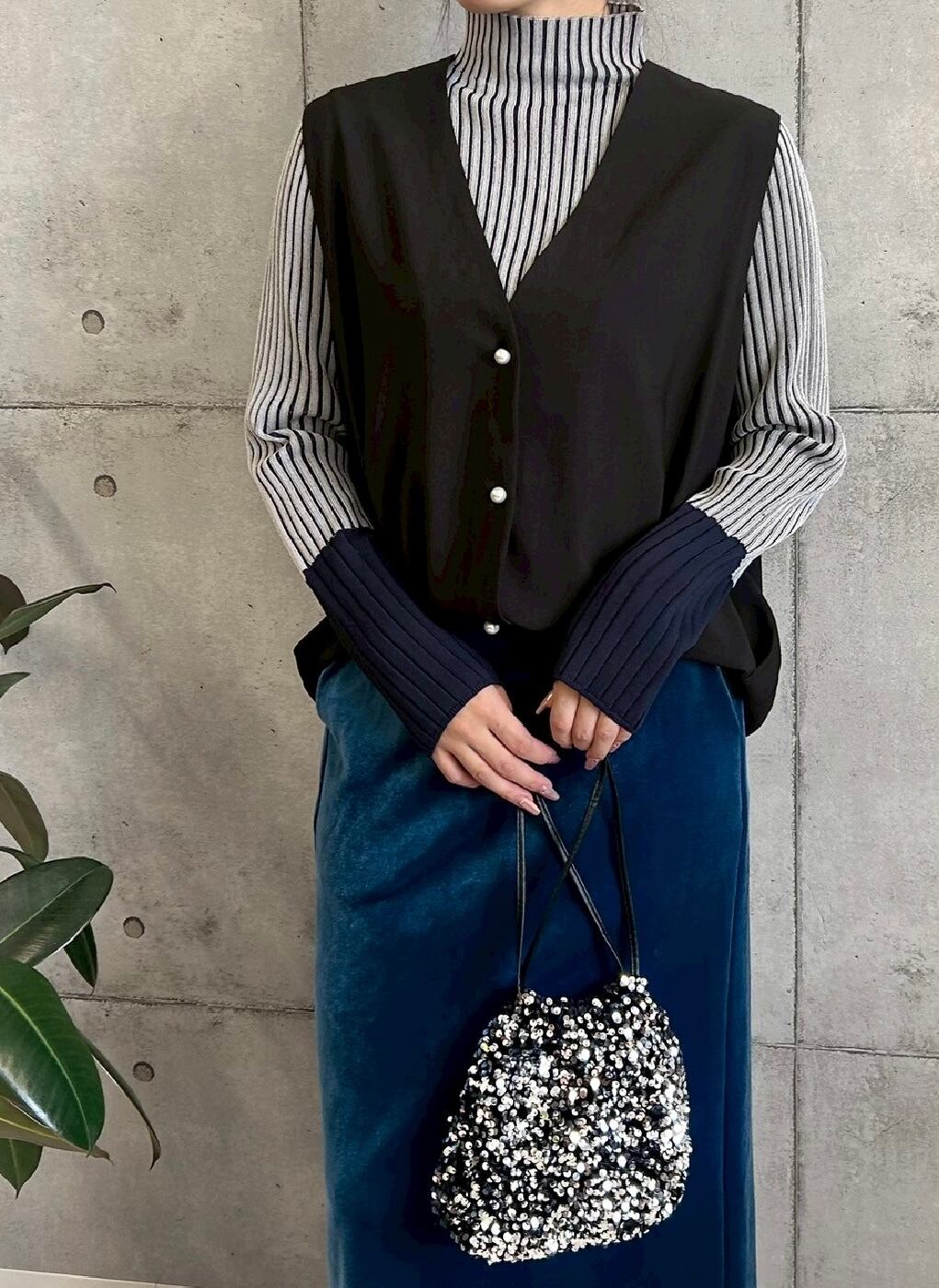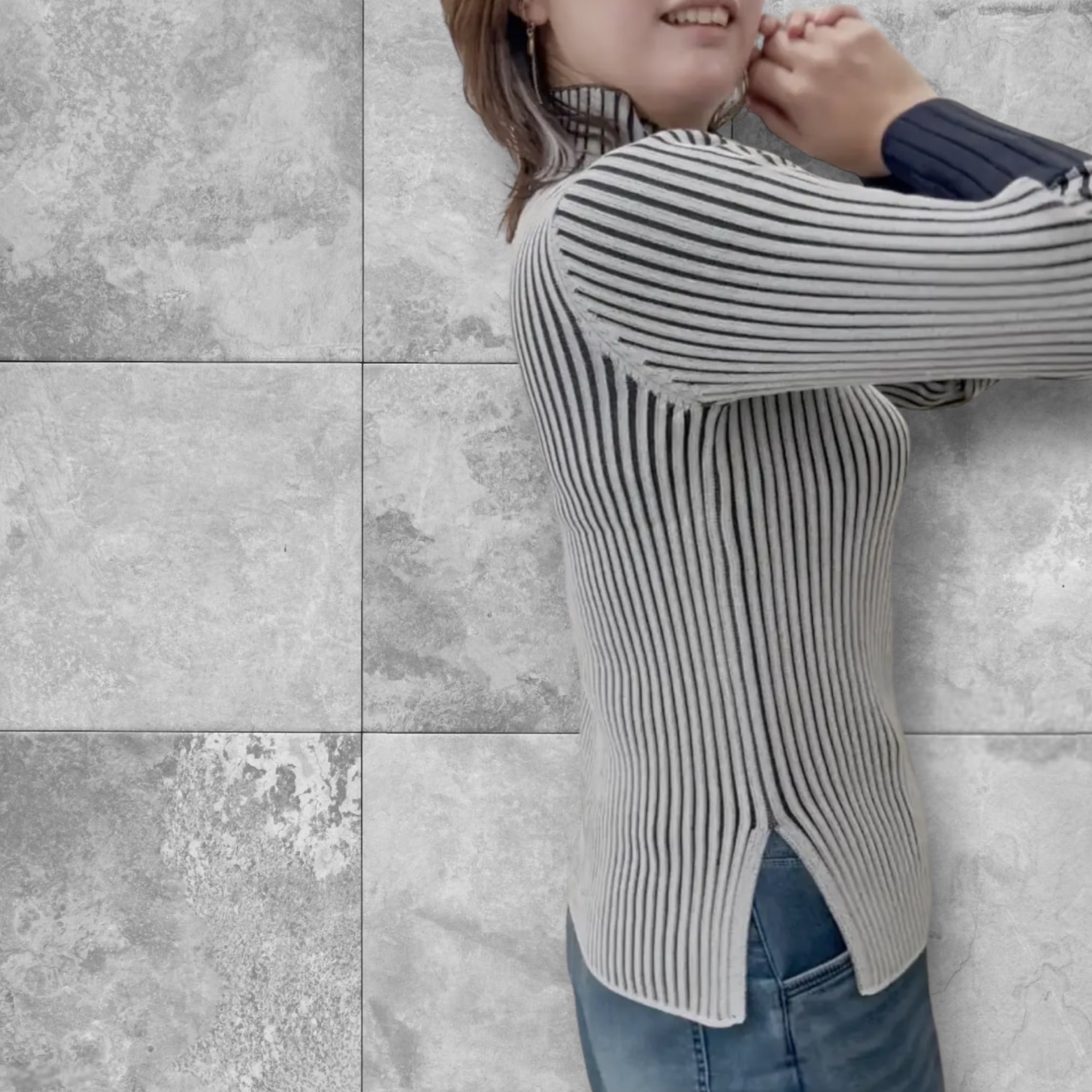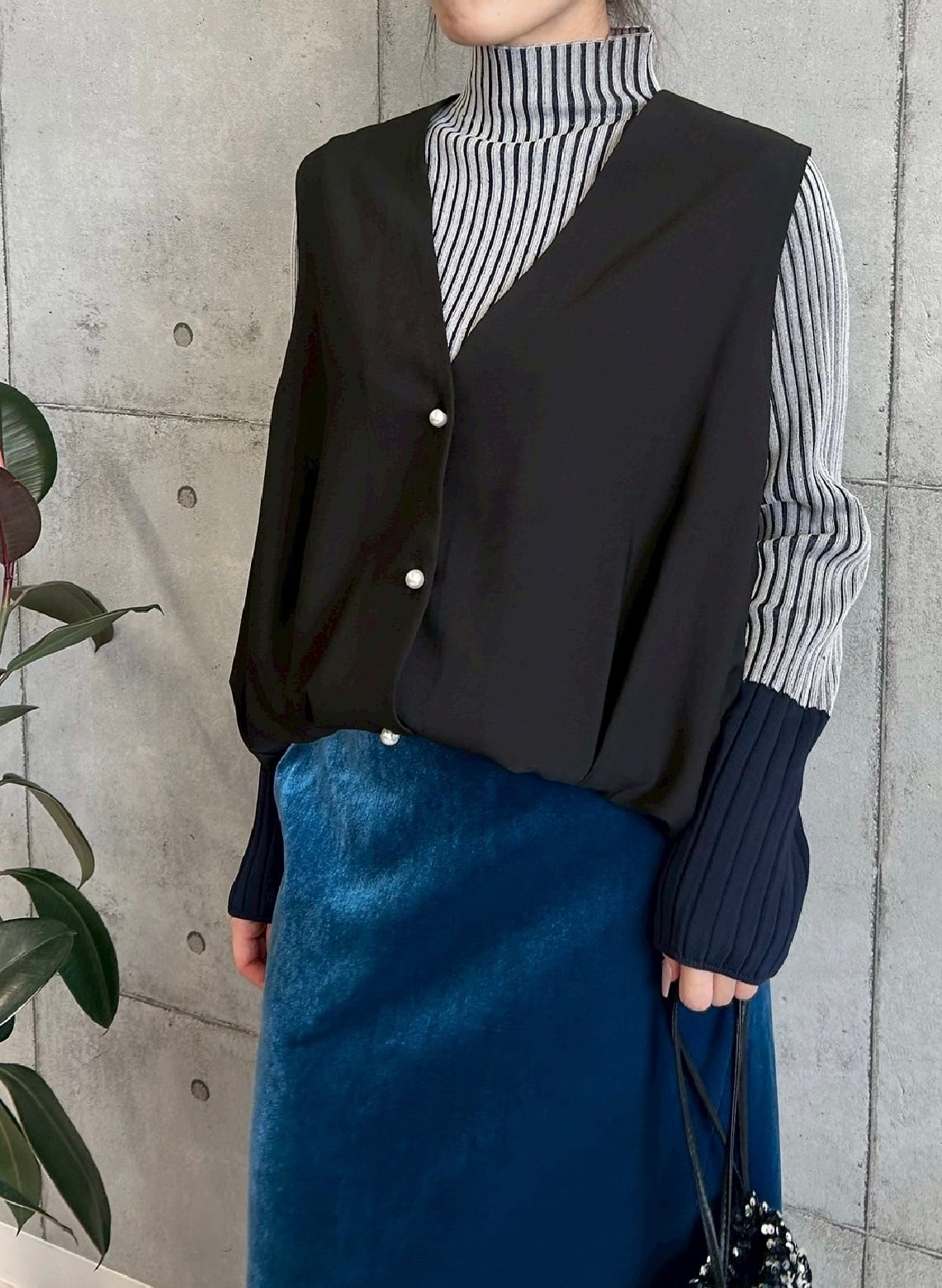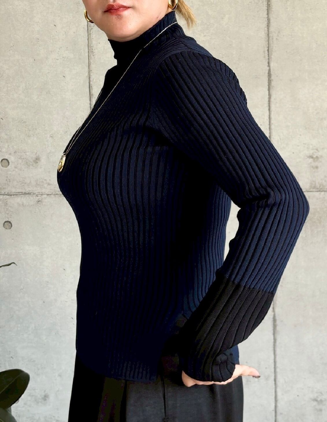 ● 大人らしい配色がポイントのリブニット。二重臼と呼ばれる編地手法を採用しているので、リブのラインがより引き立ち、すっきりとした印象に。袖の配色部分は、身頃よりも太いワイドリブになっている点もポイント。程よくゆとりができるサイズ感なので、肉感を拾いにくく1枚での着用はもちろんのこと、インナーとしても活躍する万能トップスでオススメです。
