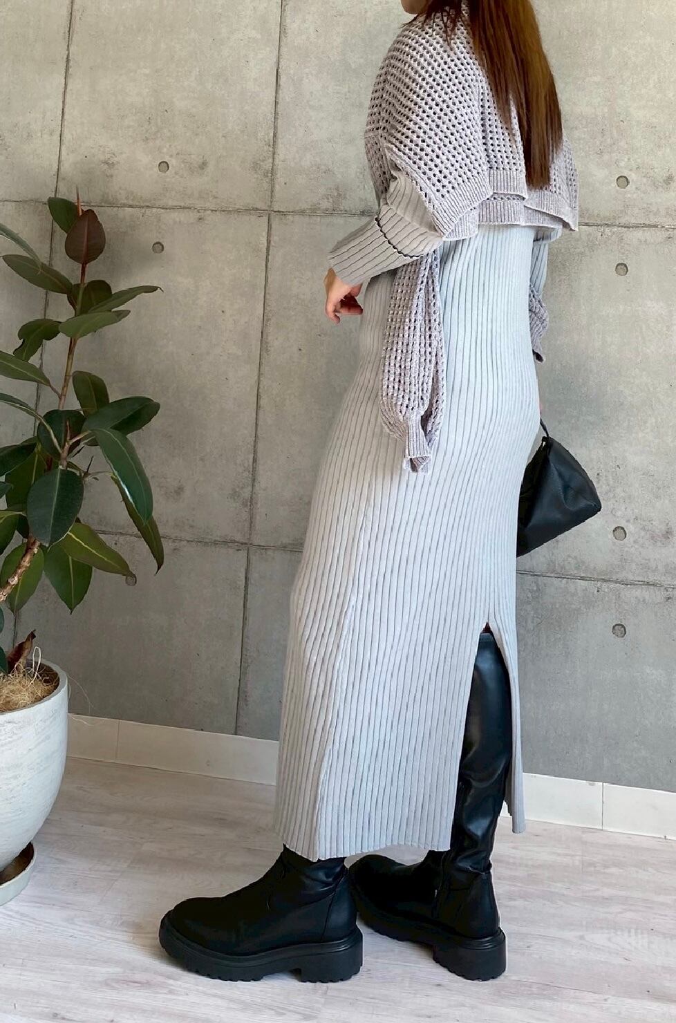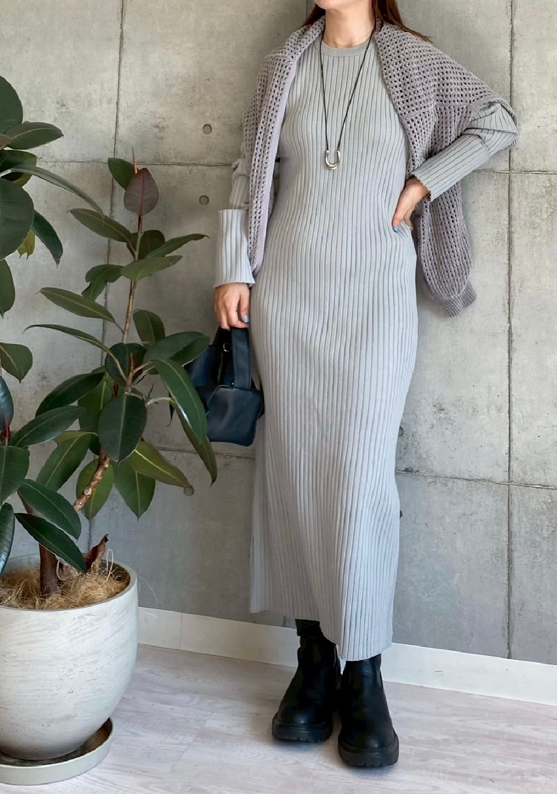 ● 軽やかな着心地が魅力の、ポリエステル素材を使用したニットワンピース。ワイドリブ編みが縦のラインを強調し、すっきりとした細見え効果を演出します。袖口は長めの折り返し仕様で、デザイン性と上品さをプラス。袖のラインも美しく見せてくれます。1枚で着るのはもちろん、インナーワンピースとしても活躍。上からベストやトップスを重ねれば、スカート風の着こなしも楽しめる万能アイテムです。カジュアルからキレイめまで、幅広いスタイリングに対応します。全体は|ラインシルエットで美しいシルエットに。