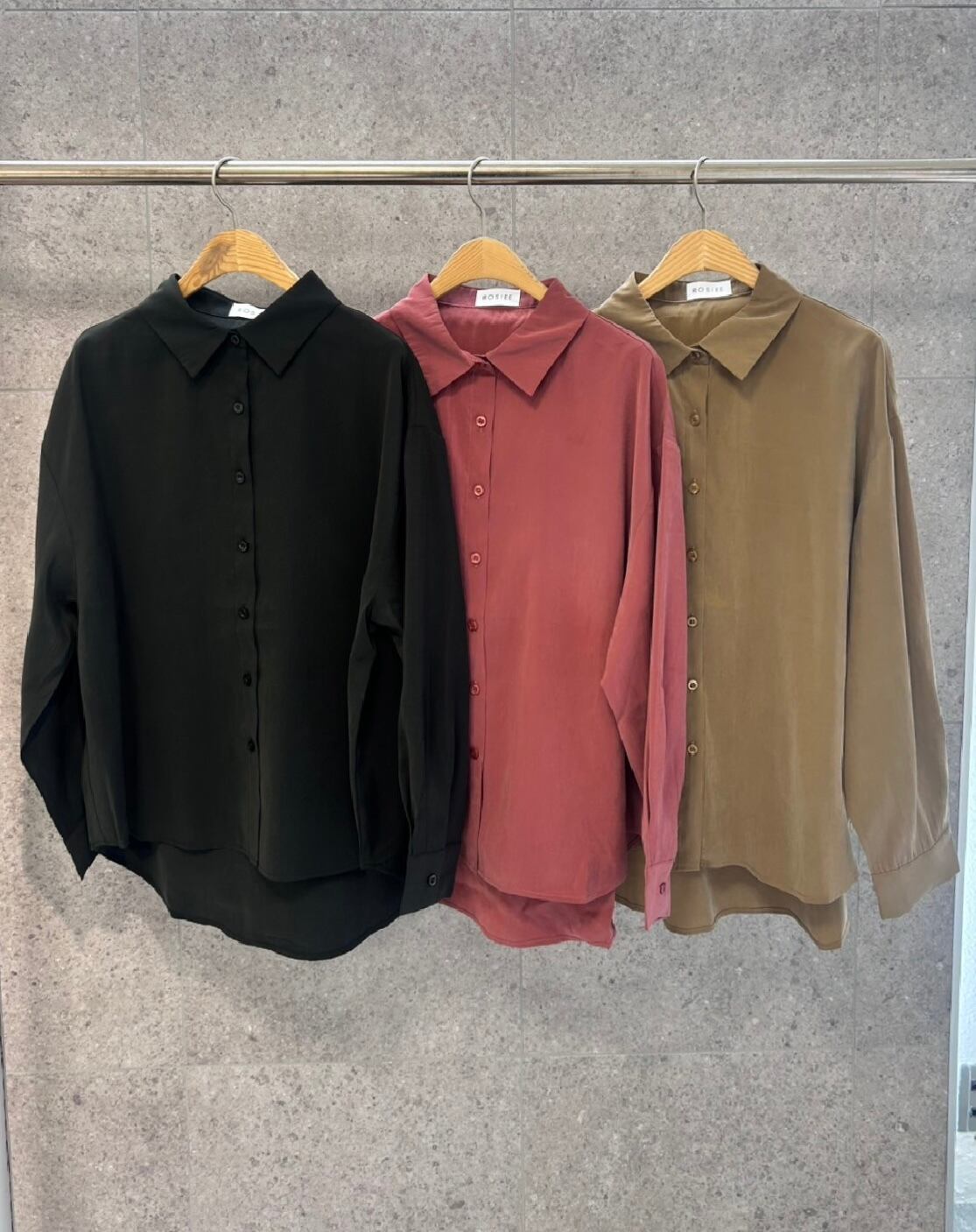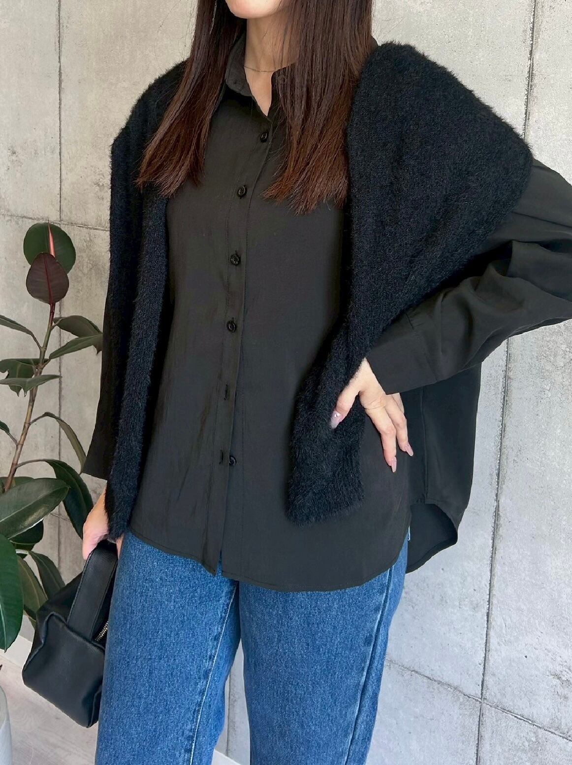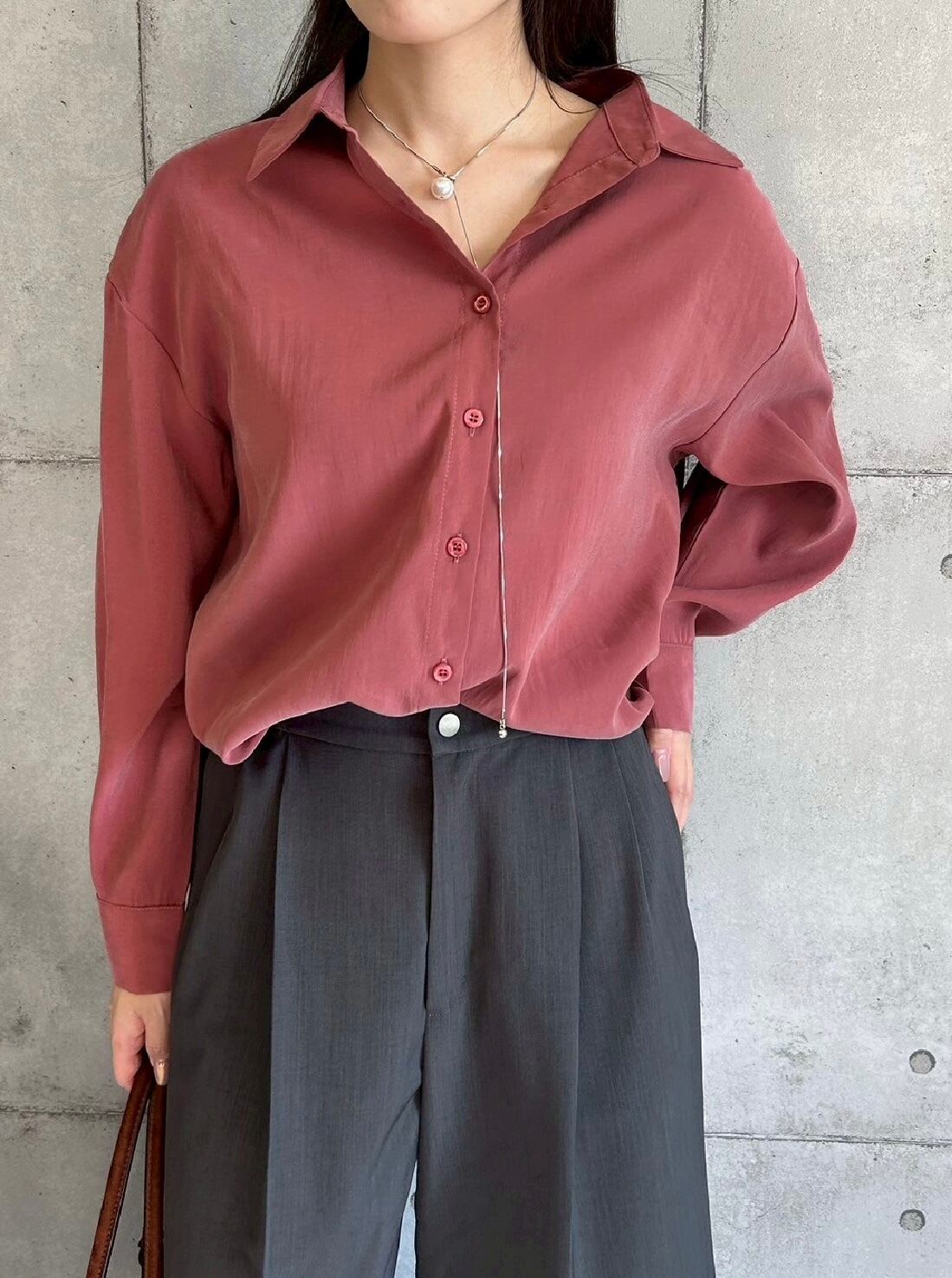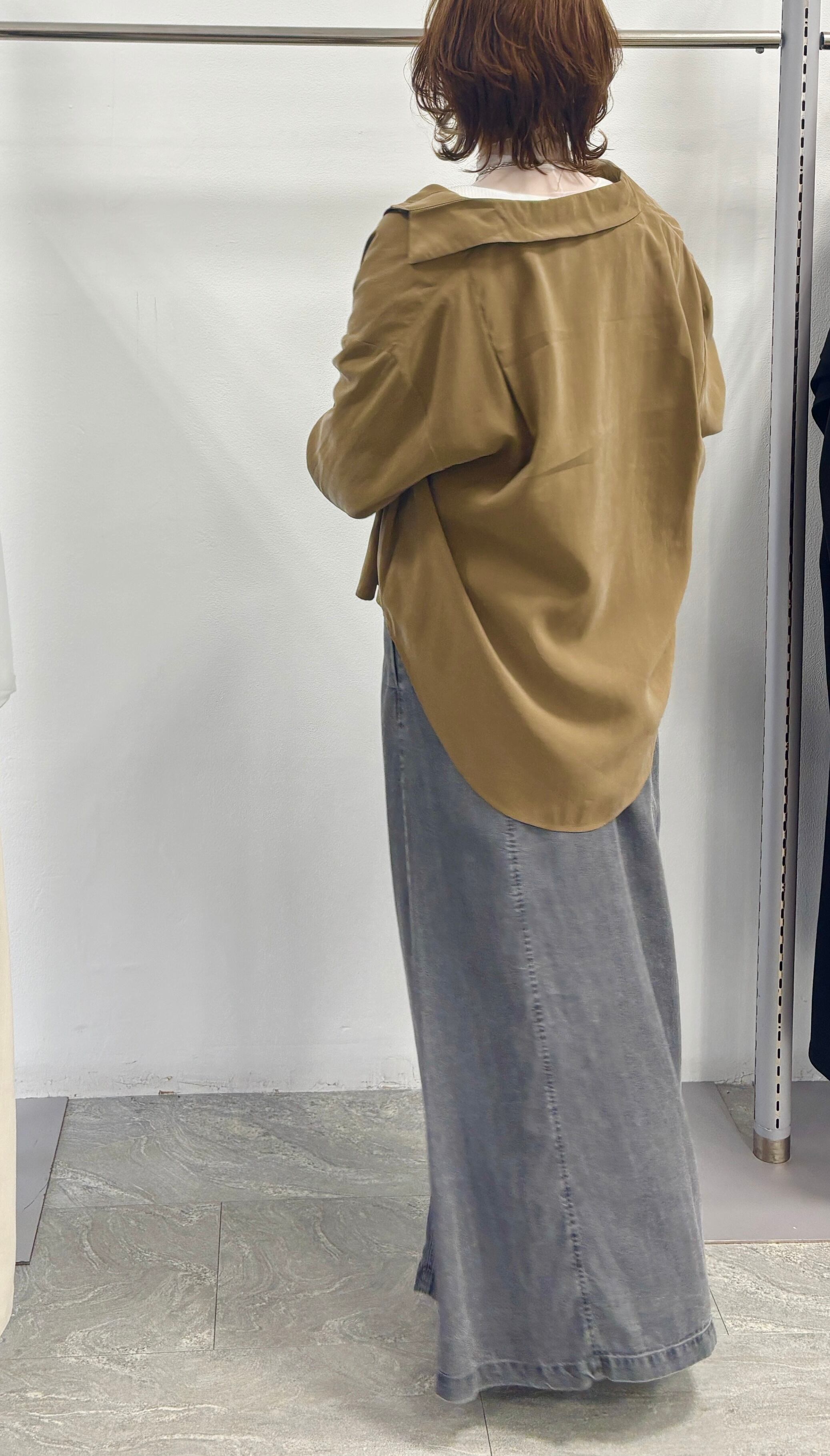 ● とろみのあるモダール素材を使用した、やわらかな着心地のシャツ。肌に優しくなじむなめらかな質感で、シンプルながらも上品な印象を与えてくれます。表面にはさりげない加工感があり、無地ながらも深みのある表情に。素材そのものの風合いが引き立つ1枚です。同素材のスカートも展開しており、セットアップとして着こなすのもおすすめ。単品でも、合わせ方次第でオン・オフ問わず幅広く活躍するアイテムです。