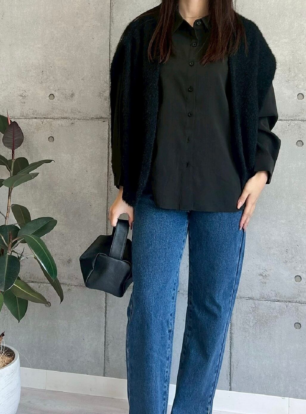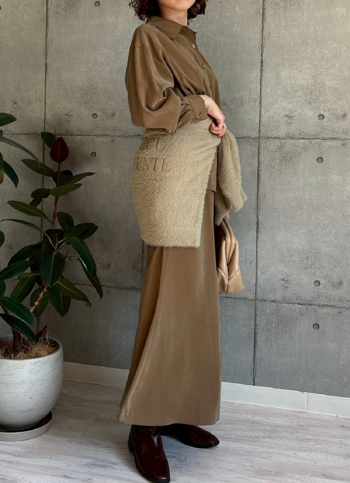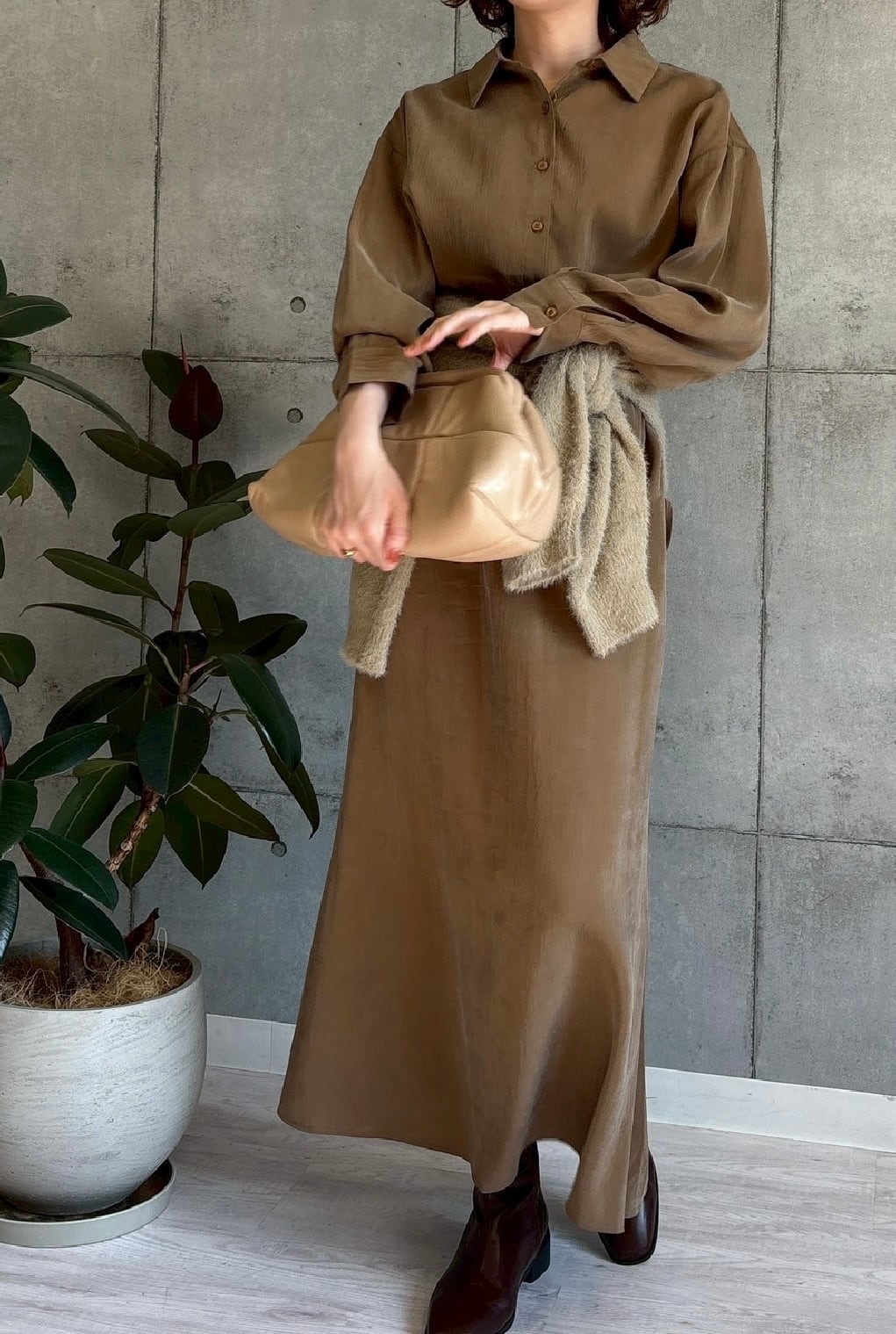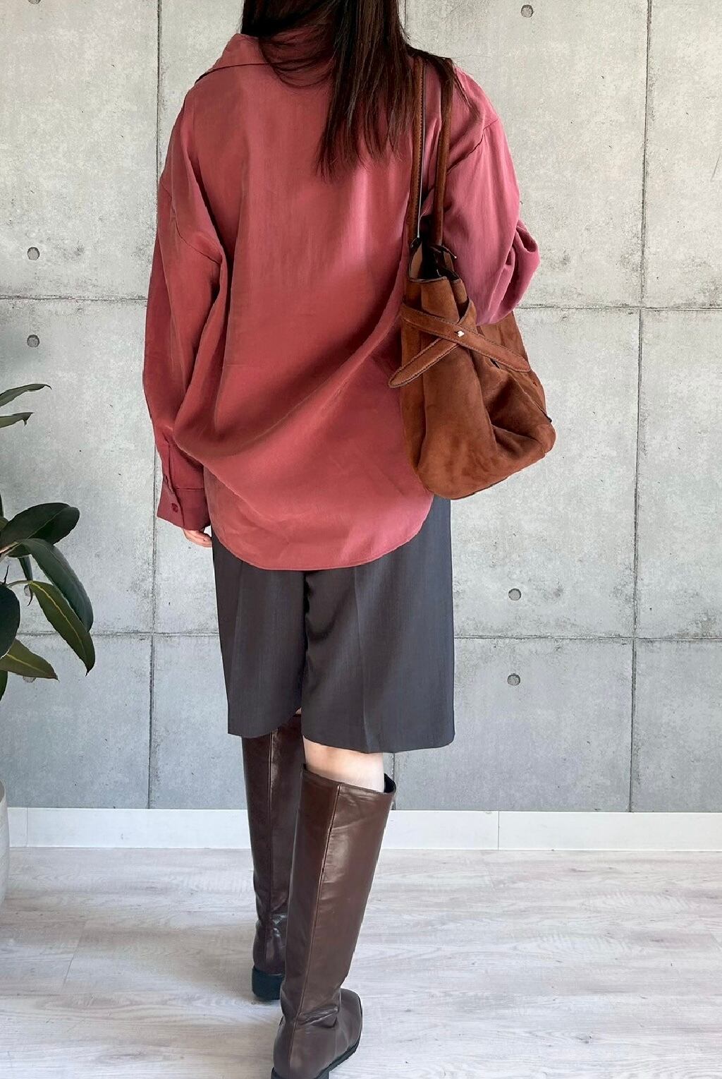 ● とろみのあるモダール素材を使用した、やわらかな着心地のシャツ。肌に優しくなじむなめらかな質感で、シンプルながらも上品な印象を与えてくれます。表面にはさりげない加工感があり、無地ながらも深みのある表情に。素材そのものの風合いが引き立つ1枚です。同素材のスカートも展開しており、セットアップとして着こなすのもおすすめ。単品でも、合わせ方次第でオン・オフ問わず幅広く活躍するアイテムです。