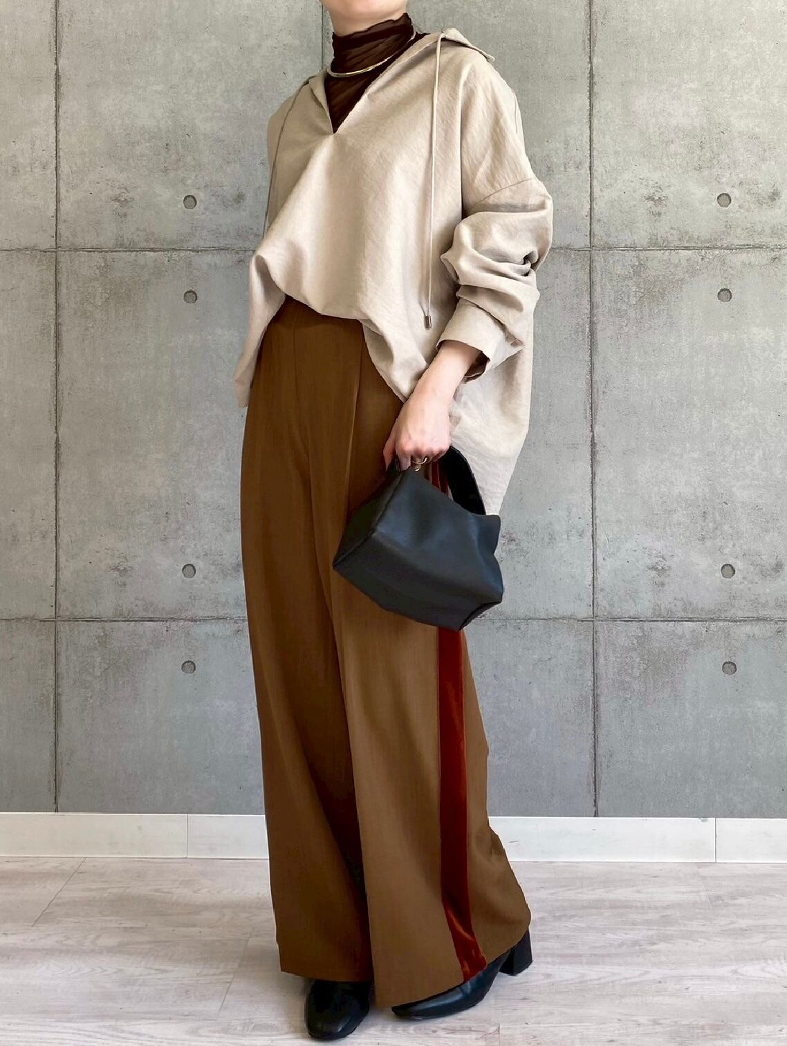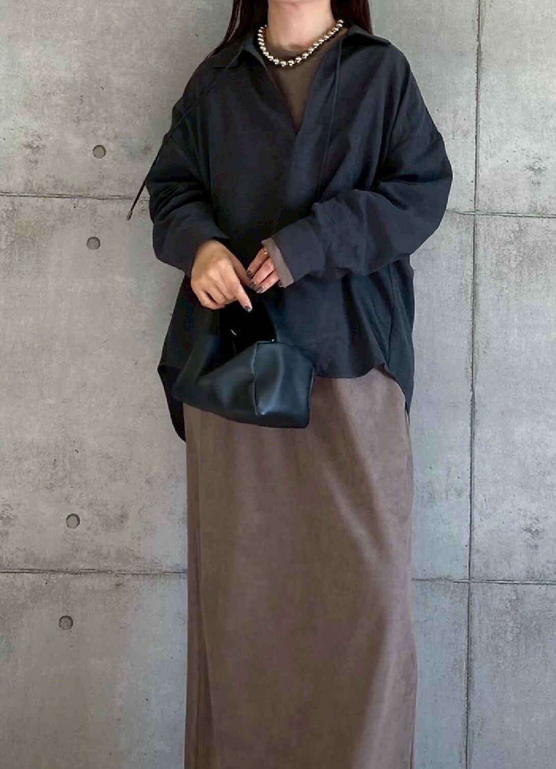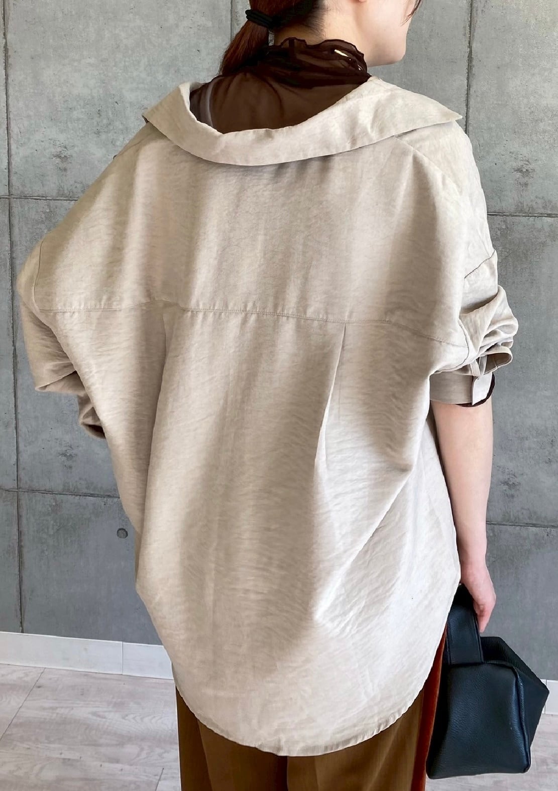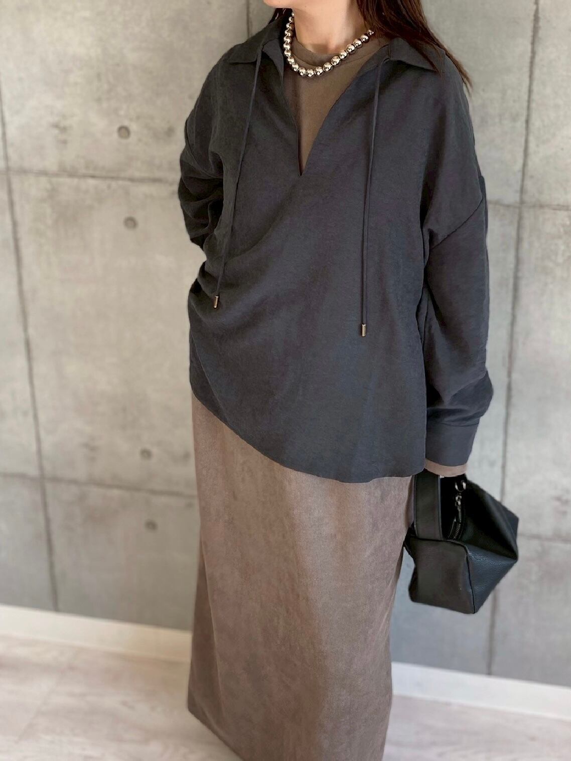 ● スエードライクの表面感のある生地を使用したブラウス。身幅のゆったり感✕首元の深Vでシルエットのバランスがきれいに見えます。今年はスエード素材もトレンドなので取り入れていただきやすいデザインにしています✨