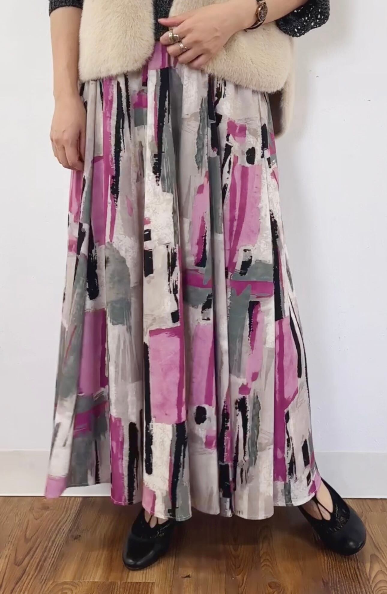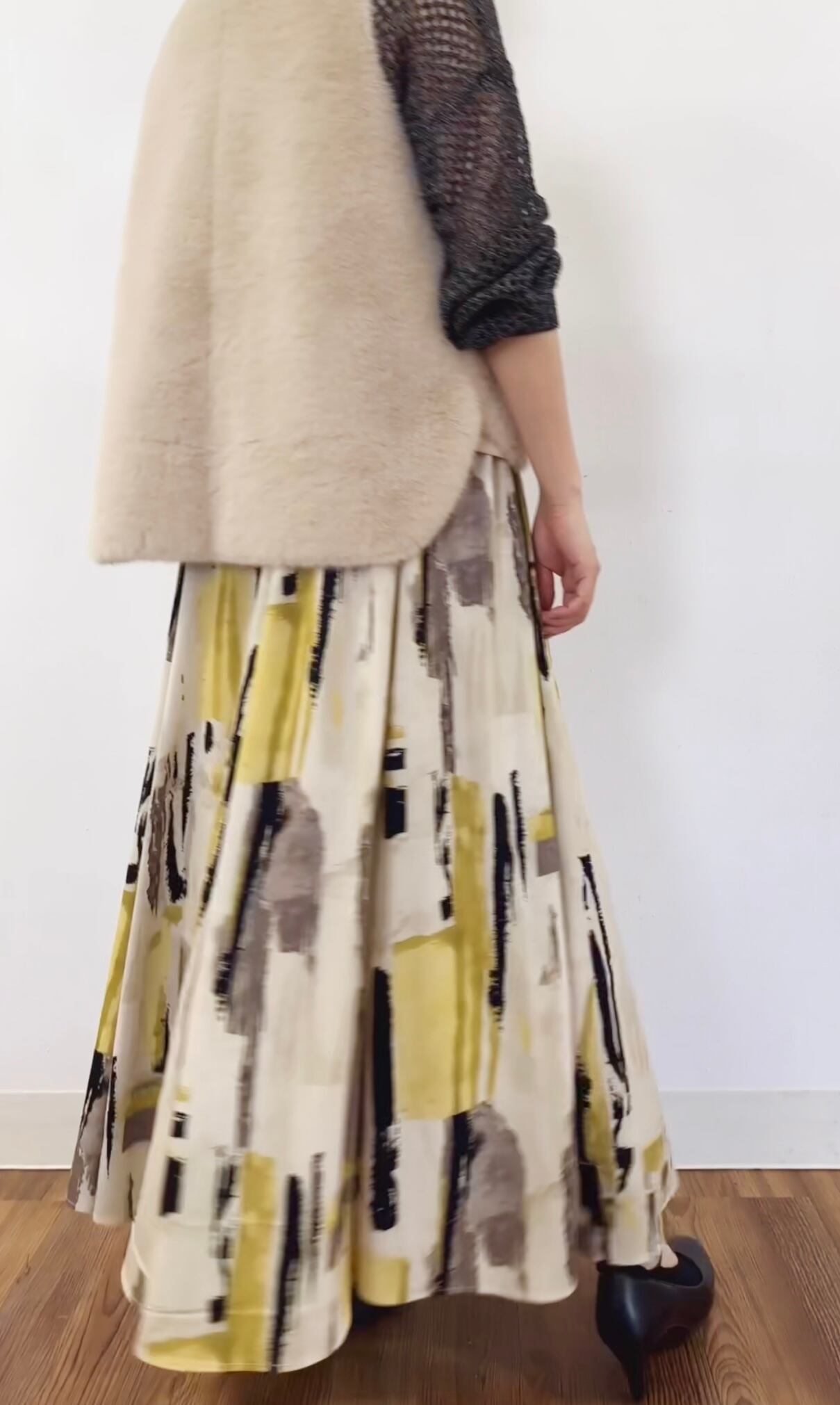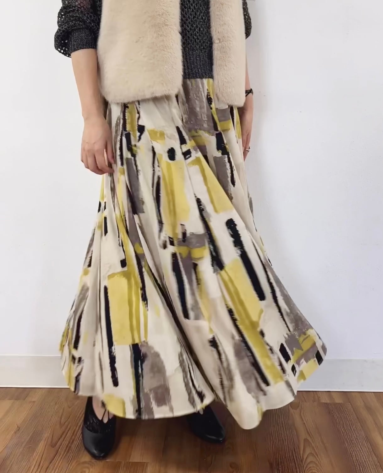 ● ペイント柄フレアスカートは、個性的なデザインが魅力の一着。鮮やかなペイント柄が施されており、シンプルなトップスと組み合わせることでスタイルが引き立ちます。フレアシルエットは体型をカバーしつつ、動きやすさも兼ね備えています。ヒップが小さくスッキリ見えるモニーレさんの定番フレアスカートの形です♪ 軽やかなとろみ感のある素材感です✨