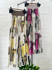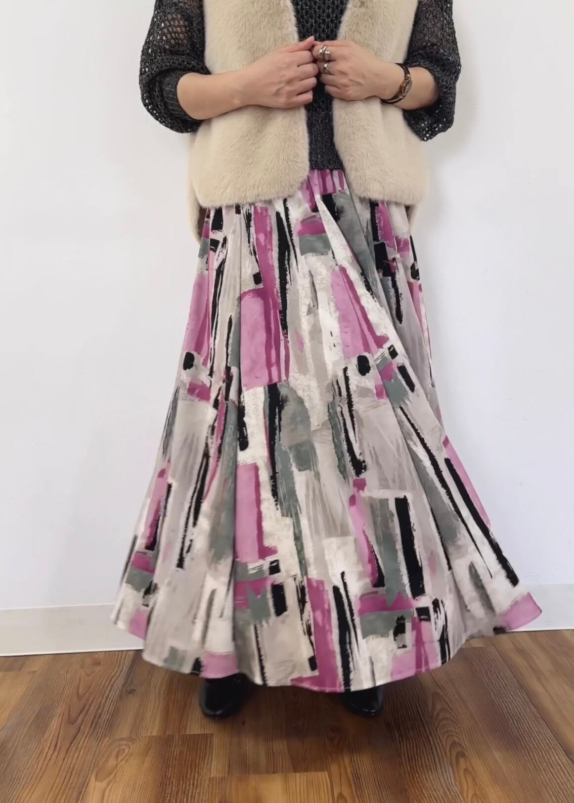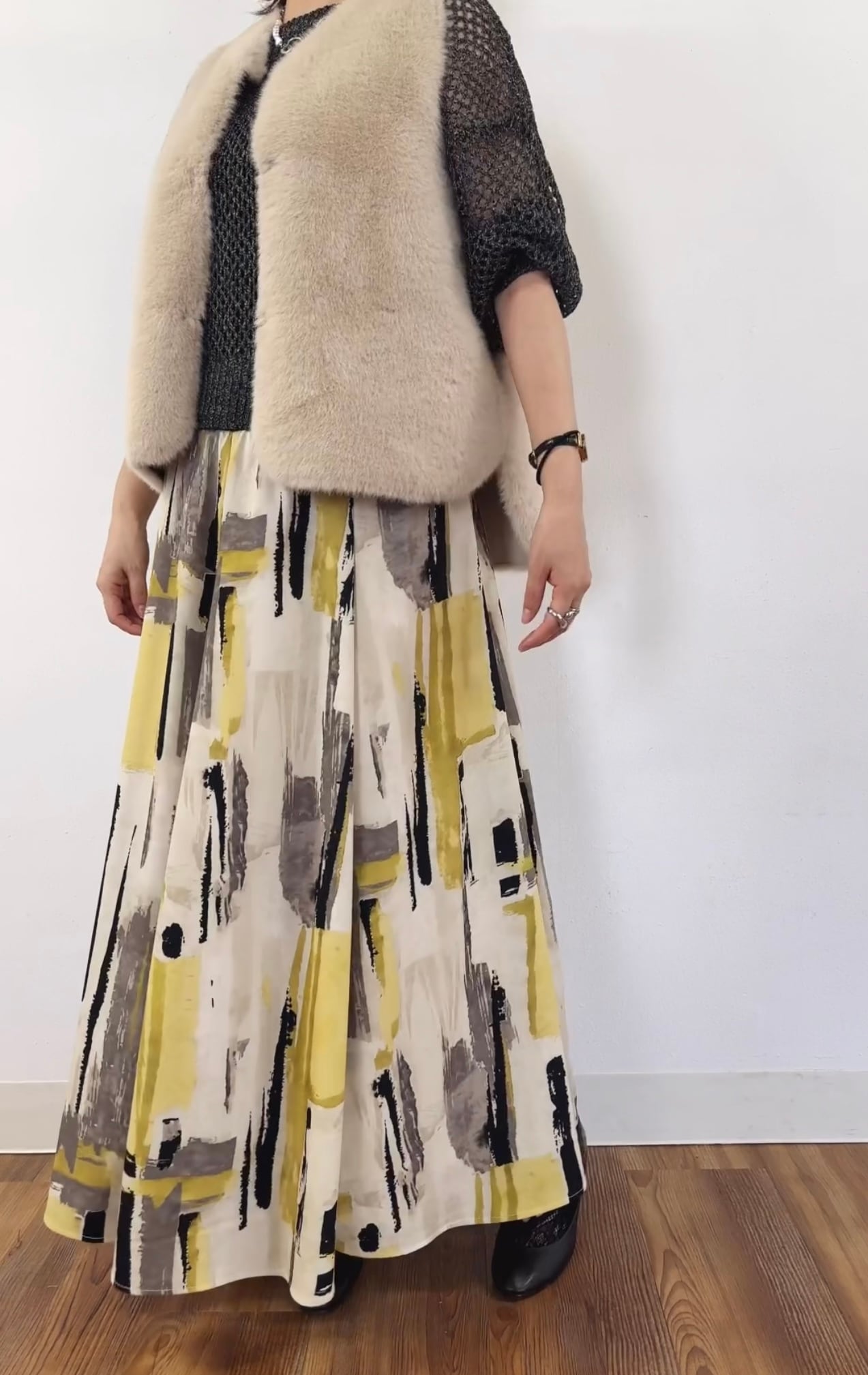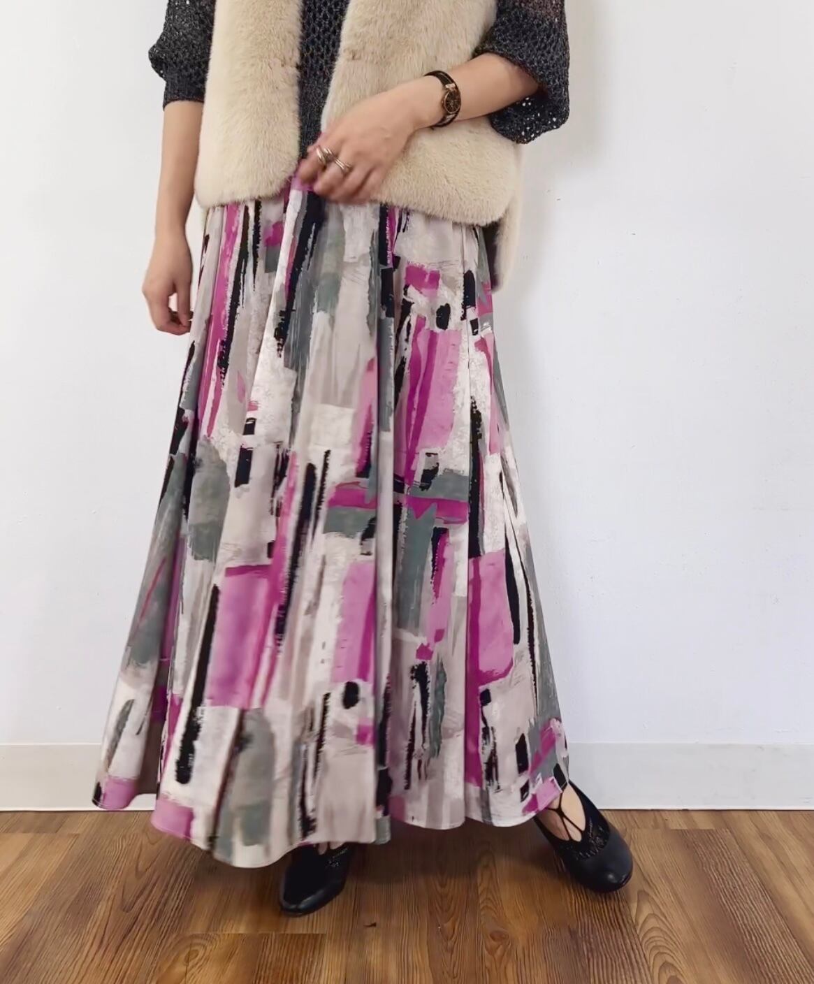 ● ペイント柄フレアスカートは、個性的なデザインが魅力の一着。鮮やかなペイント柄が施されており、シンプルなトップスと組み合わせることでスタイルが引き立ちます。フレアシルエットは体型をカバーしつつ、動きやすさも兼ね備えています。ヒップが小さくスッキリ見えるモニーレさんの定番フレアスカートの形です♪ 軽やかなとろみ感のある素材感です✨