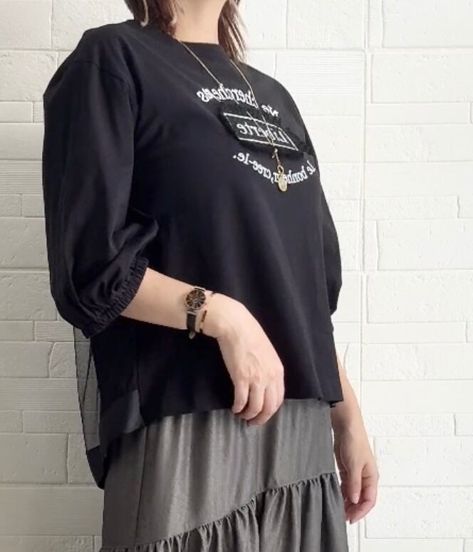 後ろ見頃にもチュール重ねがあしらってあり、遊び心のあるロンTとなっています✨1枚で来ても360度何処からみても可愛いロンT間違いなしです✨袖口はゴム仕様の7部袖です、ゴムで袖口の長さの調整も楽々して頂けます✨