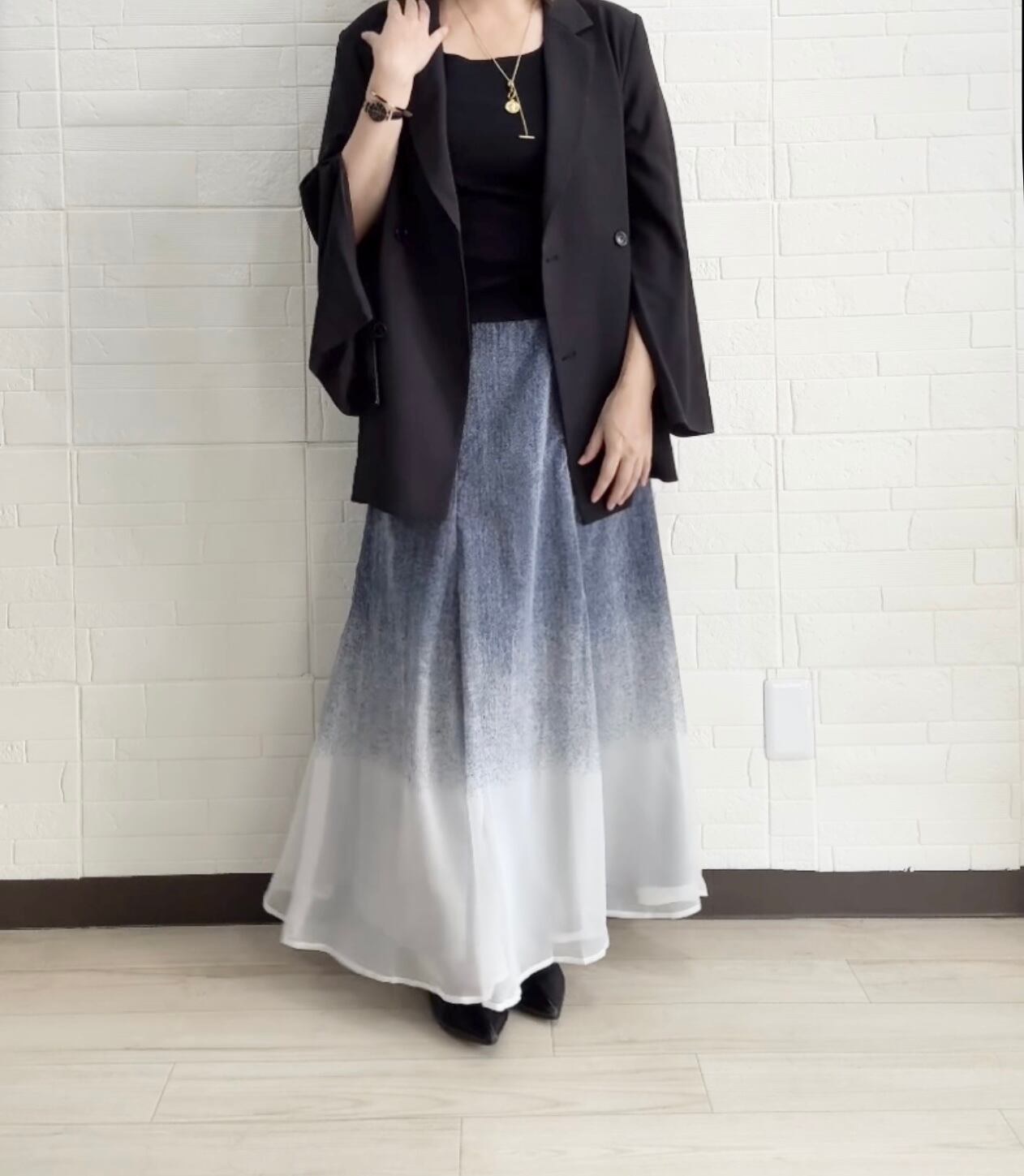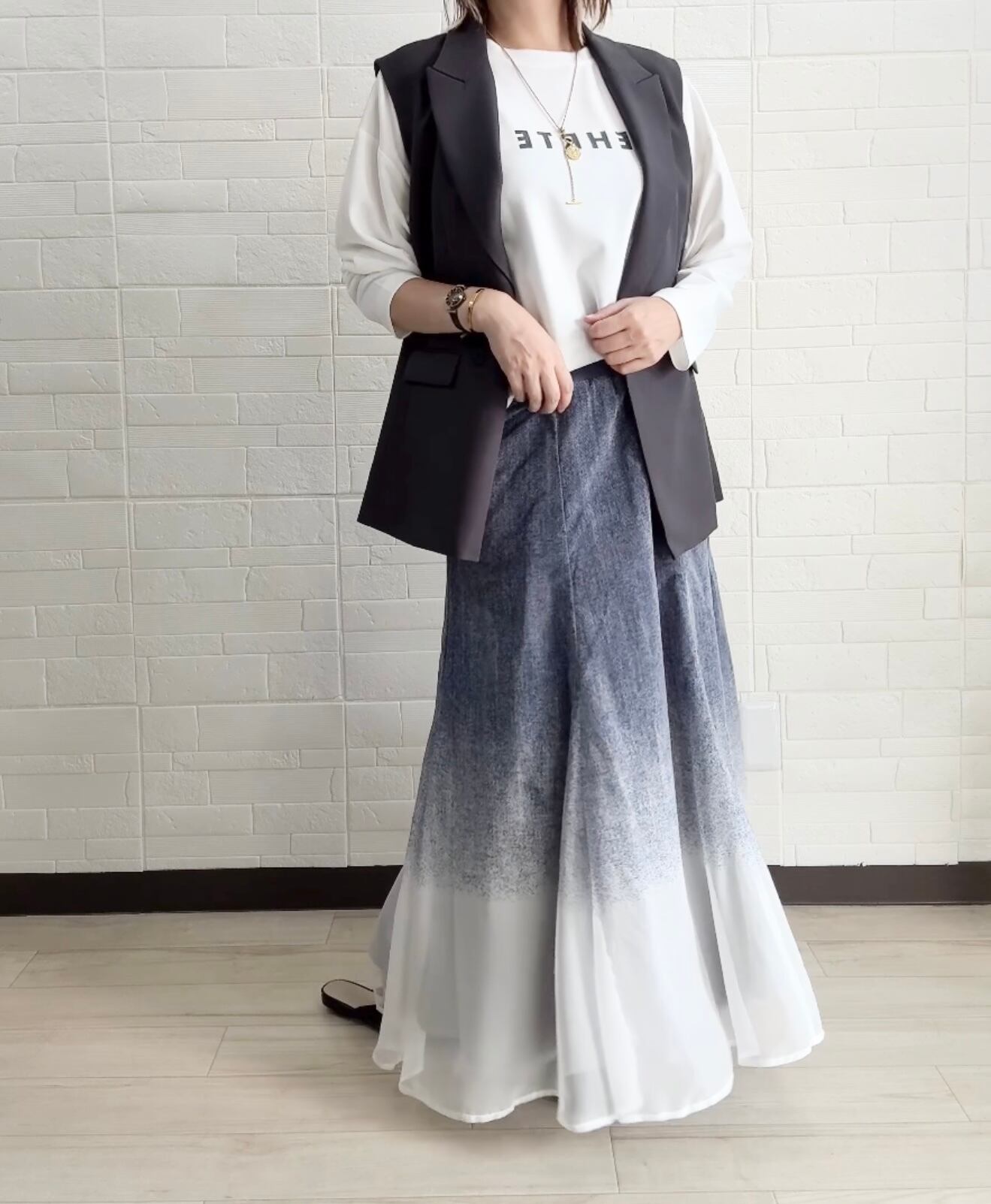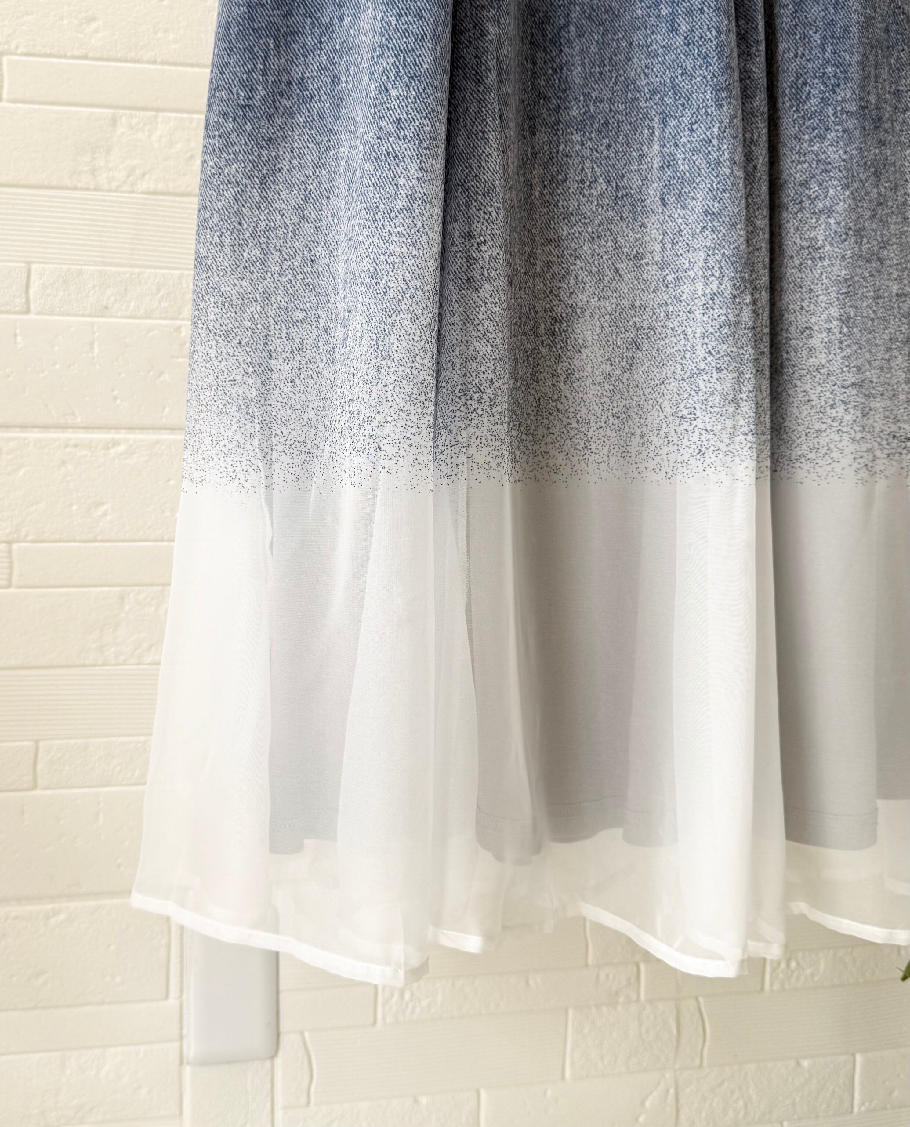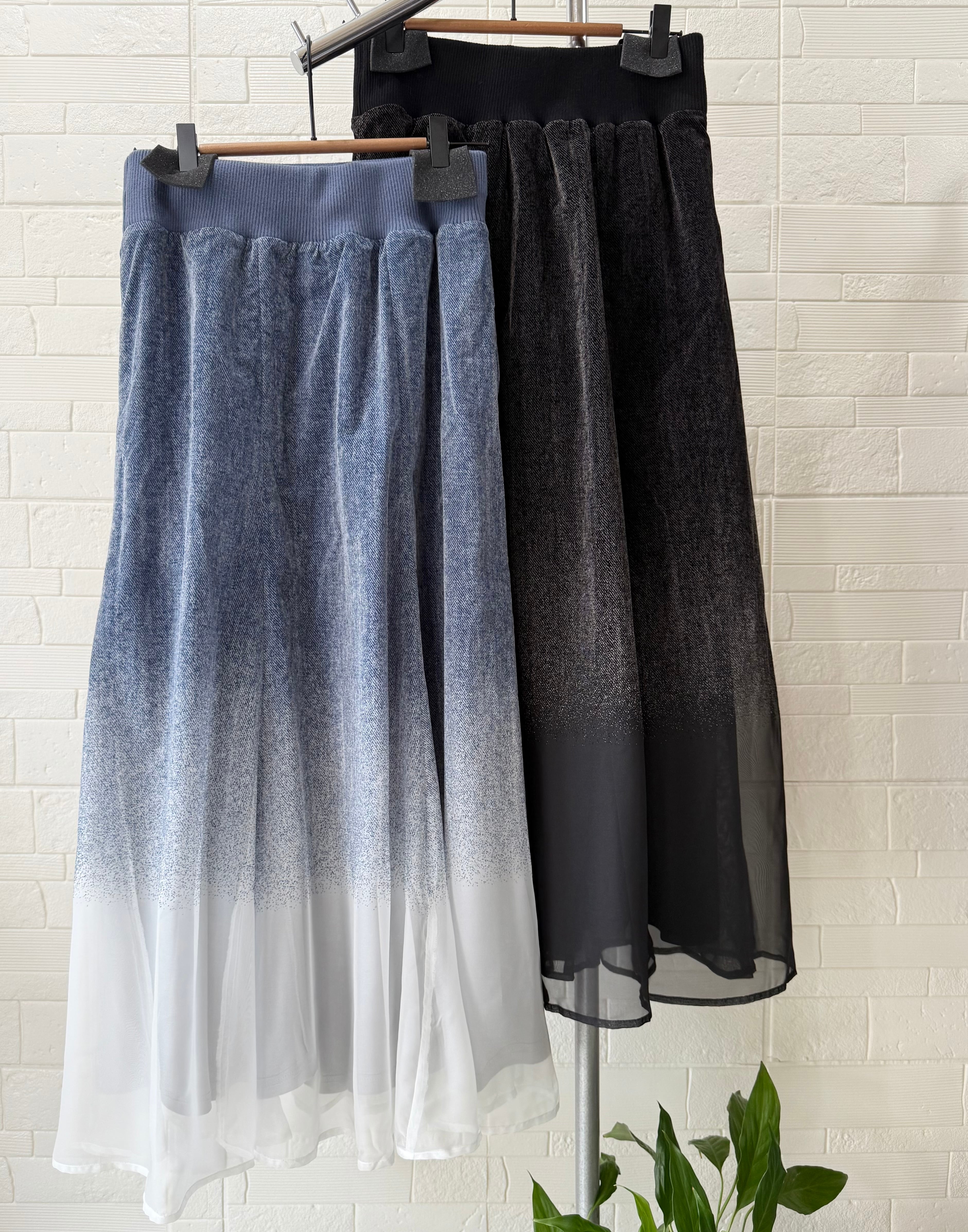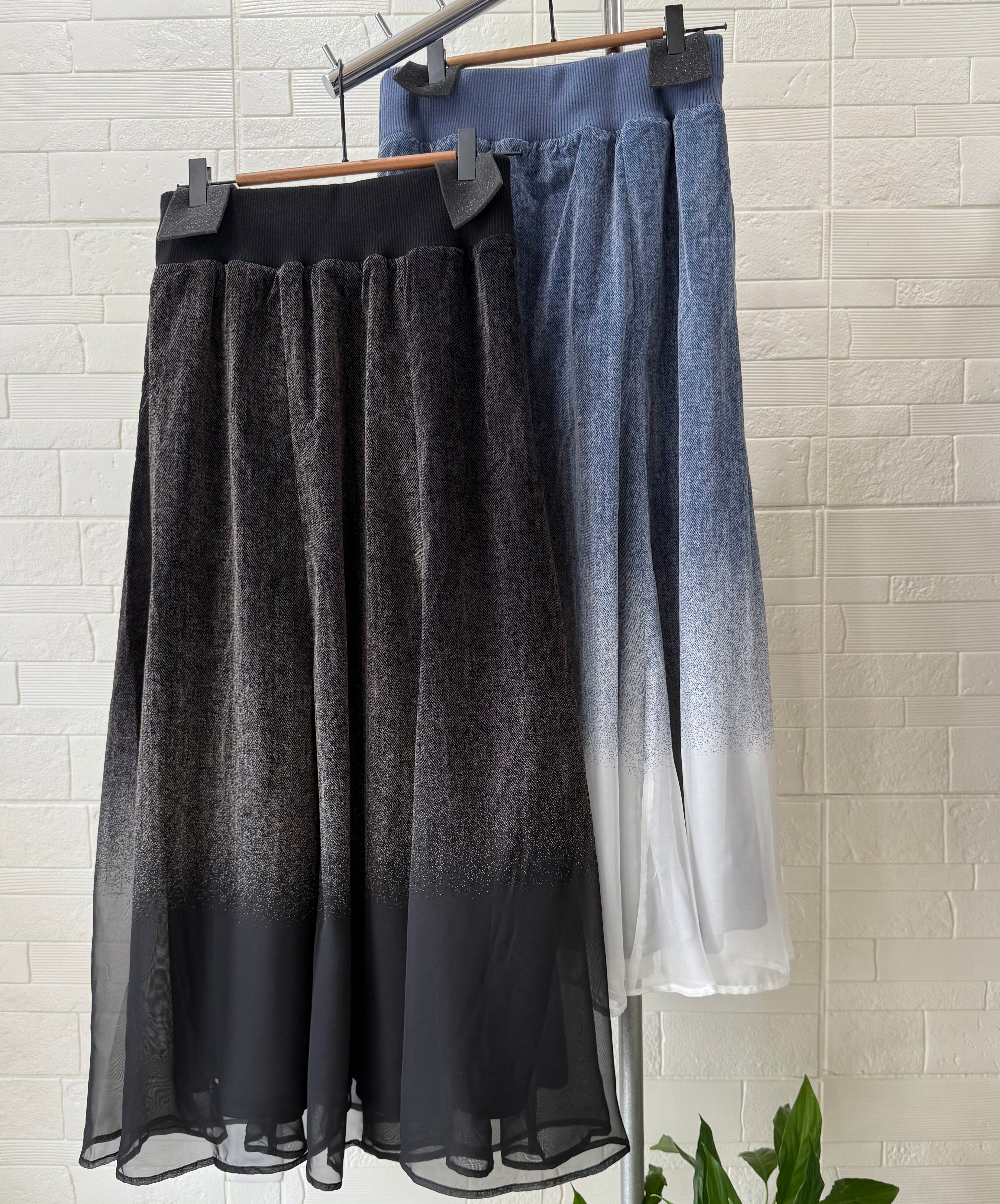 ● デニム風のフロッキープリントで美しいグラデーションデザインが魅力のスカートです!どんなトップスにも合わせやすくキレイめなカジュアルに最適です。軽やかな素材感で、ウエストのリブは締め付け感がなく快適な着心地です!
