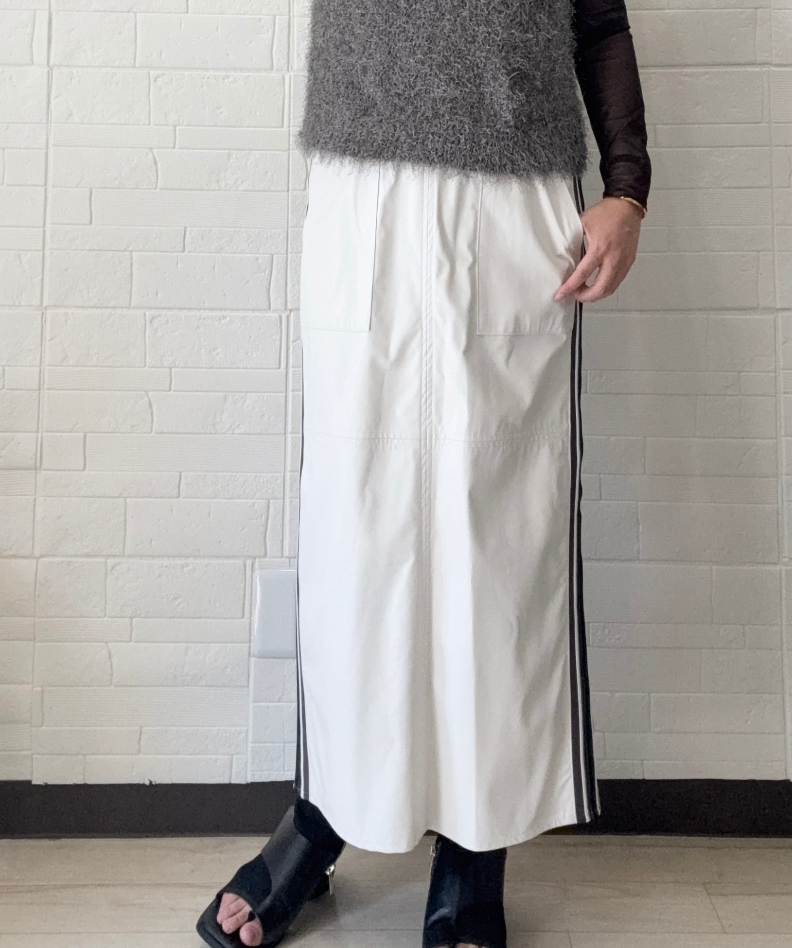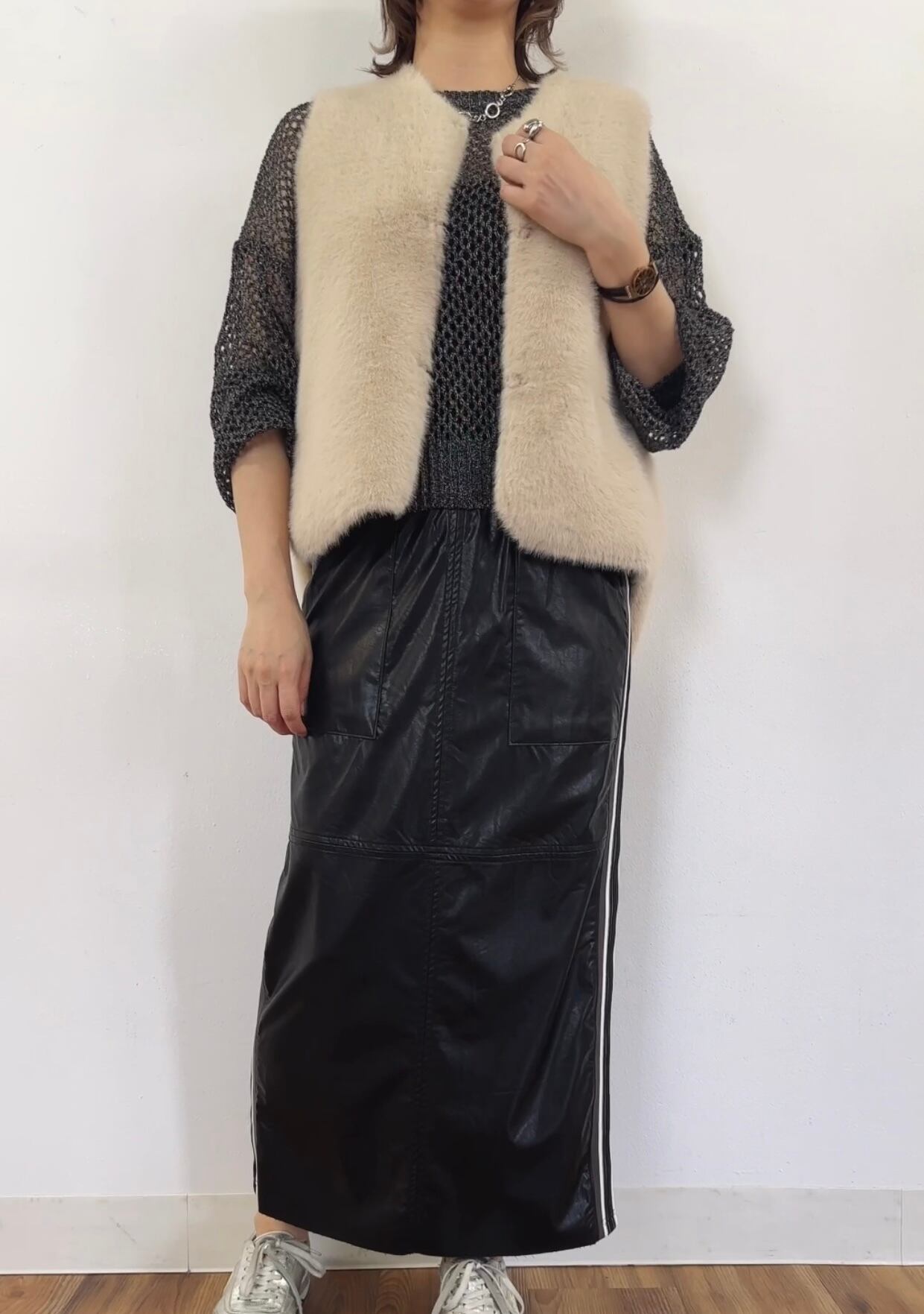 ● フェイクレザー&ソフトベッチンサイドラインタイトスカートは、モダンでスタイリッシュなデザインが特徴のアイテムです!しなやかなフェイクレザーと柔らかでストレッチ性抜群のベッチン素材のコンビネーションが、女性らしいシルエットを美しく引き立てます。サイドに施されたラインがアクセントとなり、カジュアルなコーディネートにも洗練された印象をプラス。シーンを選ばず、オフィスからデートまで、様々なスタイルに対応できる一枚です✨