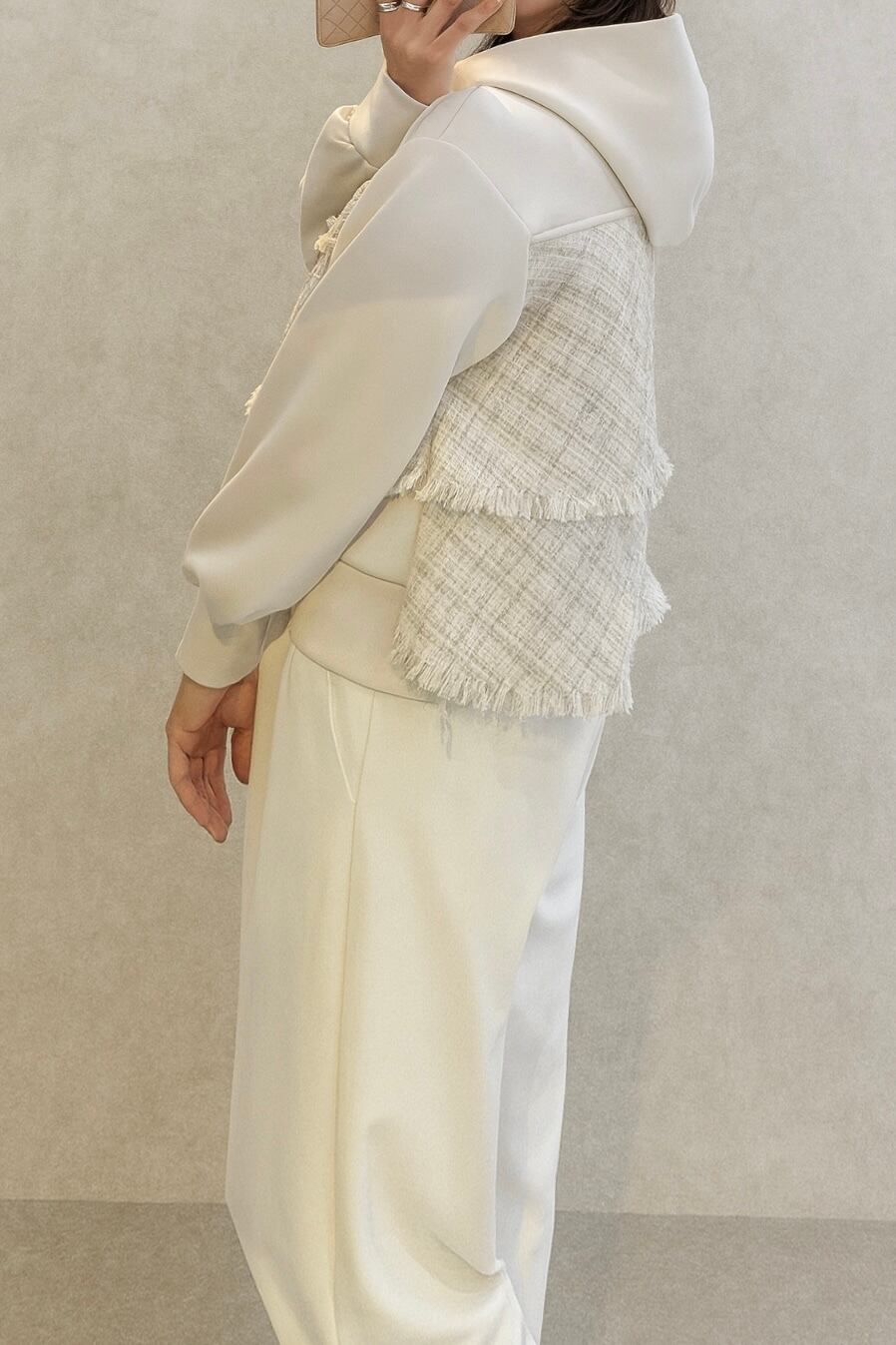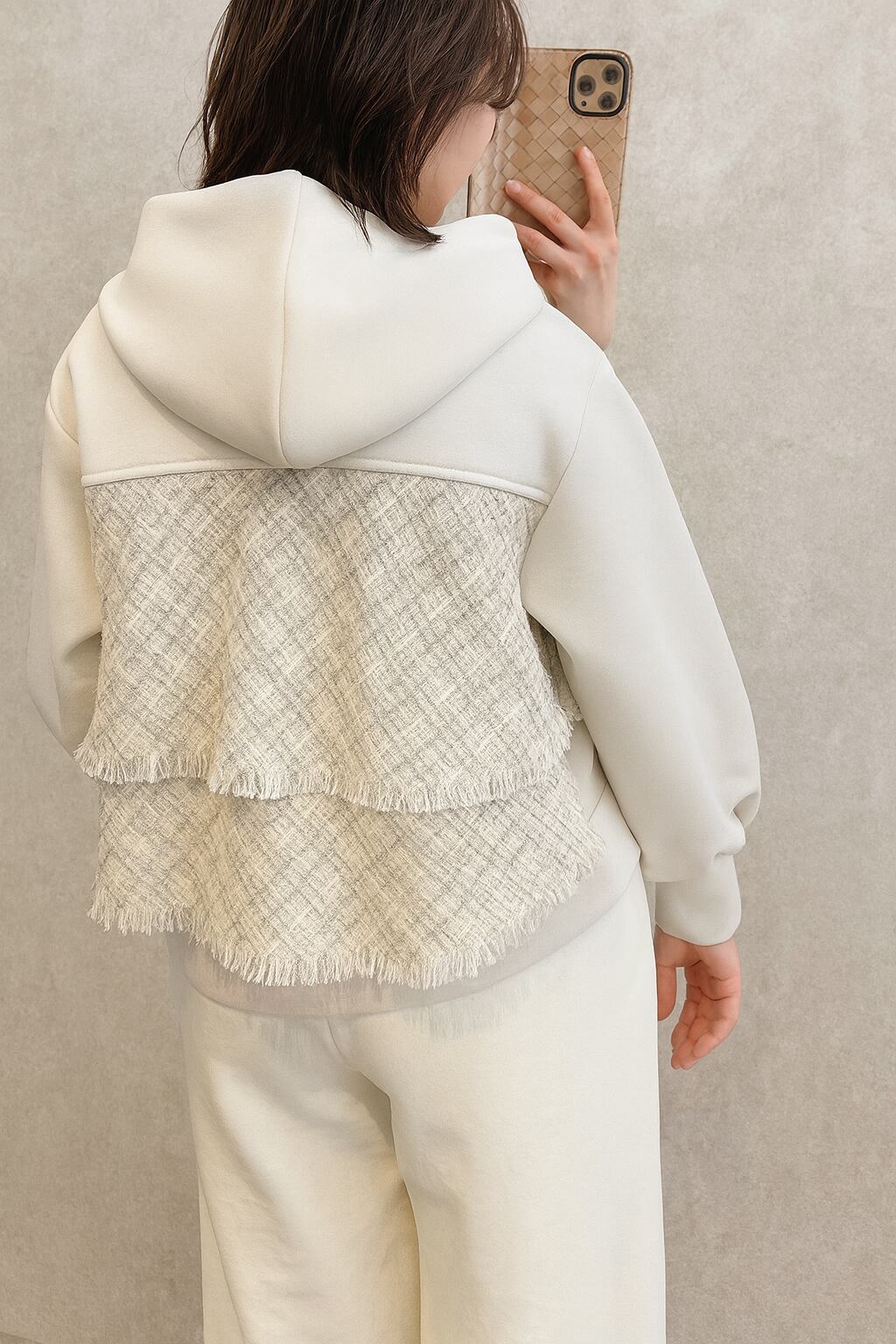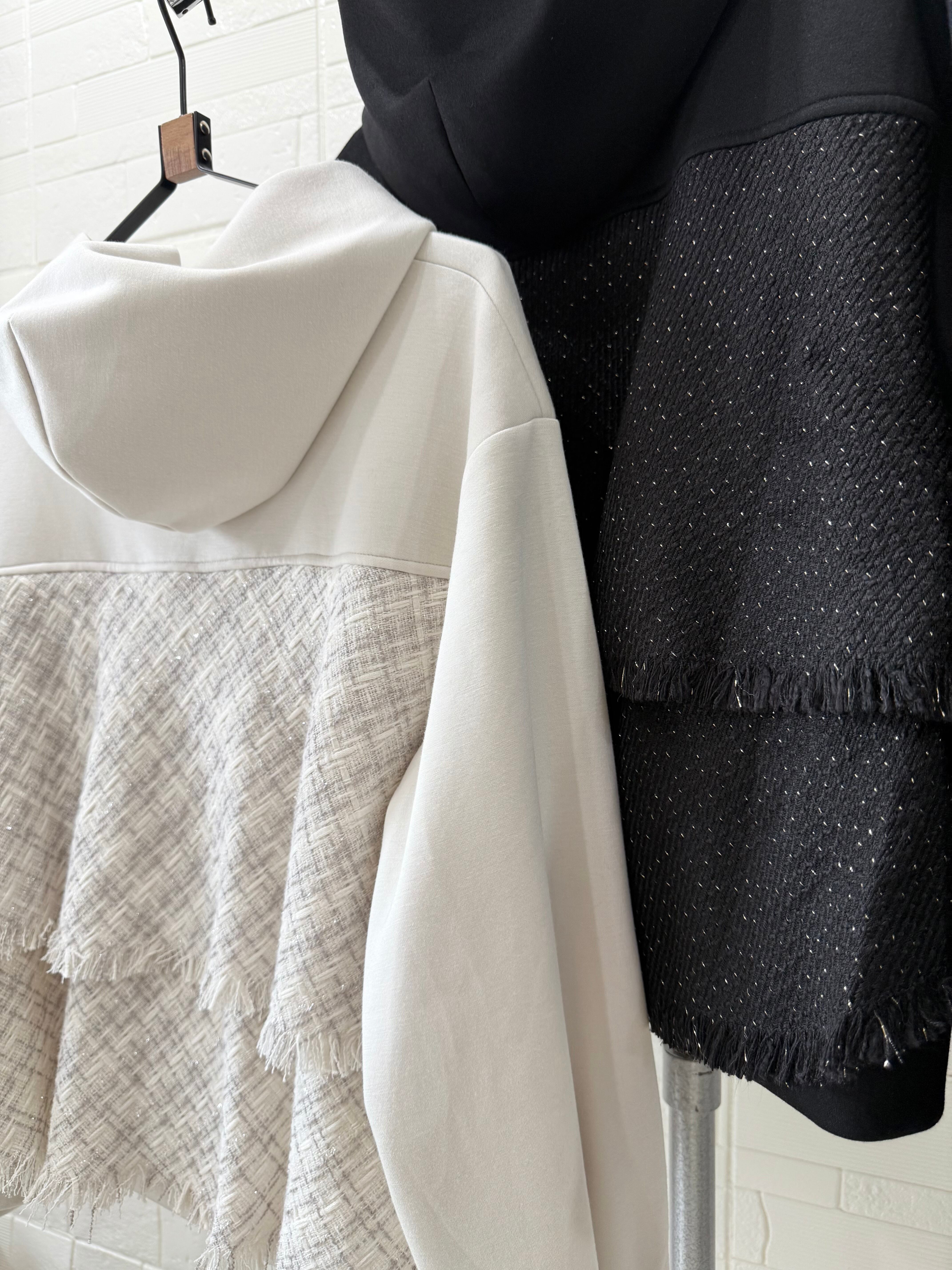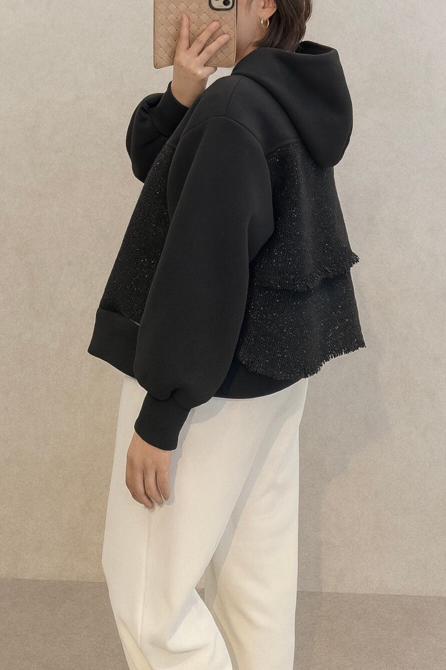 ●ツイードコンビパーカーは、去年も大好評で今年もリストア✨カジュアルさと上品さを兼ね備えた優れたデザインが魅力のアイテムです!軽くてほんのり光沢糸も入り上品にキラキラしたツイード部分がしっかりとした印象を与え、フード付きのパーカーがカジュアルな気軽さをプラス。もちっとした柔らかな着心地で、動きやすさも考慮されています。デイリーコーディネートに最適です✨存在感のあるデザインで主役のアイテムに✨