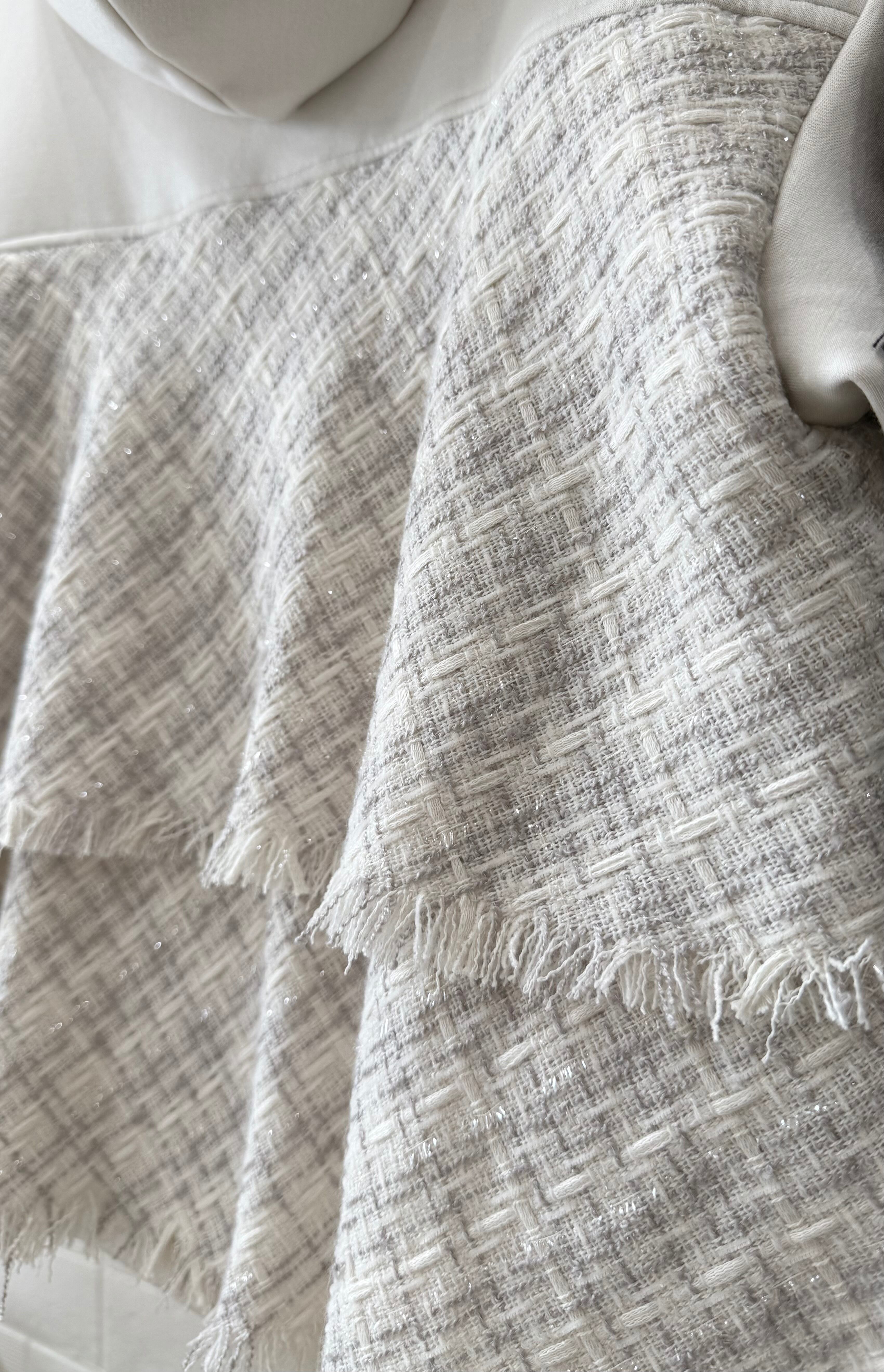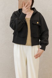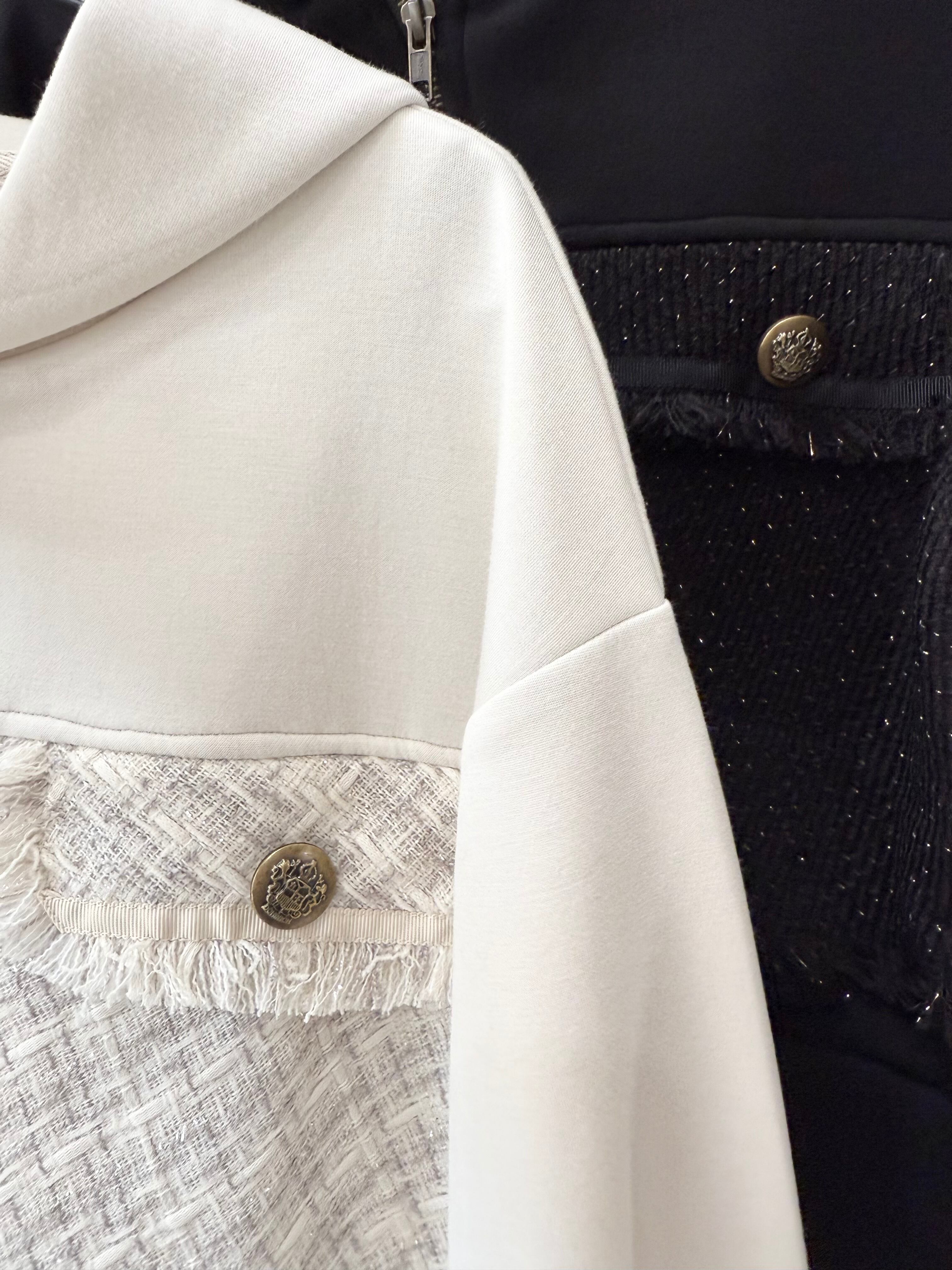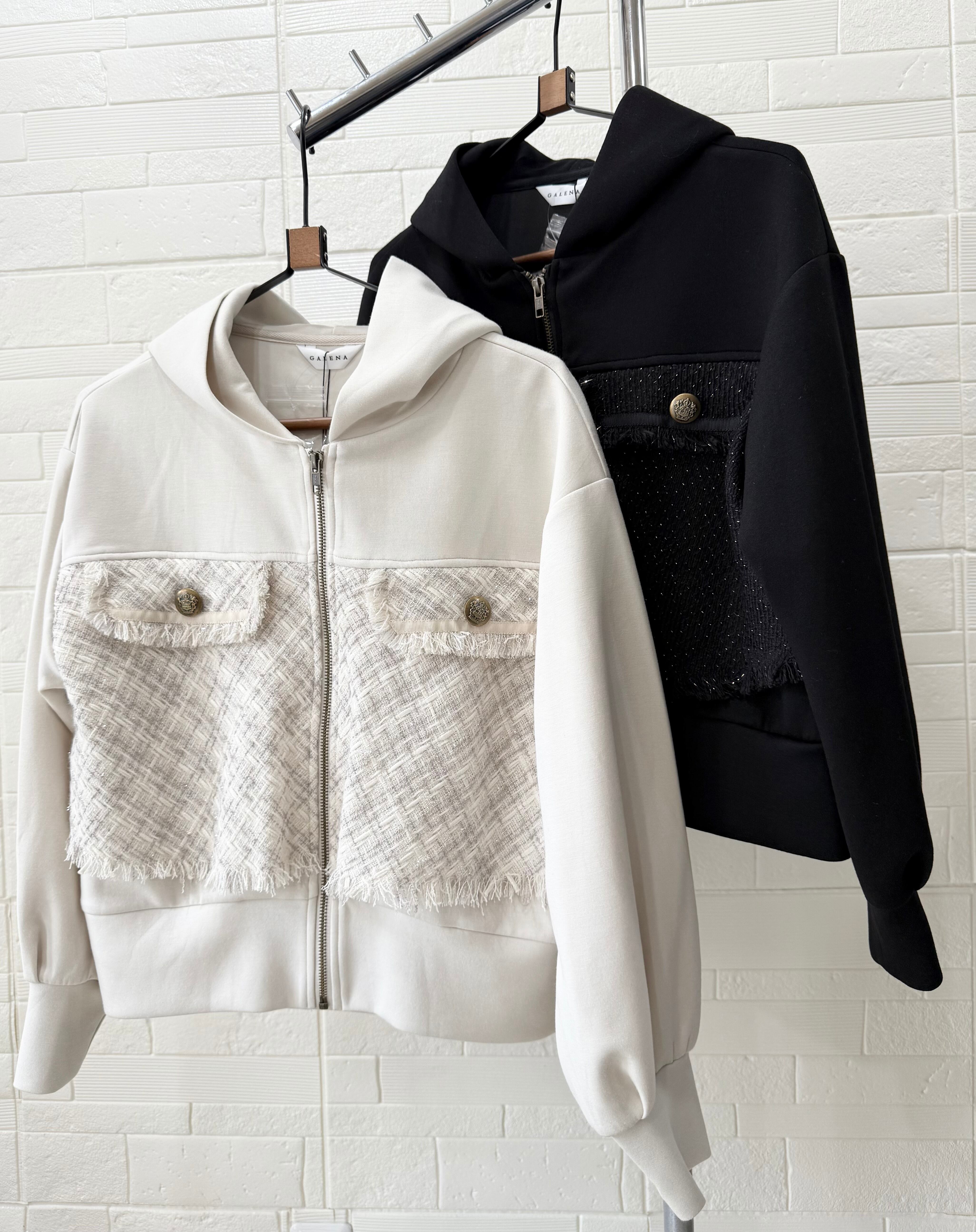 ●ツイードコンビパーカーは、去年も大好評で今年もリストア✨カジュアルさと上品さを兼ね備えた優れたデザインが魅力のアイテムです!軽くてほんのり光沢糸も入り上品にキラキラしたツイード部分がしっかりとした印象を与え、フード付きのパーカーがカジュアルな気軽さをプラス。もちっとした柔らかな着心地で、動きやすさも考慮されています。デイリーコーディネートに最適です✨存在感のあるデザインで主役のアイテムに✨