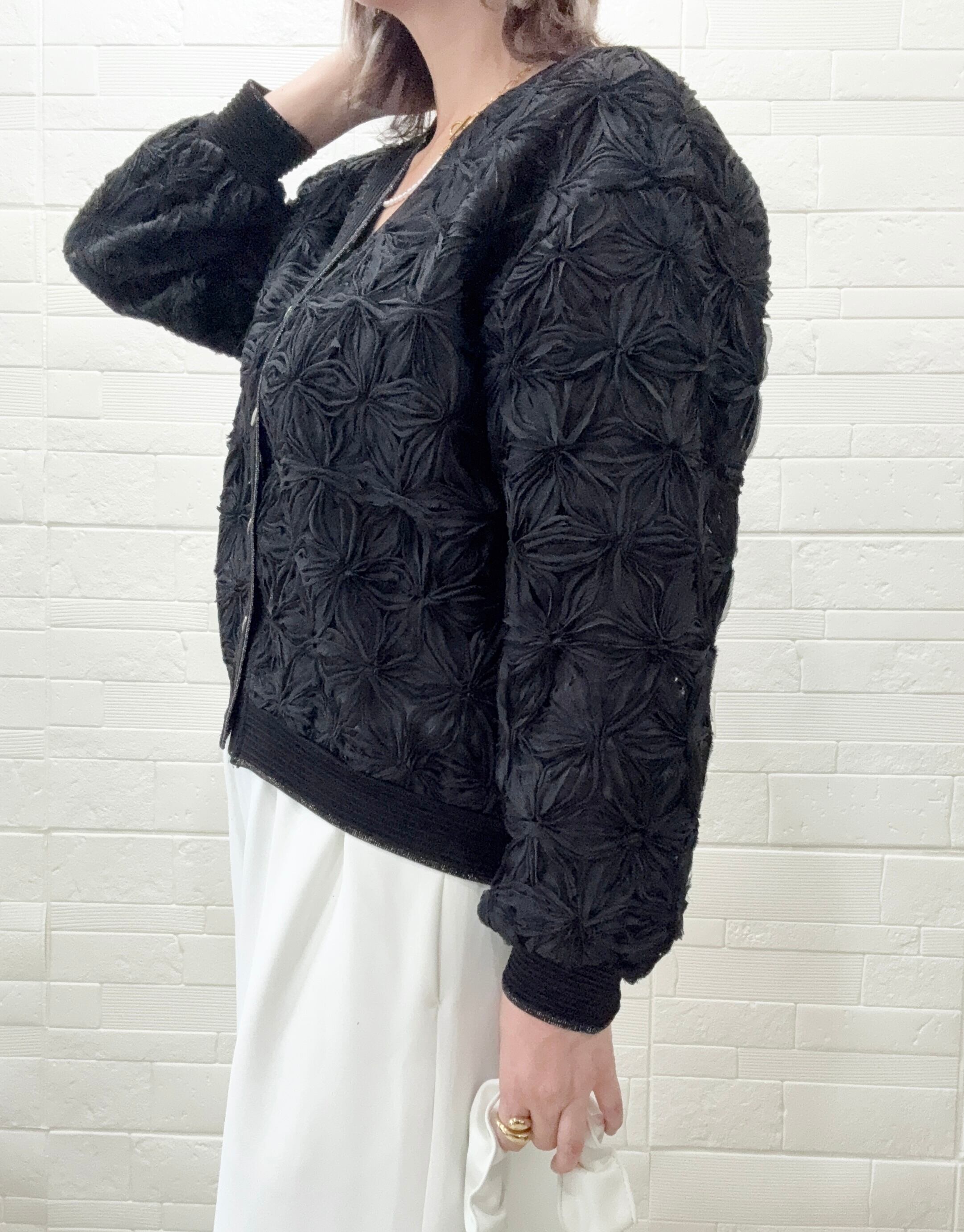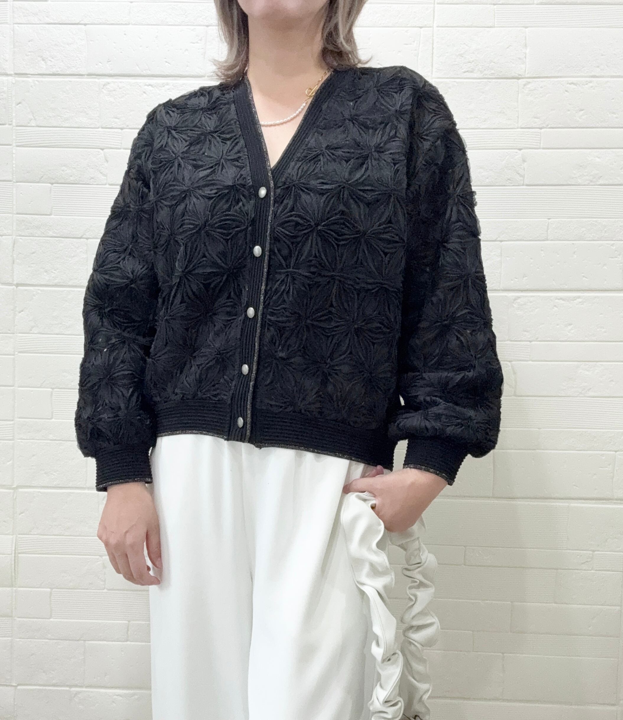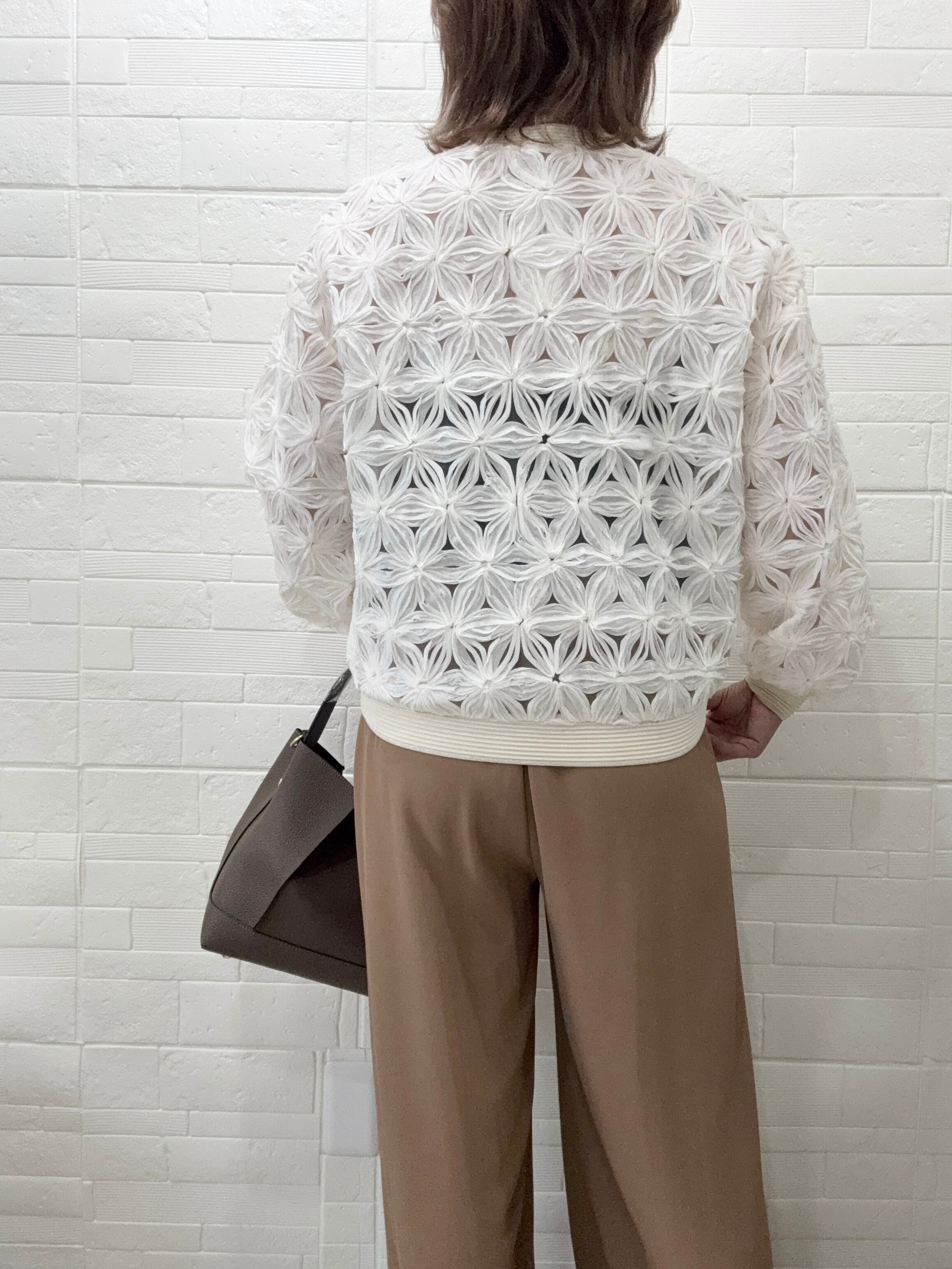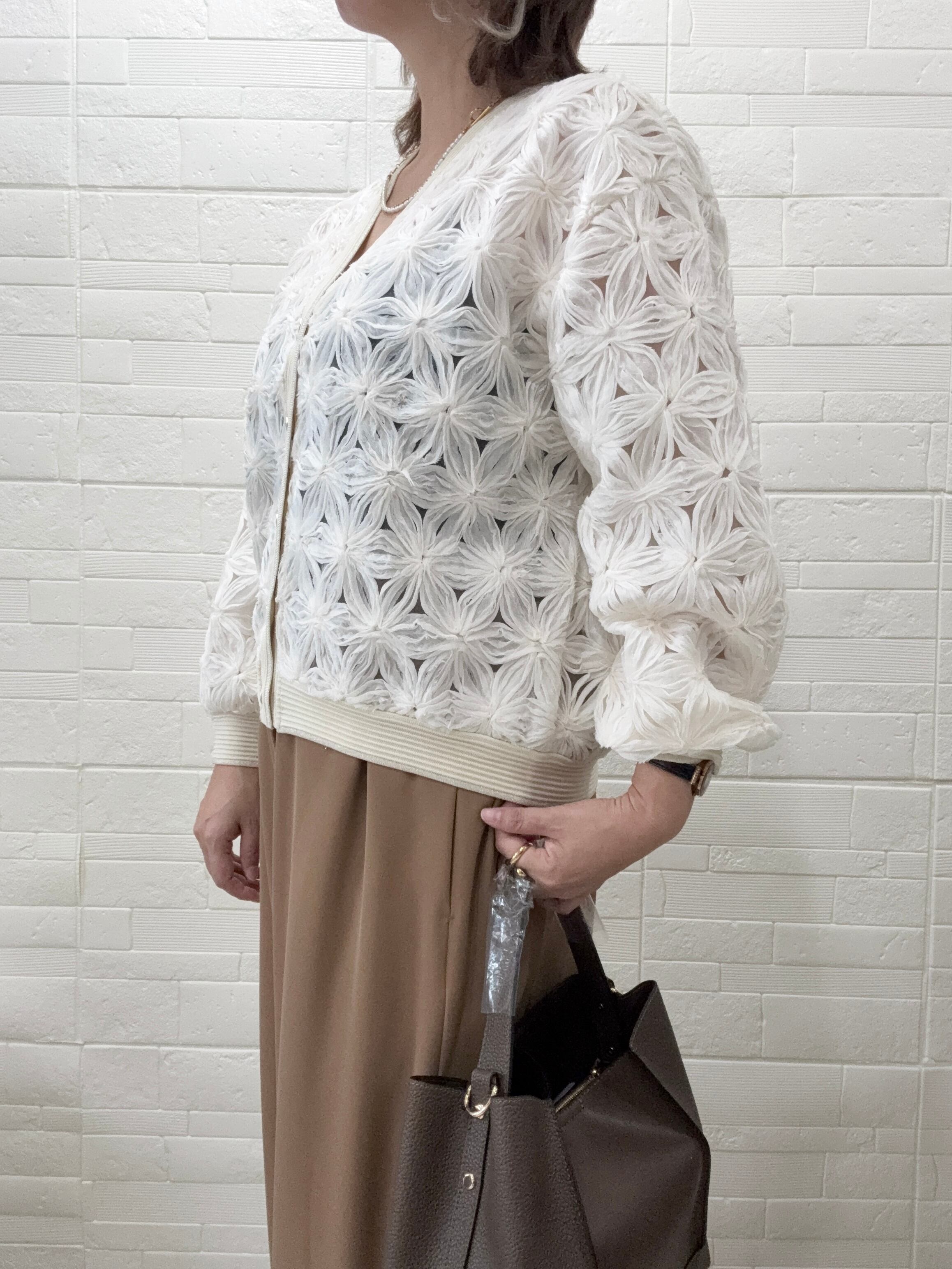● 華やかなレース素材が際立つアイテムです!エレガントな花が散りばめられており、特別な場面でも映えるデザインとなっています。レースの柔らかな質感は女性らしさを引き立て、季節を問わず楽しめる一着です。レース部分はシフォン素材を使用しているため、優雅な印象を与えます。凹凸感のある素材感はより一層オシャレが引立ちます✨