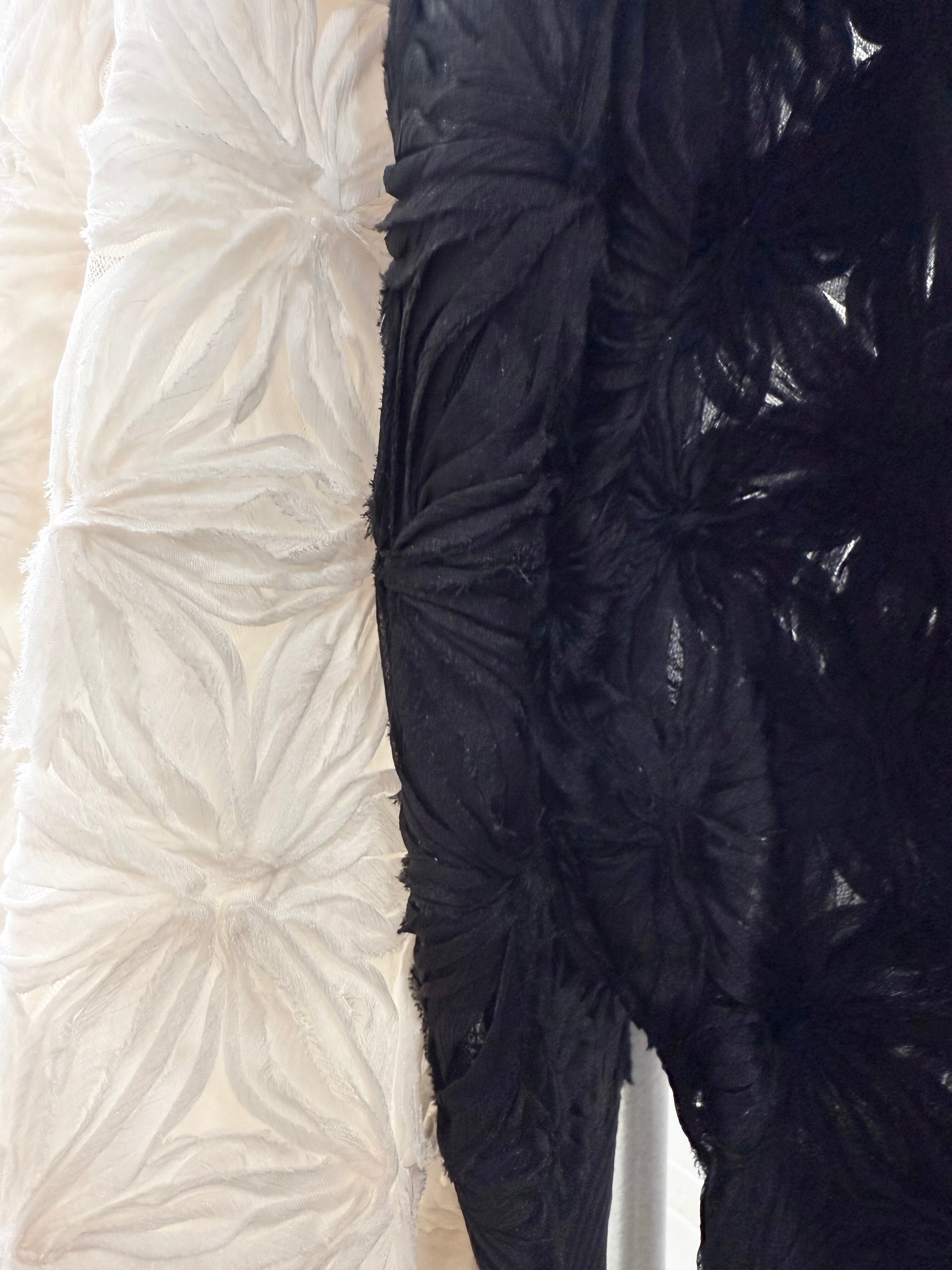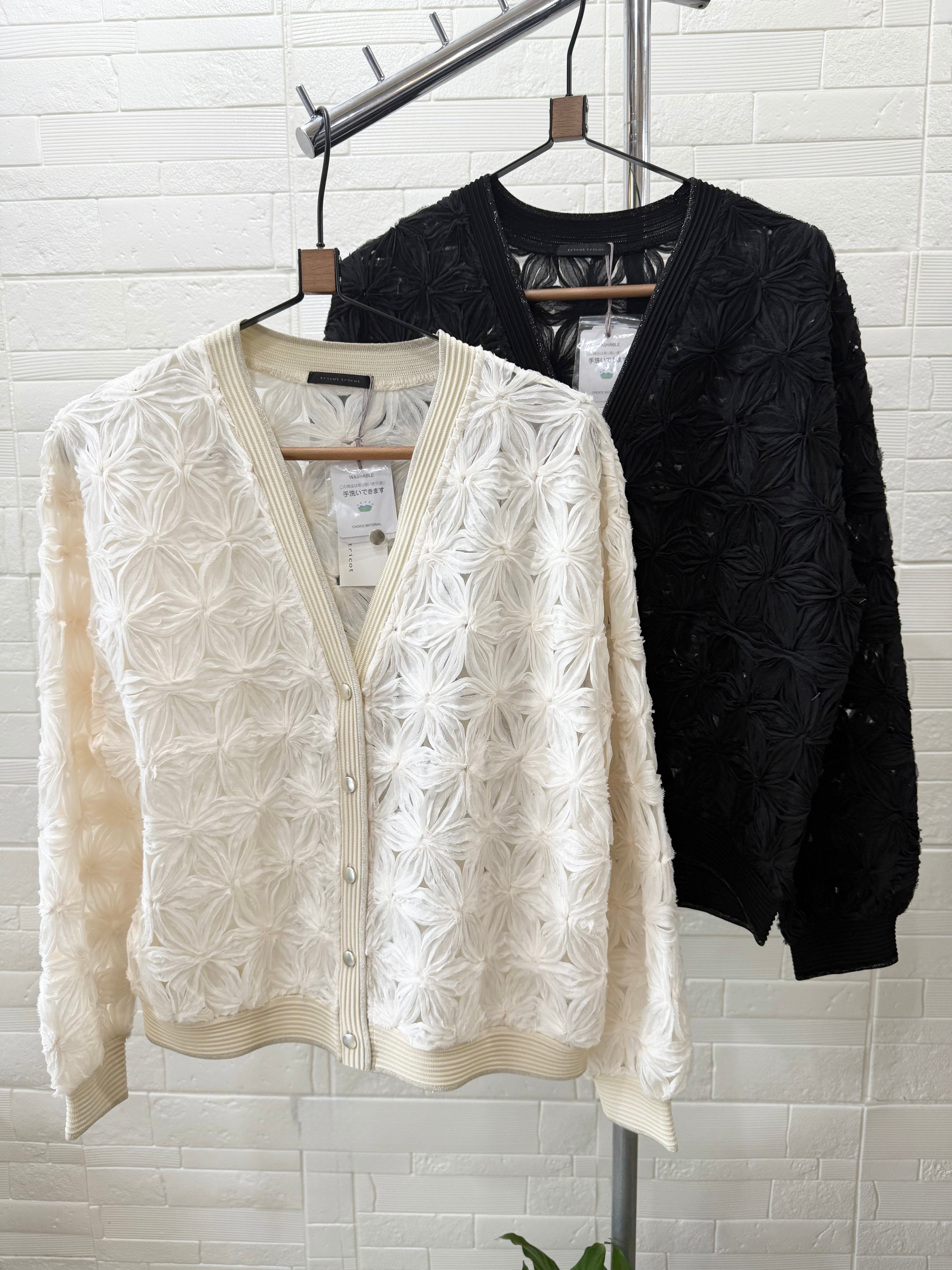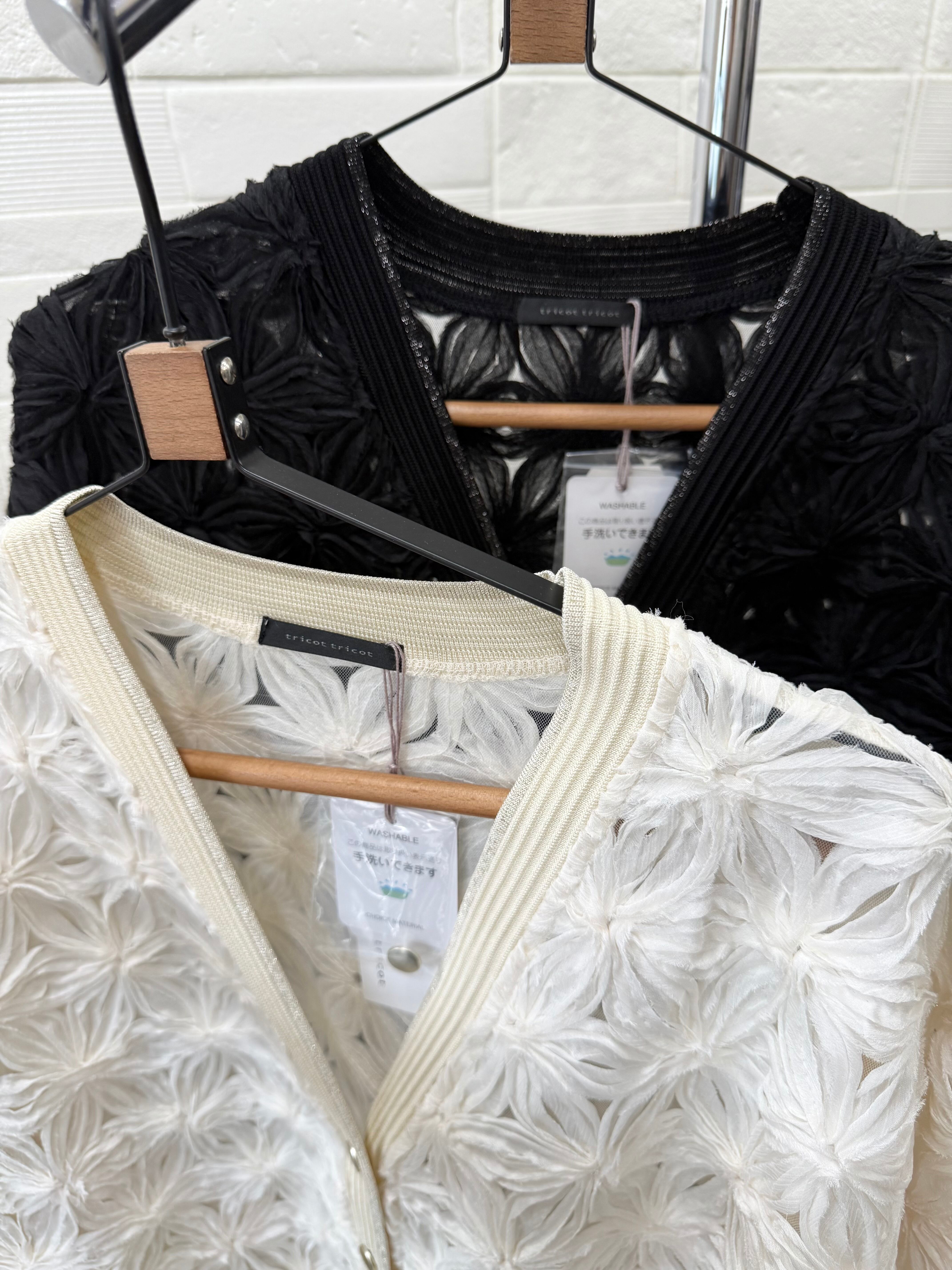 ● 華やかなレース素材が際立つアイテムです!エレガントな花が散りばめられており、特別な場面でも映えるデザインとなっています。レースの柔らかな質感は女性らしさを引き立て、季節を問わず楽しめる一着です。レース部分はシフォン素材を使用しているため、優雅な印象を与えます。凹凸感のある素材感はより一層オシャレが引立ちます✨