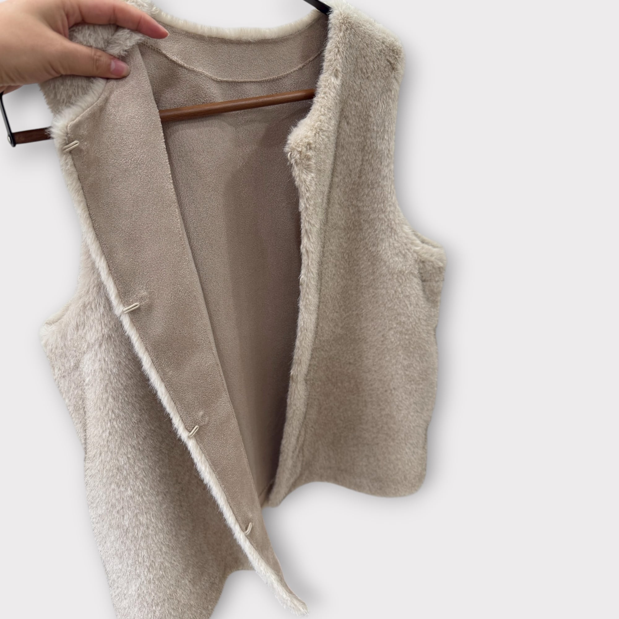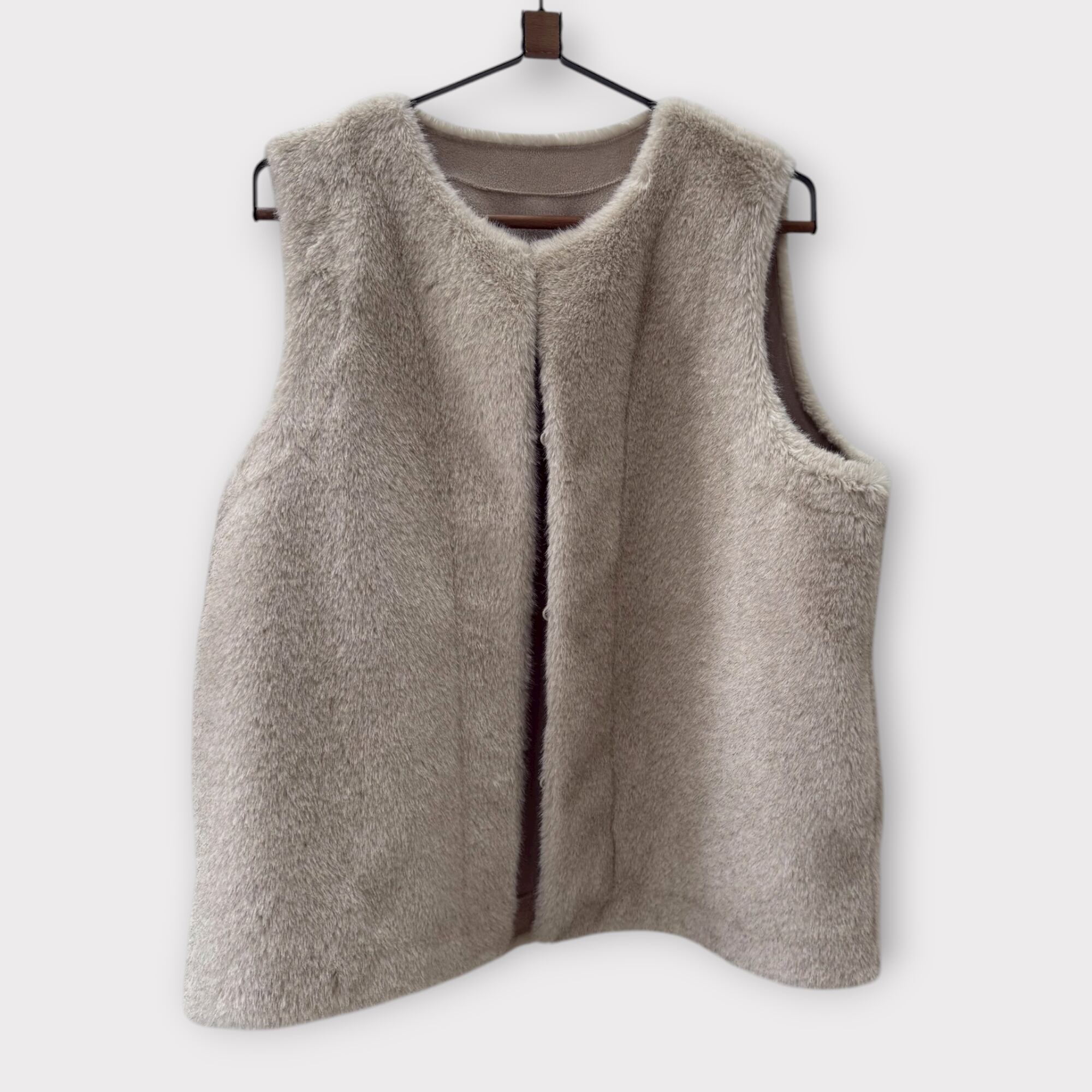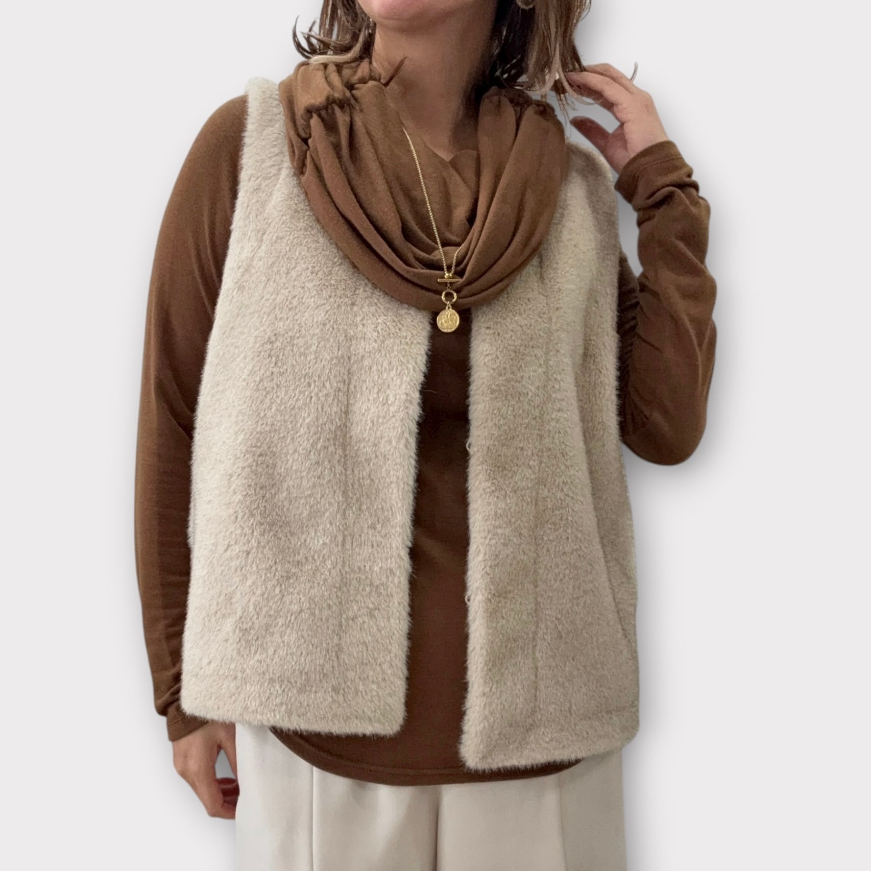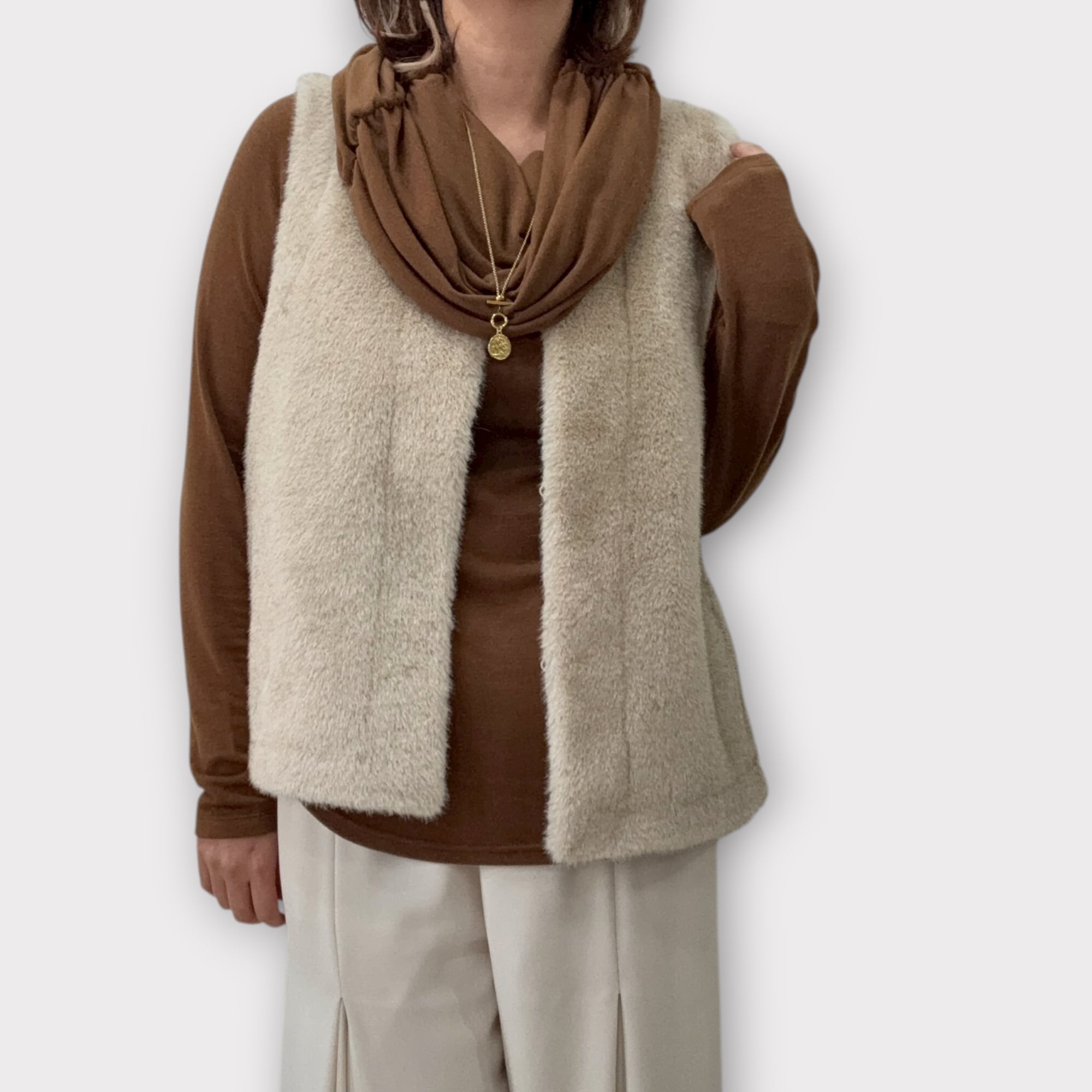 ● スタイリッシュな印象のファーベストは、インナーとしてもアウターとしても活躍する万能アイテムです✨着膨れしない厚みが魅力です。 ふんわりとしたファーの質感は、温かみがありながらも軽やかで、長時間の着用でもストレスを感じません。シンプルなベージュカラーは、どんなコーディネートにも合わせやすく、カジュアルスタイルから少しフォーマルなシーンまで幅広くコーディネートが楽しめます。ラビット調の毛足の長さで毛先1〜2mmはブラウンカラーが付いていて高級感もでます。