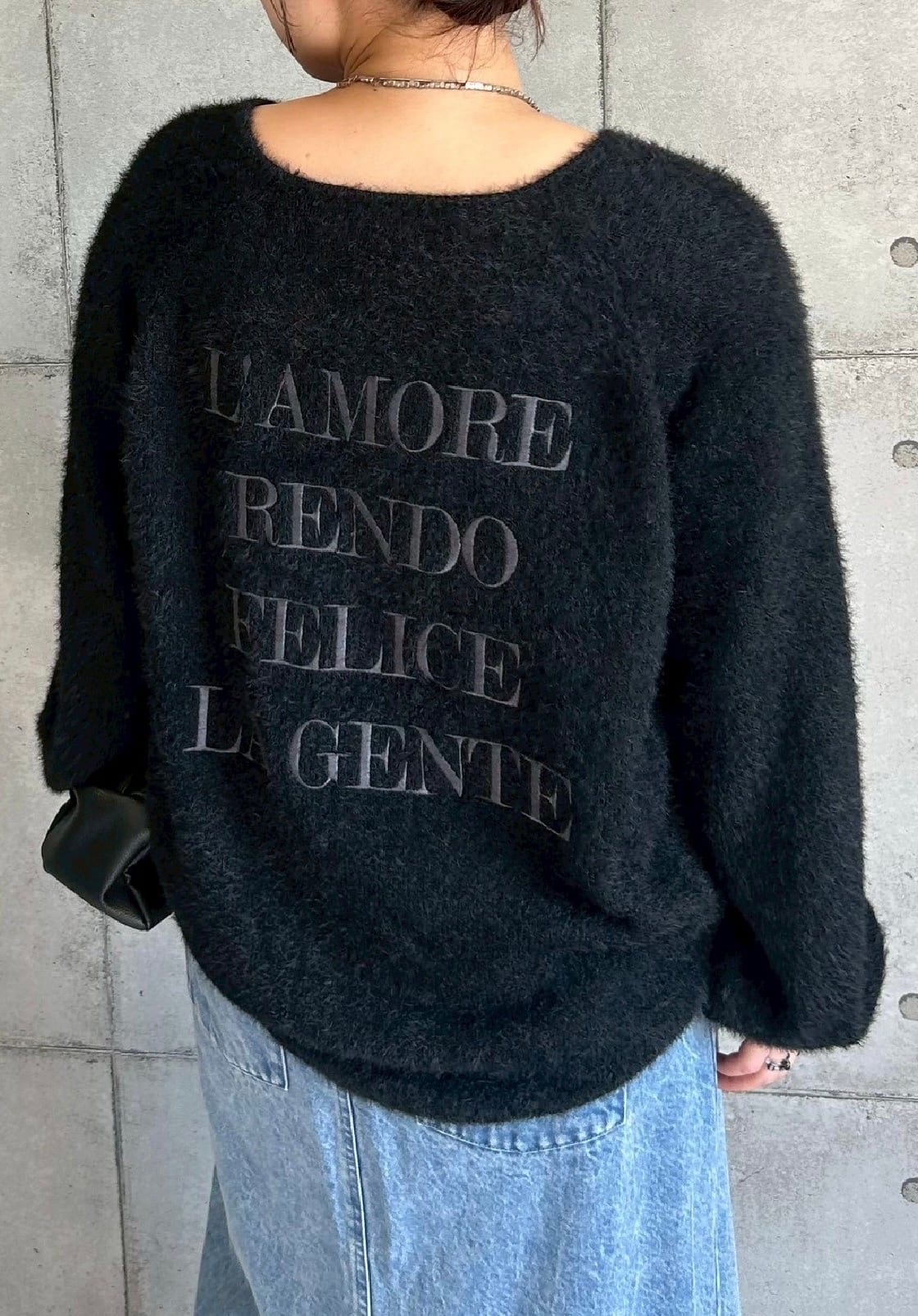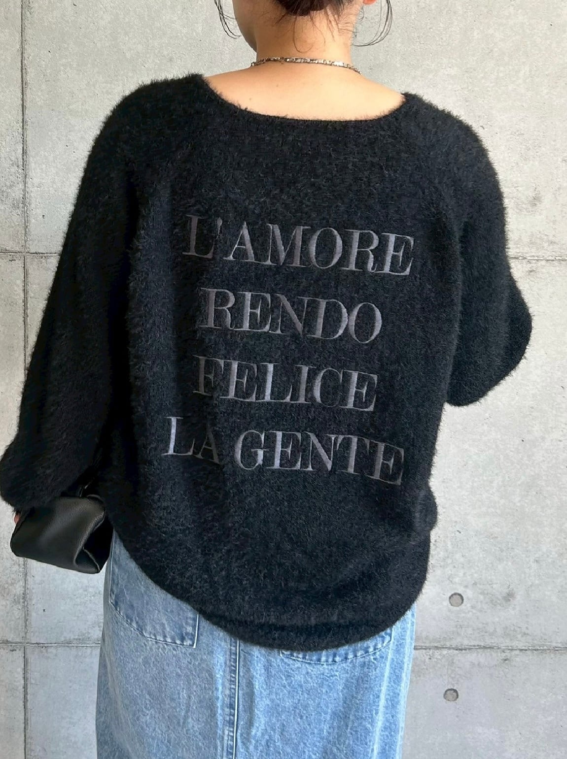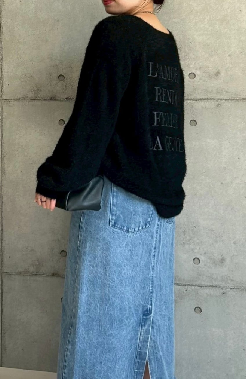 ● 人気のシャギーニットが今年もアップデートして登場。今までのバックロゴ刺繍の字体とは変わり、エレガントな字体にすることでさらに上品な雰囲気になっています。着丈もヒップが隠れる長さあるデザインが落しいポイント。天中も広めにお作りしているので鎖骨が見え女性らしい着こなしが叶います。バックロゴは同色にすることでカジュアルすぎない雰囲気に。