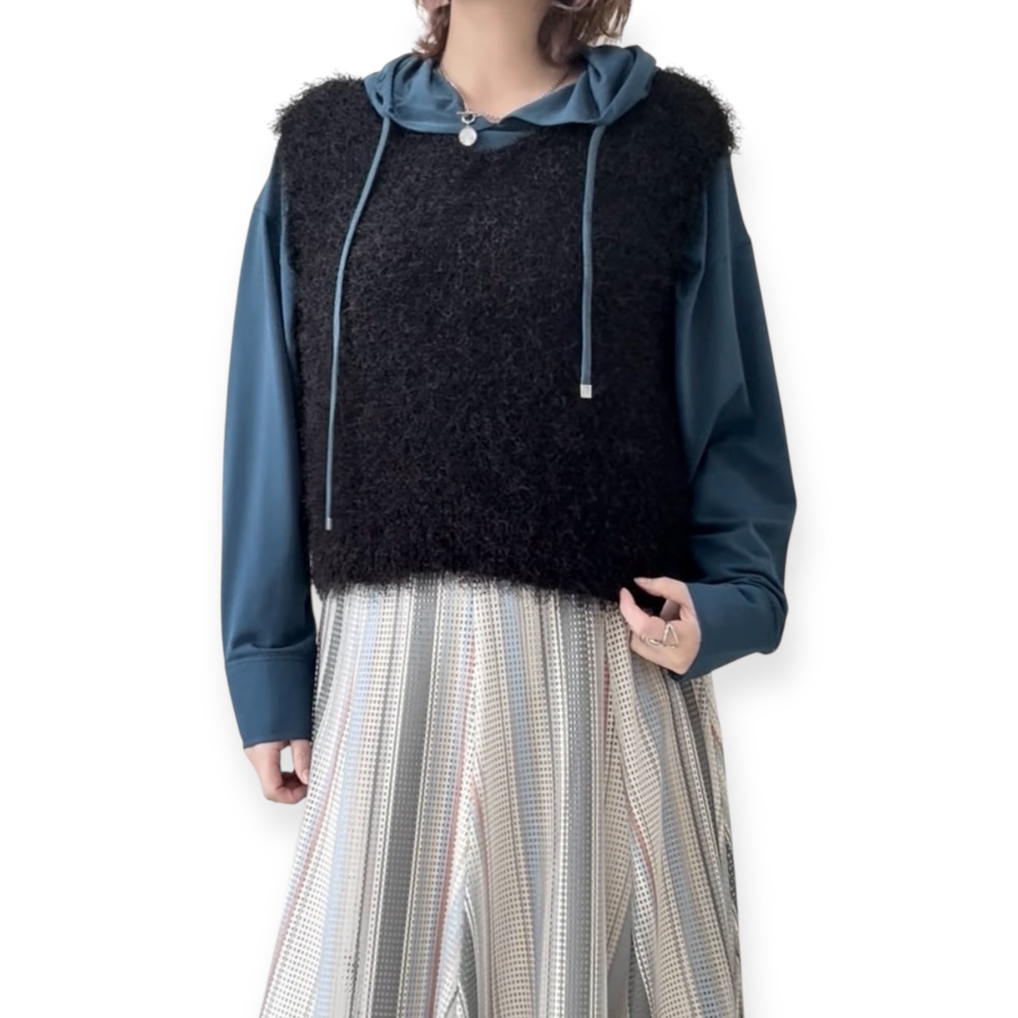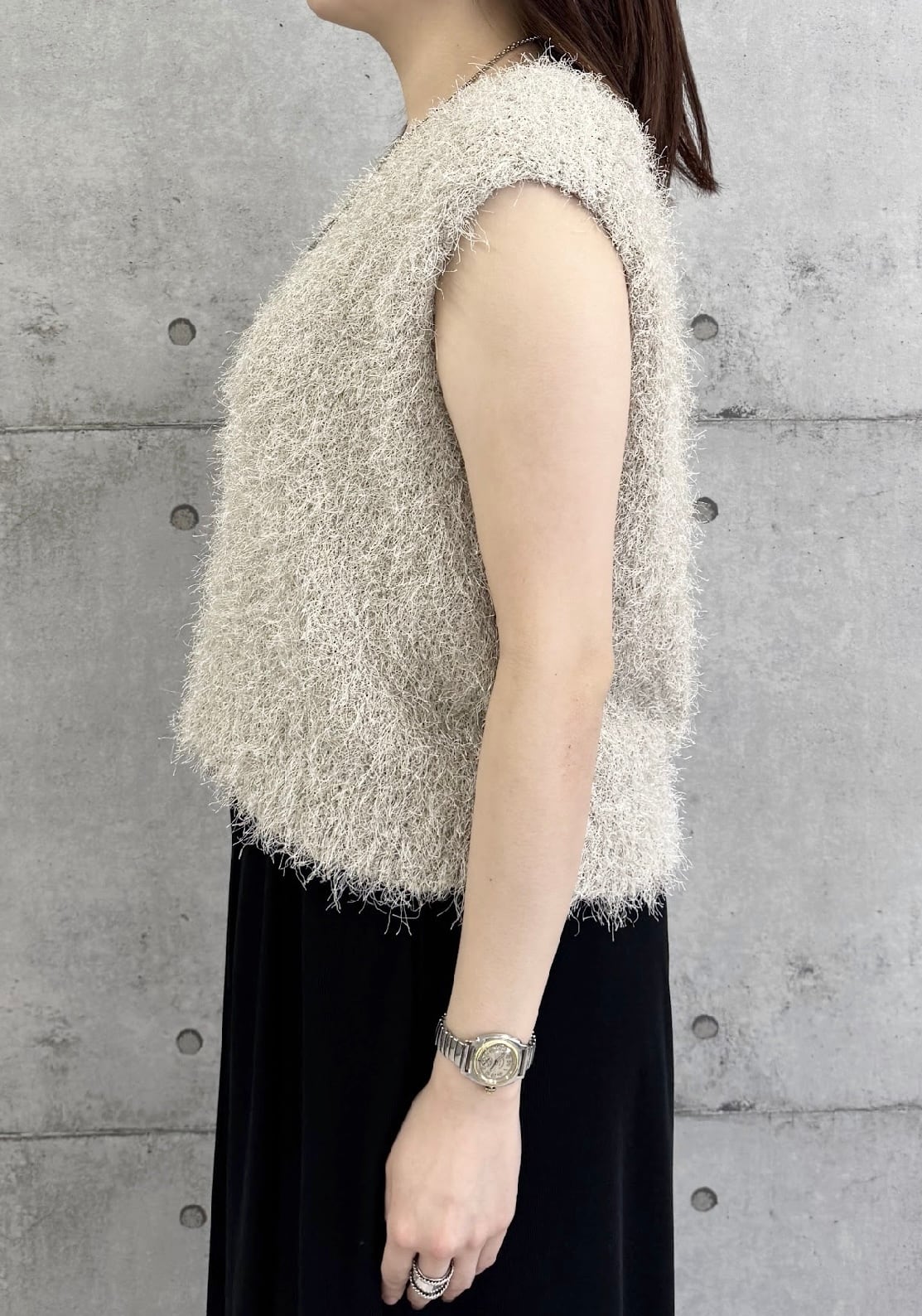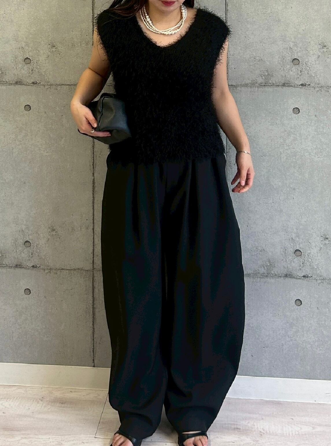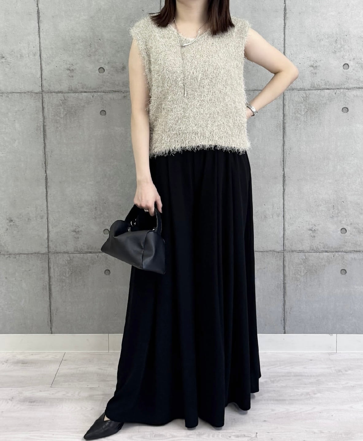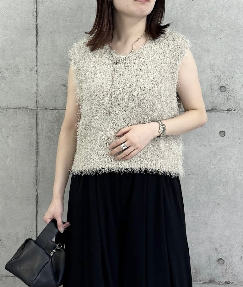 ● ノースリーブトップスとしても活躍できるニットベスト。秋も人気だったシリーズが春にカラーバリエーション変えて再登場✨着やすいシャギー感で、ふわっとライトな着心地が魅力です。肩周りがすっきり見えるサイズ感と締め付け感はないのに全体的にコンパクトな丈感でバランスをとりやすいベストになっています。