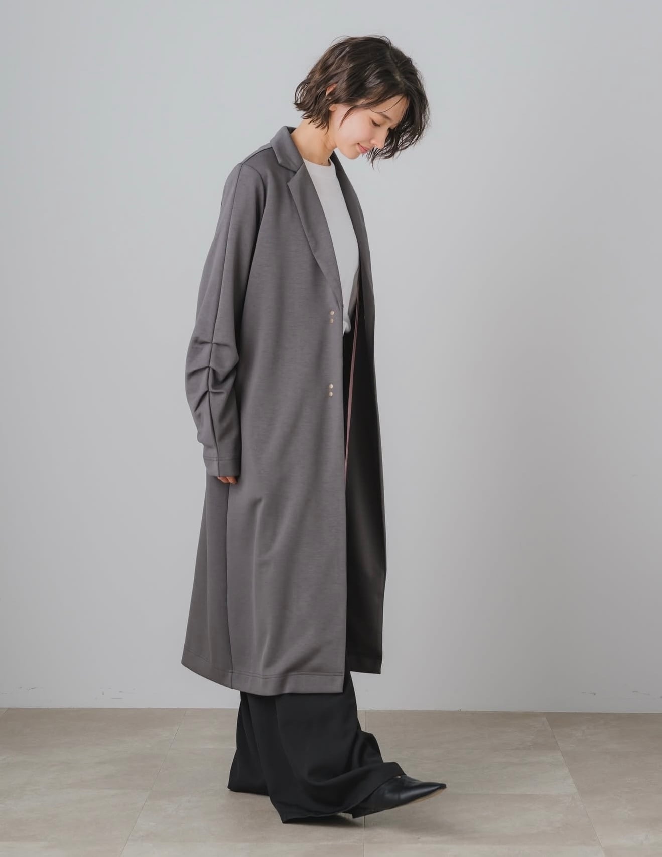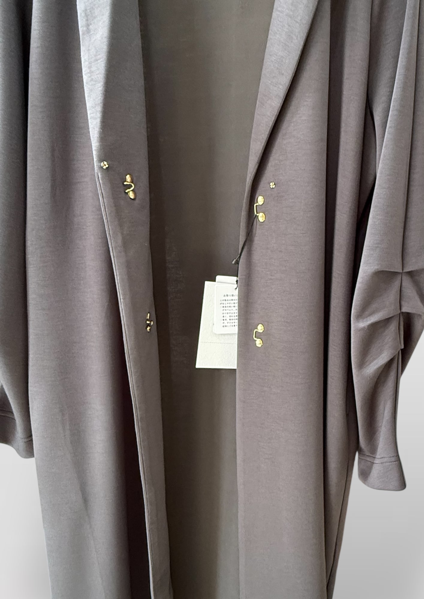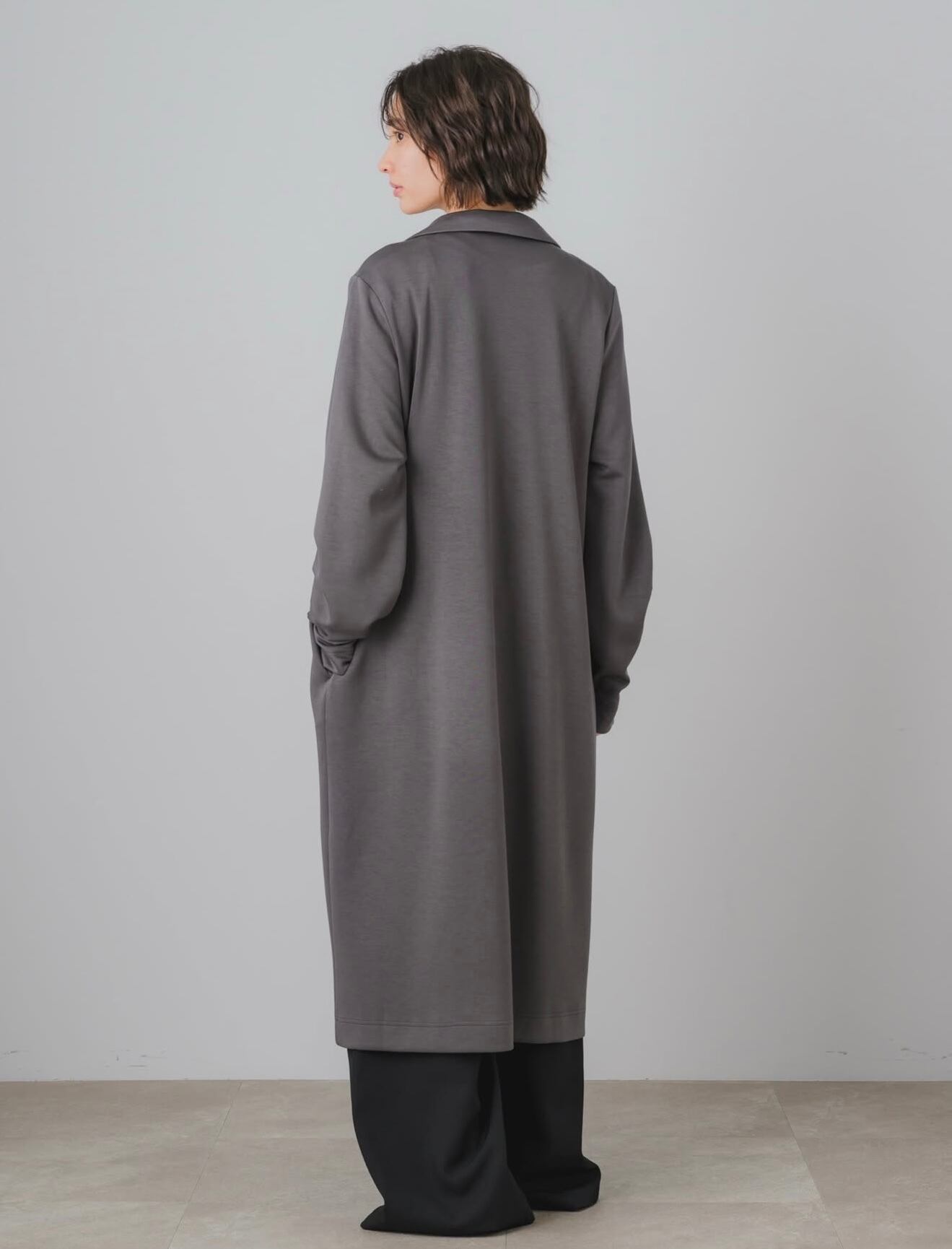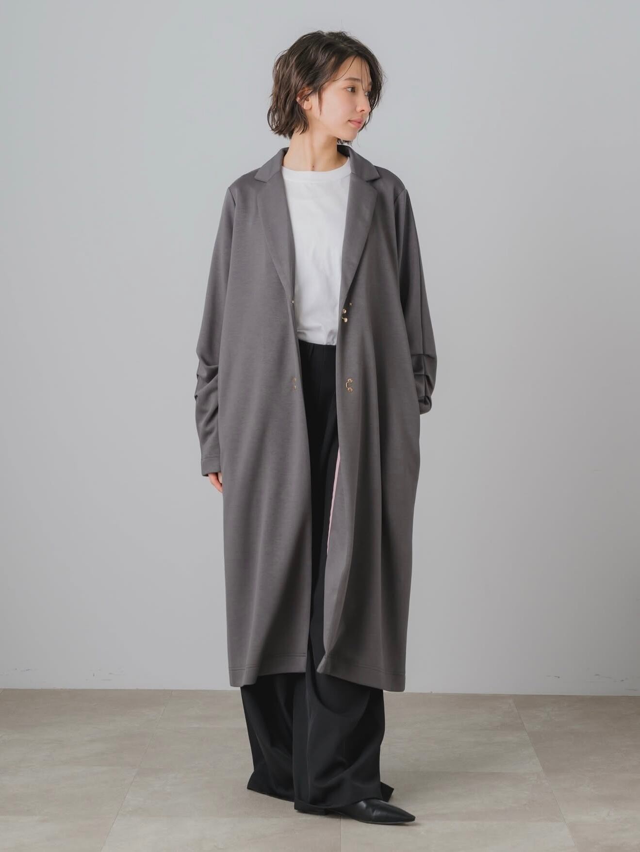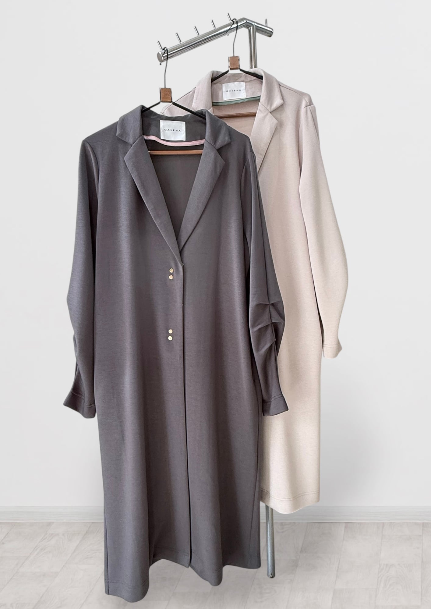 ●洗練されたシルエットが魅力のテーラードロング✨ レーヨンとナイロンの素材でストレッチ抜群、ドレープ感がとてもキレイなロングの羽織りです。美しく落ち感のあるデザインはスリムなラインを引き立て、コーディネートを格上げします。シンプルながらも、後ろの襟から見えるパールがポイントとなり、デイリーユースから特別なシーンまで幅広く対応可能です!