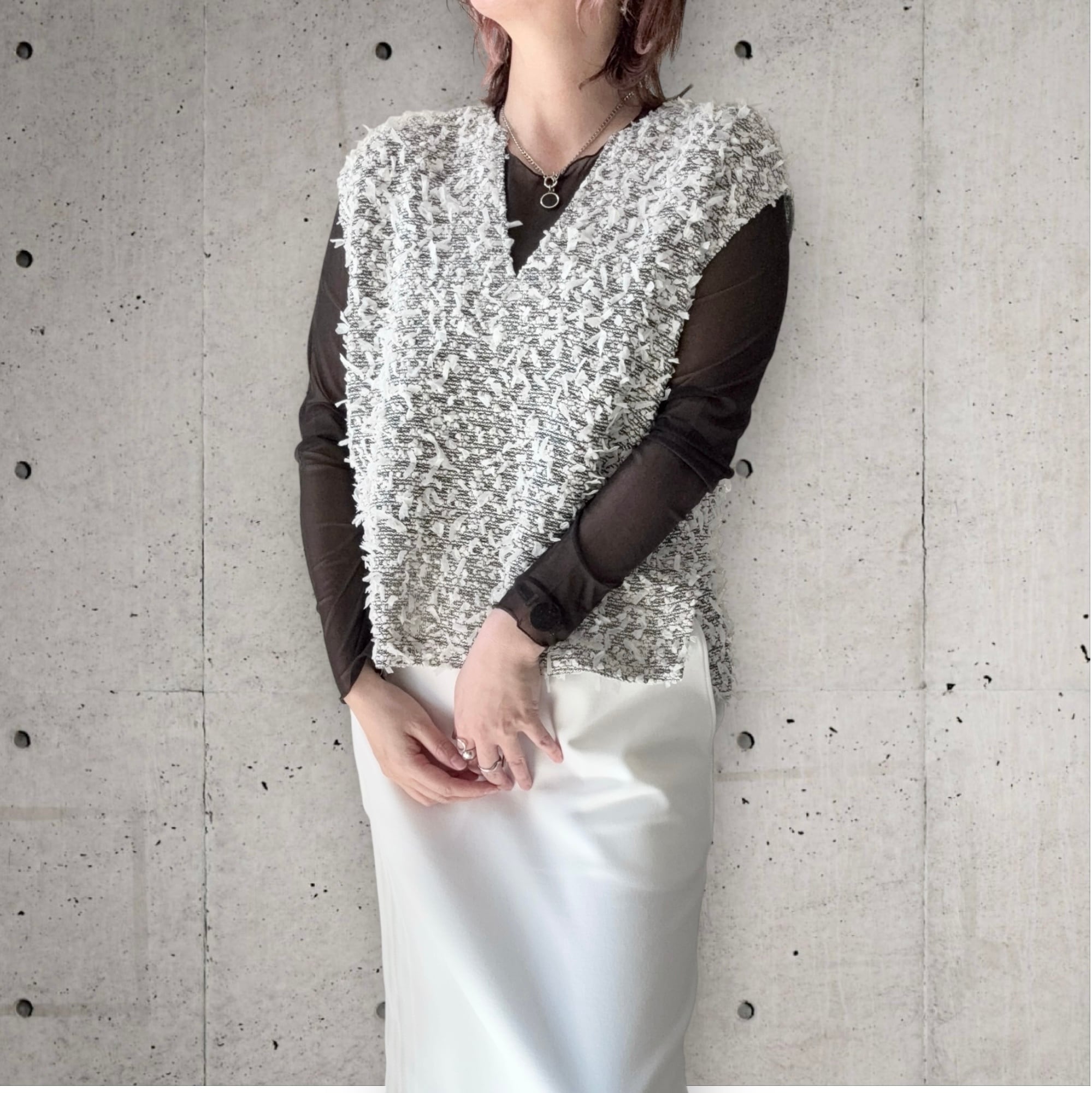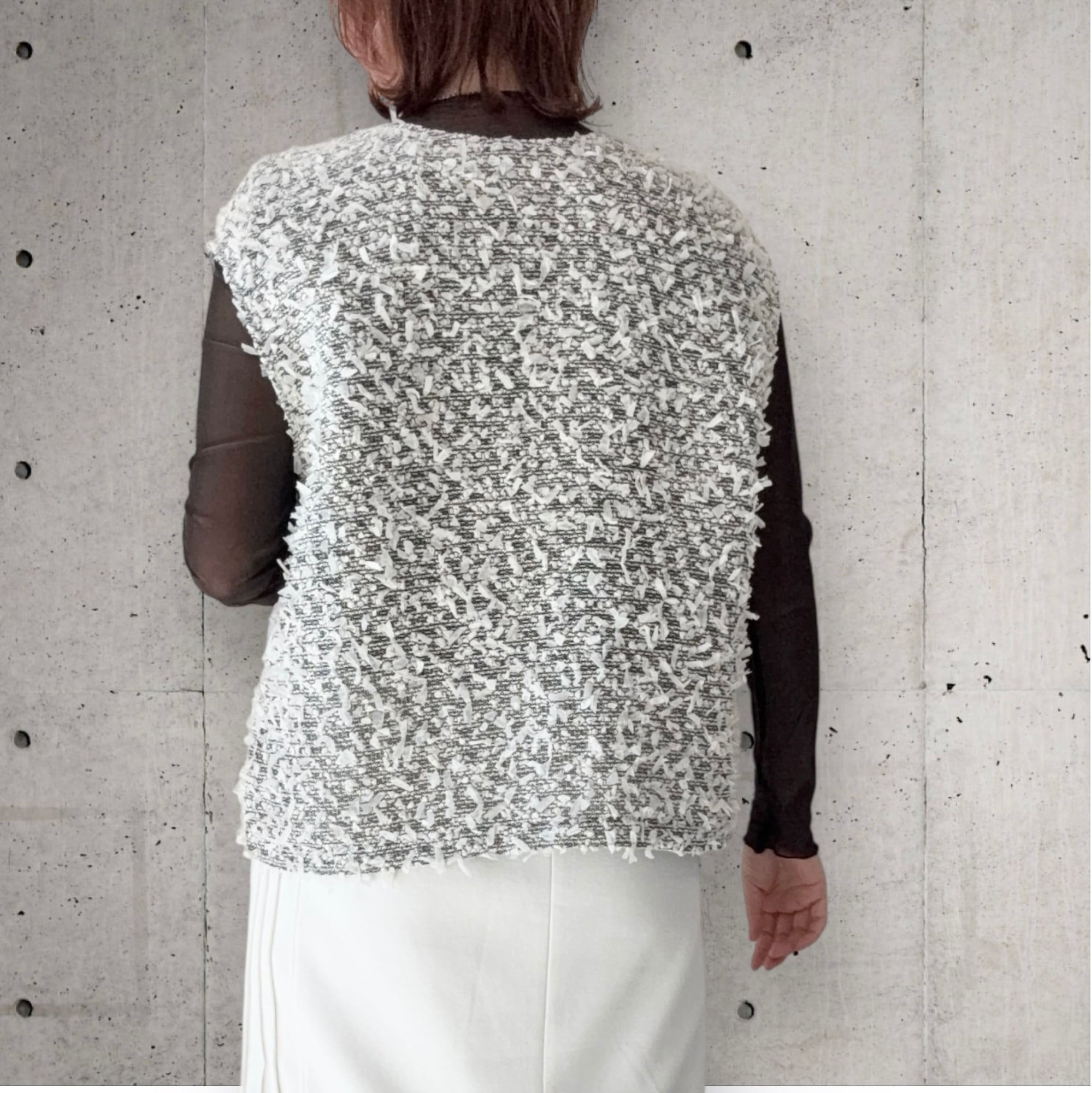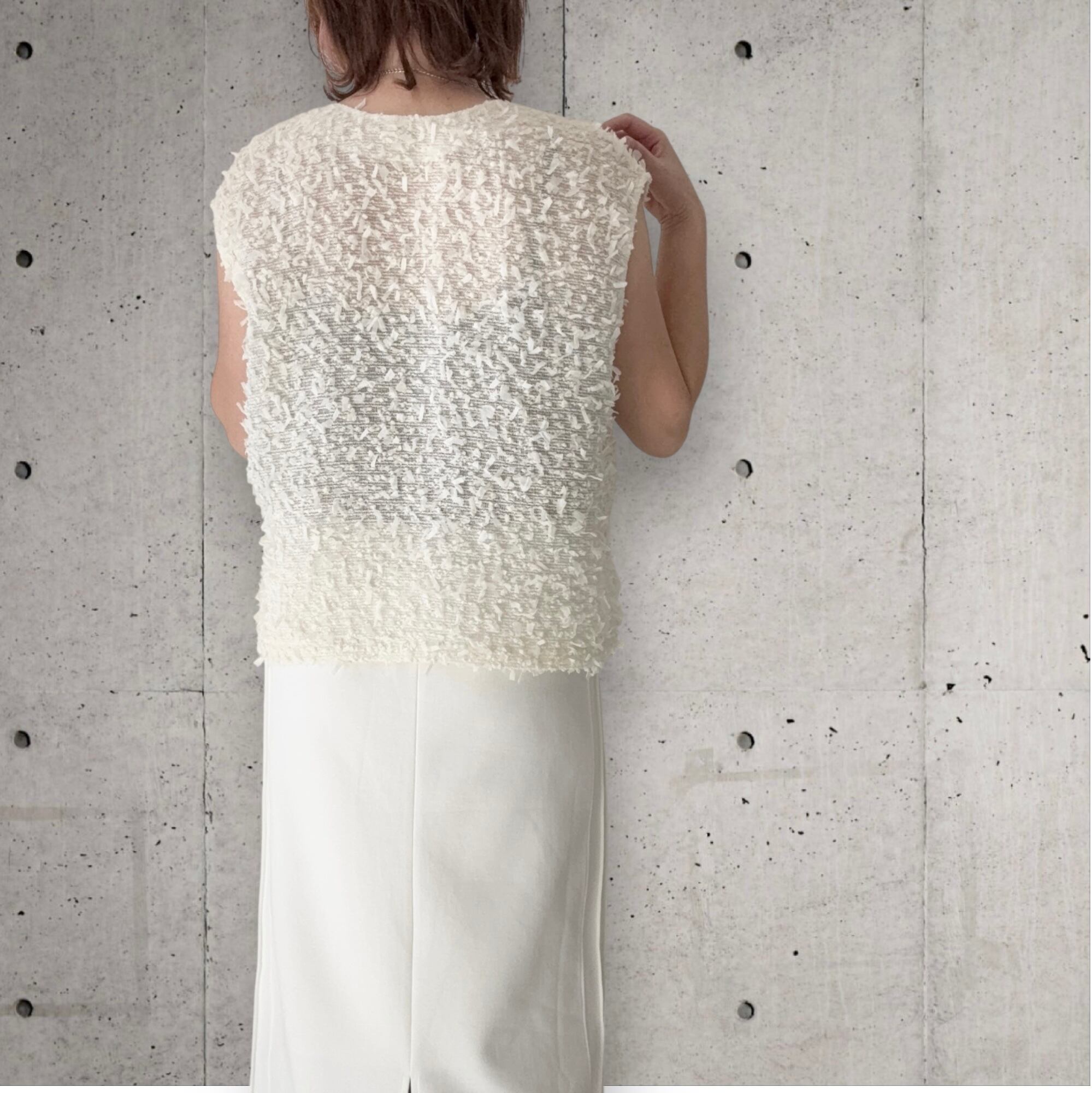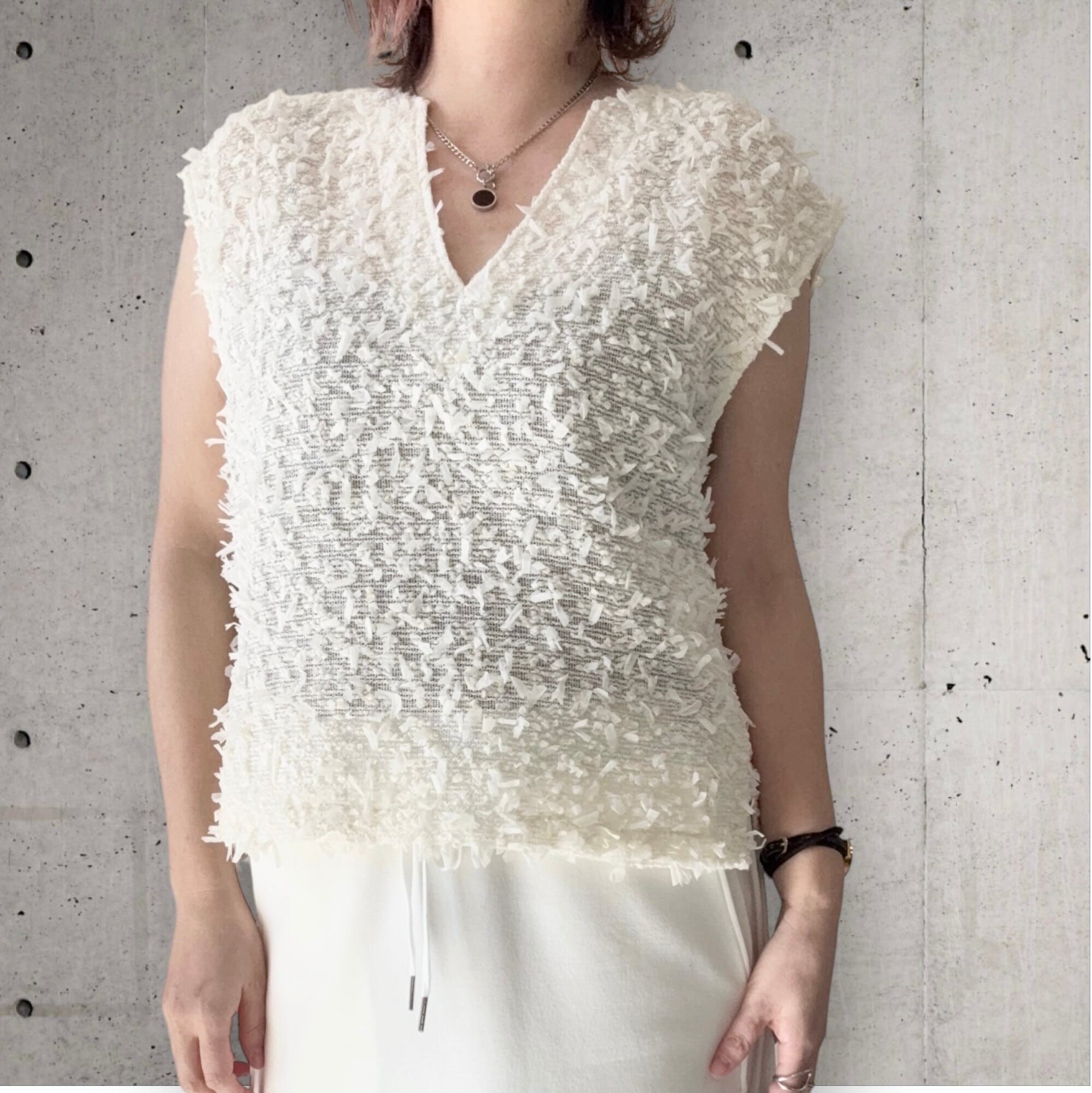 ● テープヤーンを使用したVネックのベストが登場!軽やかな素材感で立体感があり優しい印象を与えつつ、柔らかな肌触りで着心地も抜群。Vネックデザインは、首元を美しく引き立て、スタイルをすっきり見せてくれます。肩部分には適度な生地があり、1枚でもTシャツのように着ていただけます✨春はインナーを合わせ夏は1枚でと、長くご使用可能です✨シンプルなボトムスや、ワイドパンツとも相性が良く、カジュアルからキレイめコーデまで幅広く楽しめる一着です!