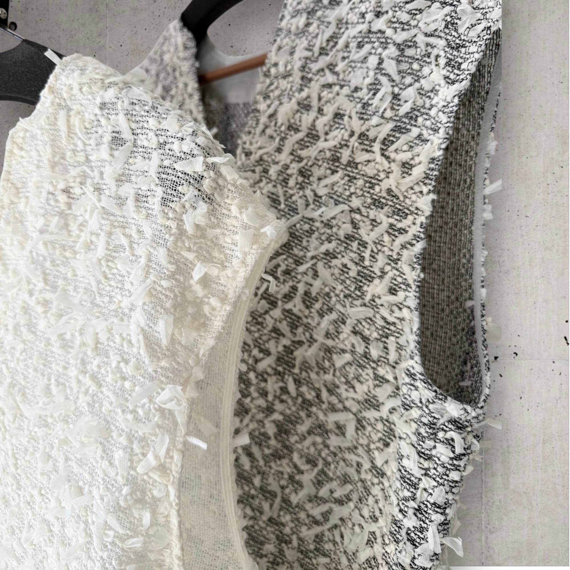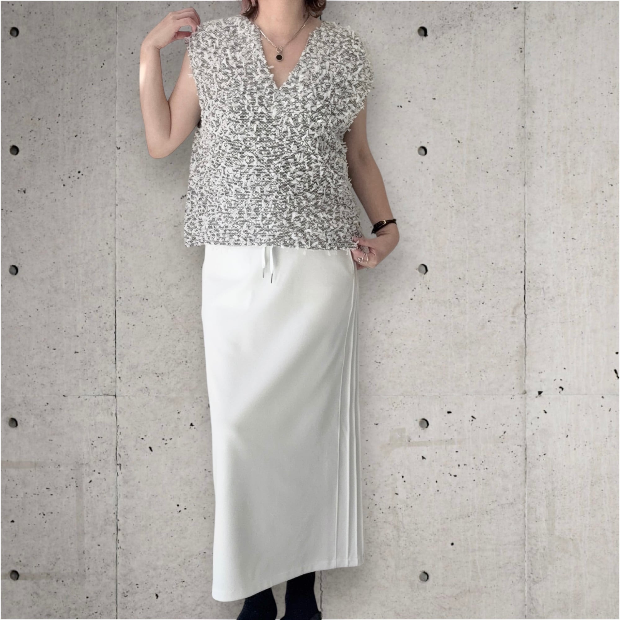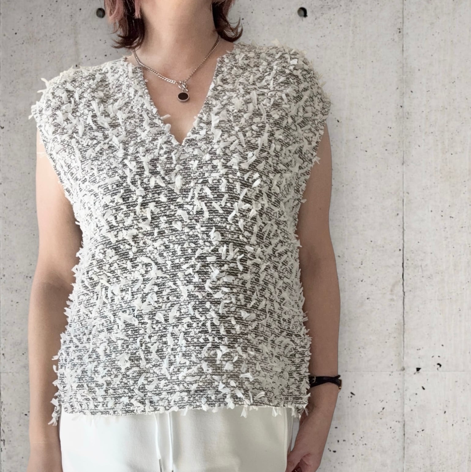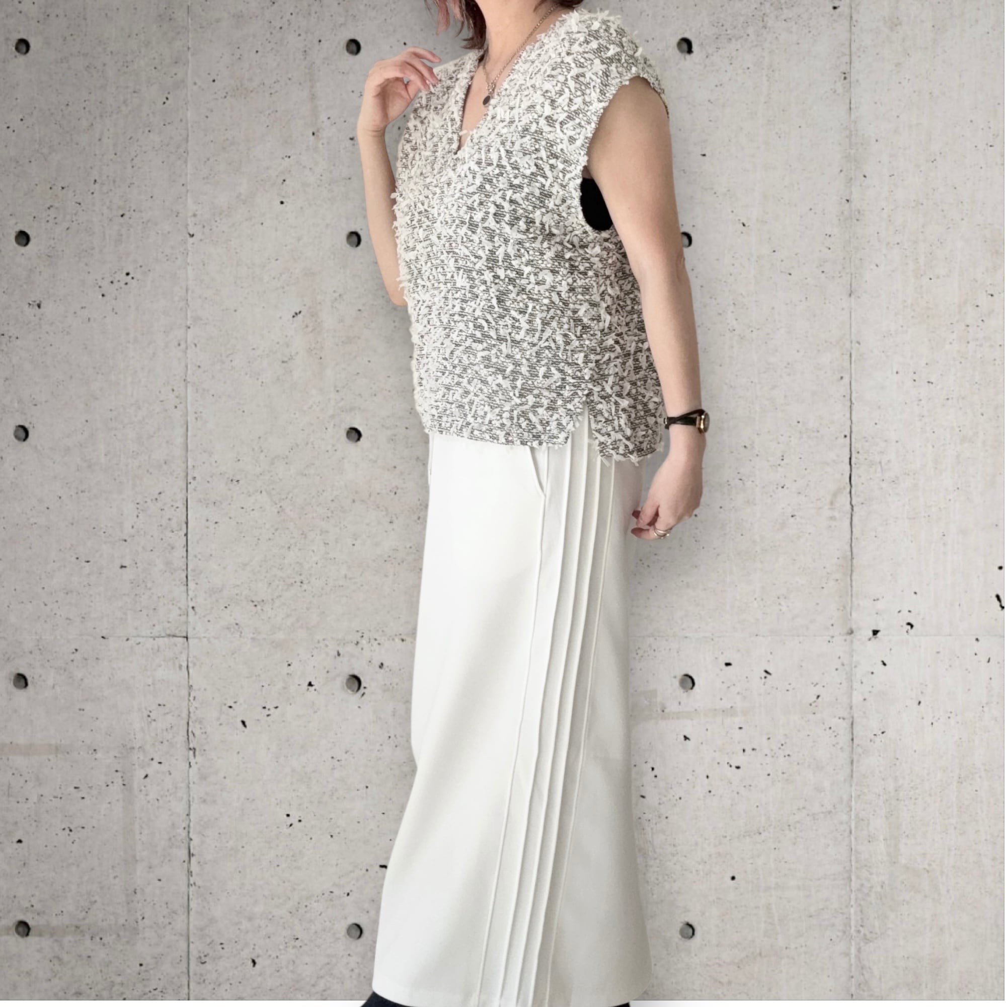 ● テープヤーンを使用したVネックのベストが登場!軽やかな素材感で立体感があり優しい印象を与えつつ、柔らかな肌触りで着心地も抜群。Vネックデザインは、首元を美しく引き立て、スタイルをすっきり見せてくれます。肩部分には適度な生地があり、1枚でもTシャツのように着ていただけます✨春はインナーを合わせ夏は1枚でと、長くご使用可能です✨シンプルなボトムスや、ワイドパンツとも相性が良く、カジュアルからキレイめコーデまで幅広く楽しめる一着です!