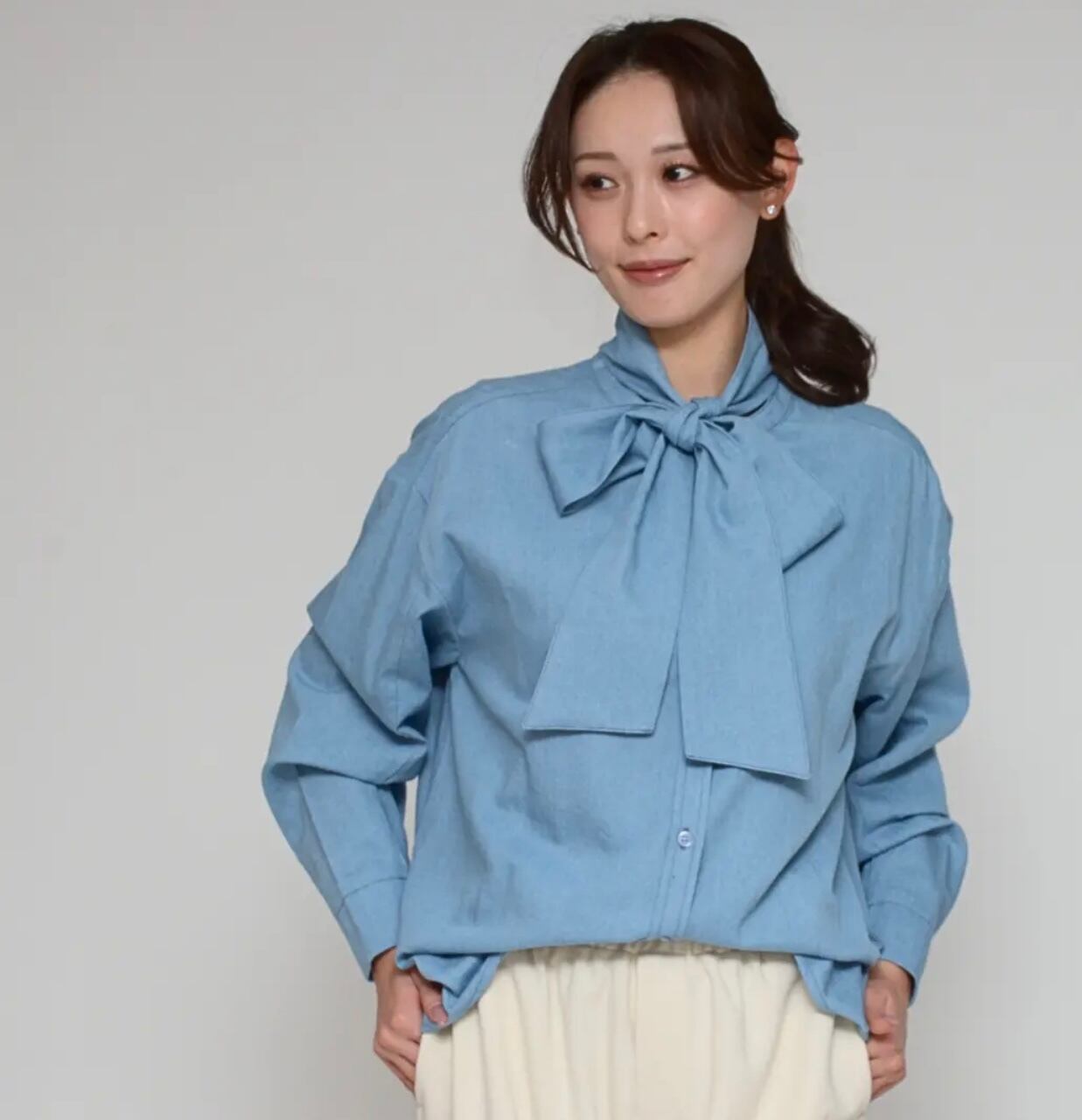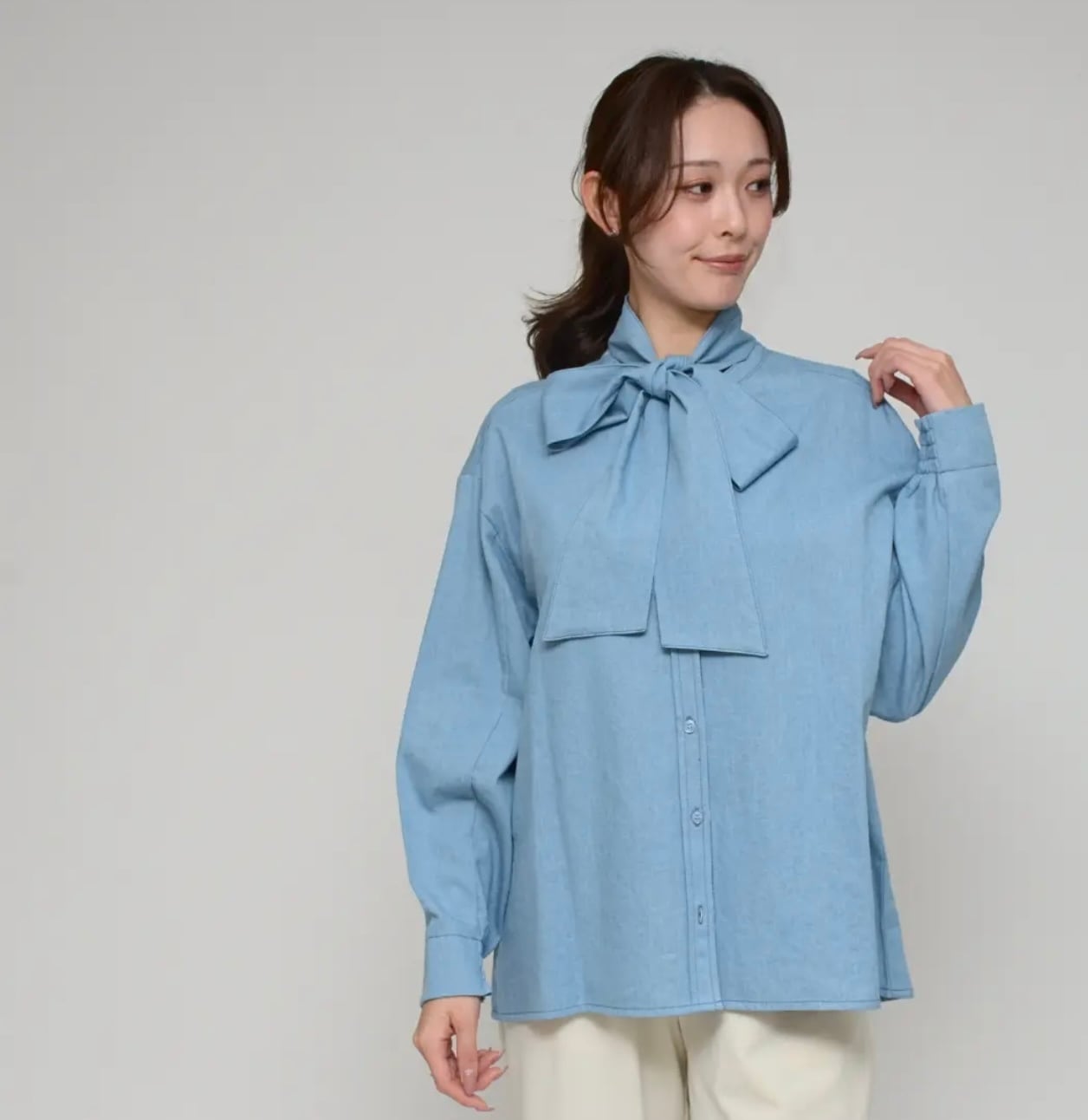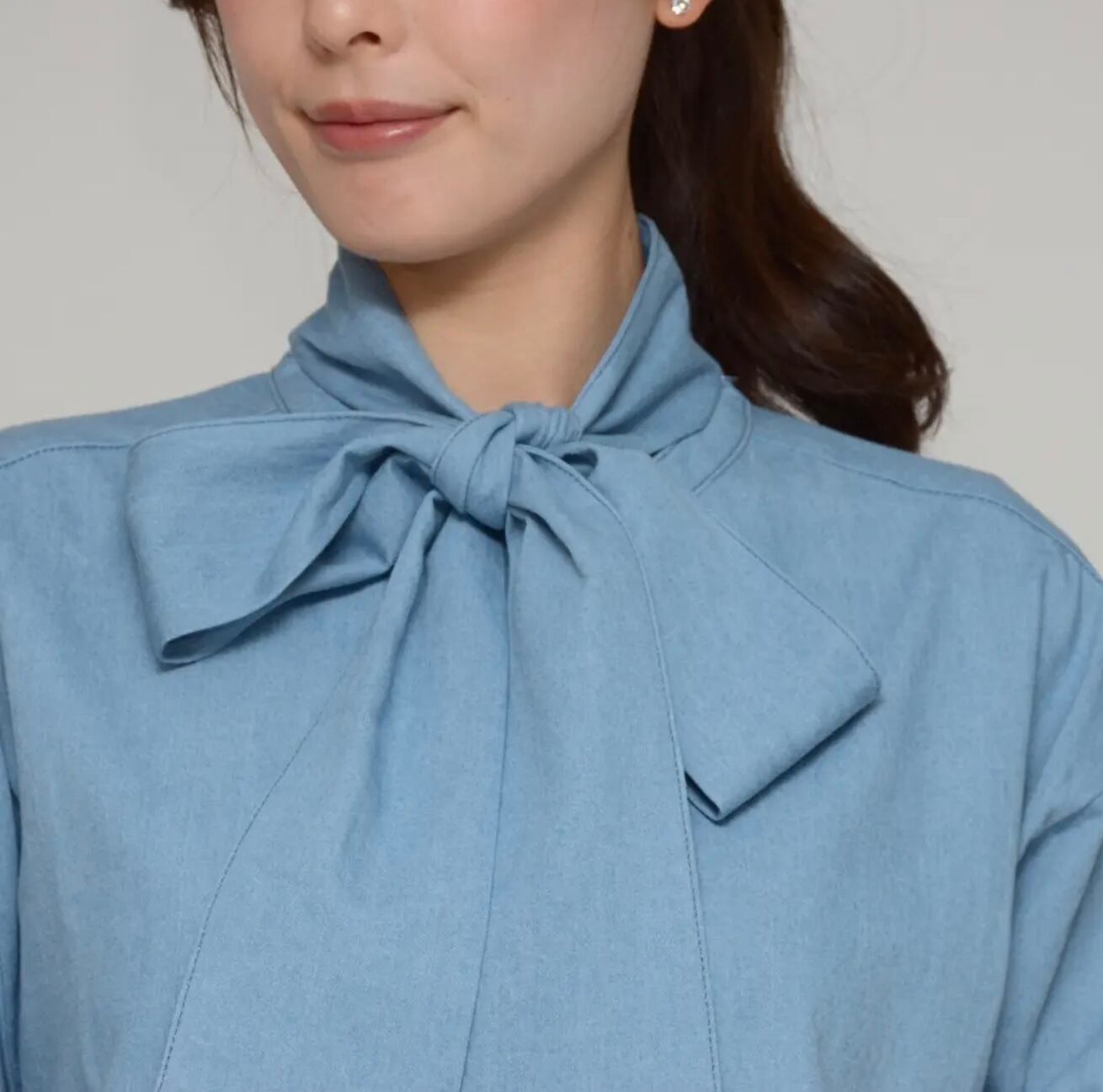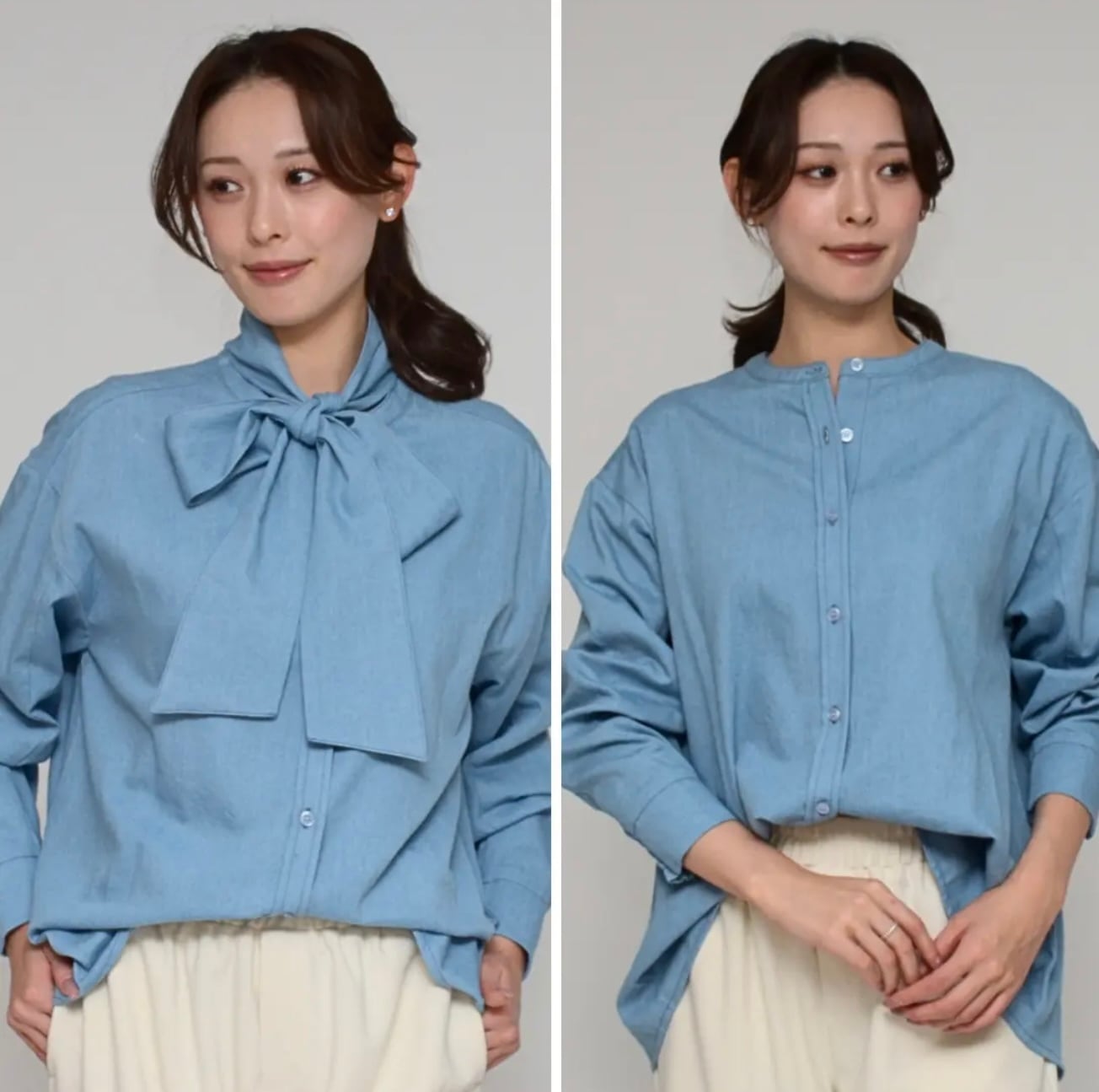 ● 「ボウタイが描く端正な表情、ノーカラーが魅せる抜け感。変化的なディテールを纏う2WAYデニムブラウス」首元のリボンタイが目を惹くアレンジ自在な2WAYデニムブラウス。 最大の特徴は、自由なスタイルを叶えるマルチウェイ仕様のネックデザイン。付属の共布ヒモをボウタイとして結べばクラシカルで華やかな印象に、ヒモを抜けばミニマルなノーカラーシャツとして、
