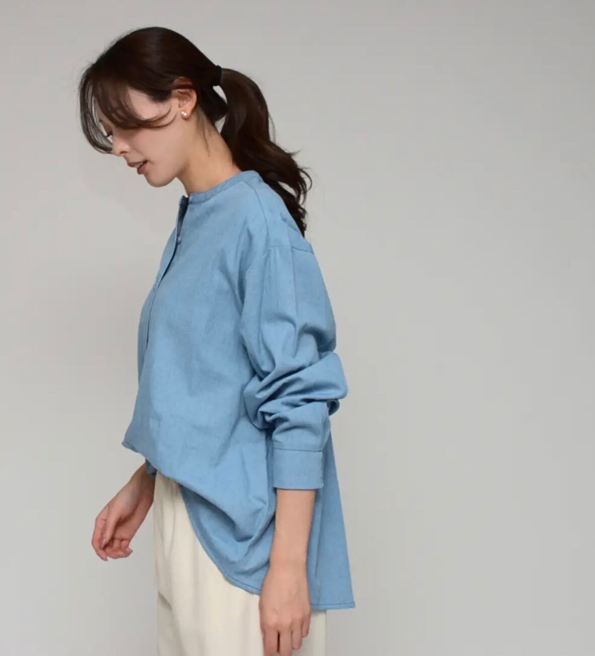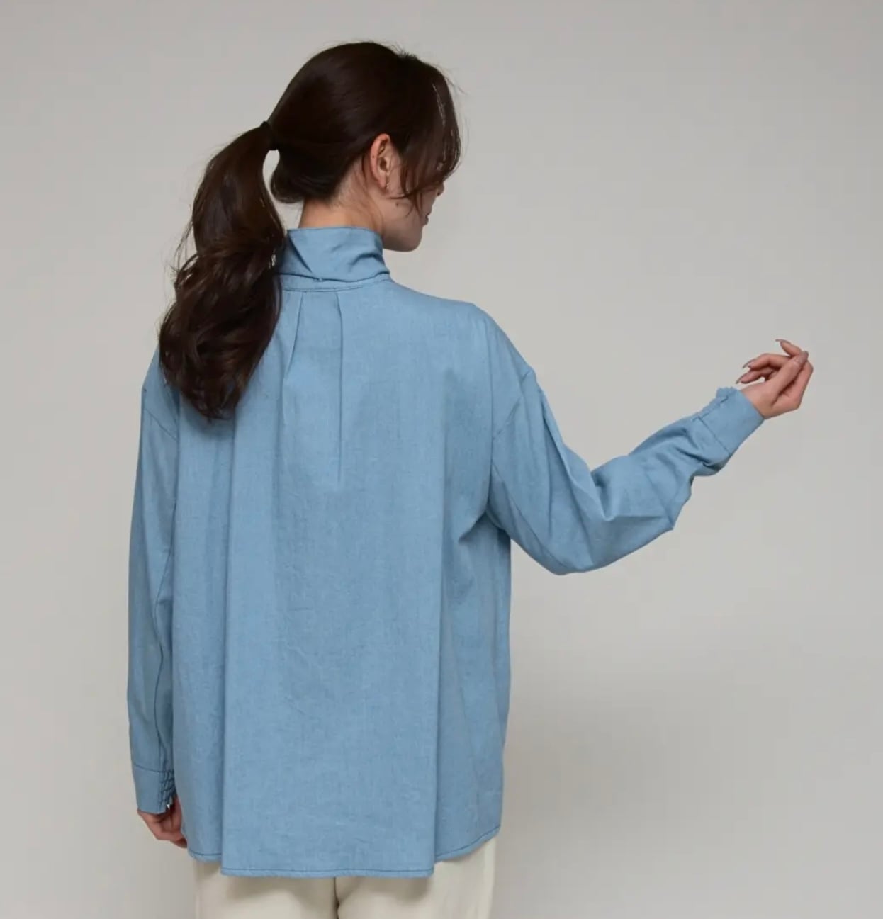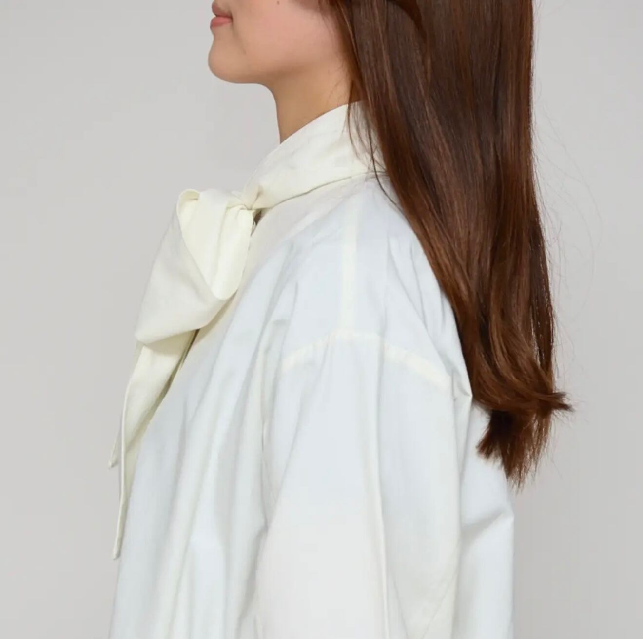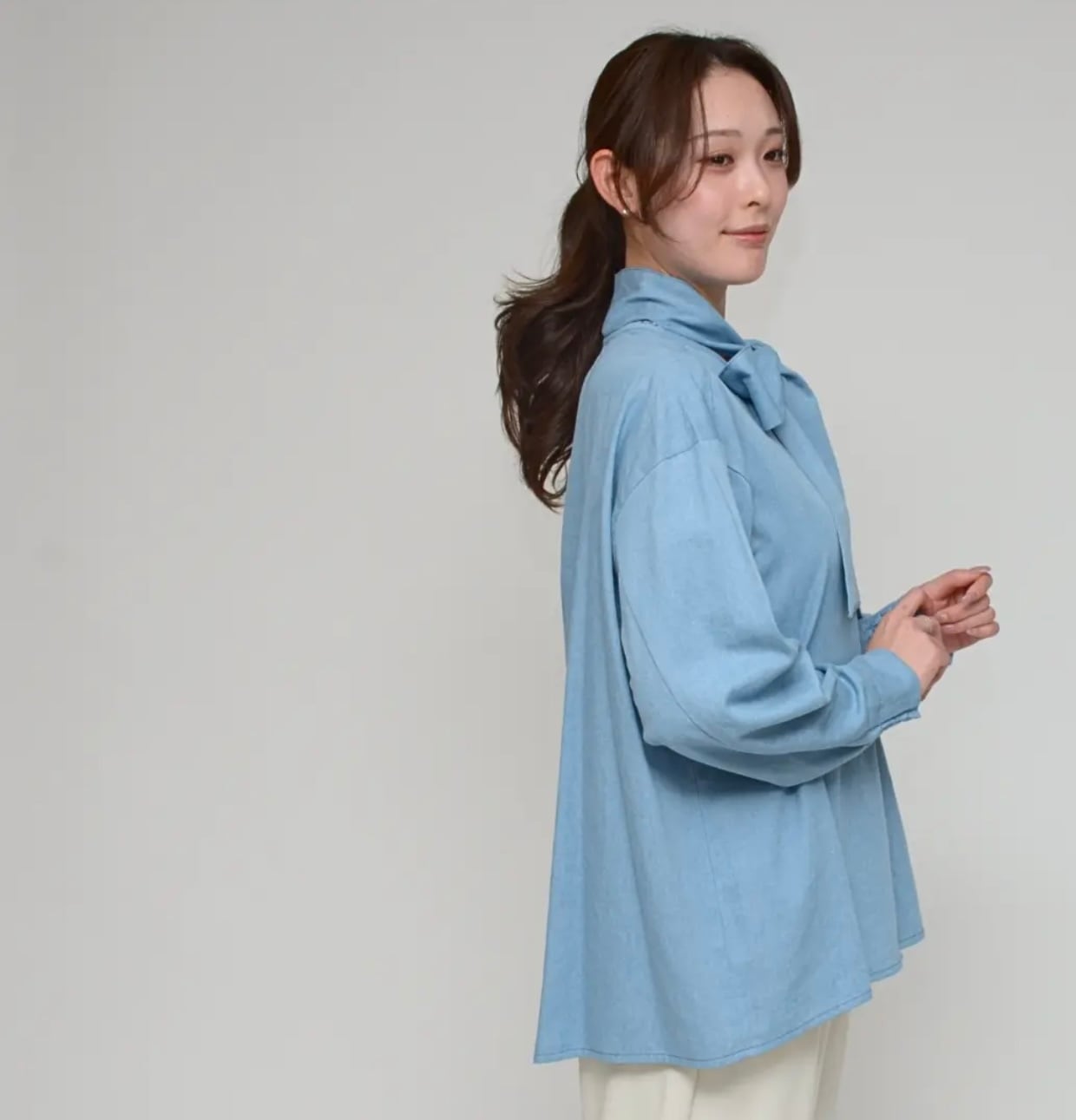 ● 「ボウタイが描く端正な表情、ノーカラーが魅せる抜け感。変化的なディテールを纏う2WAYデニムブラウス」首元のリボンタイが目を惹くアレンジ自在な2WAYデニムブラウス。 最大の特徴は、自由なスタイルを叶えるマルチウェイ仕様のネックデザイン。付属の共布ヒモをボウタイとして結べばクラシカルで華やかな印象に、ヒモを抜けばミニマルなノーカラーシャツとして、