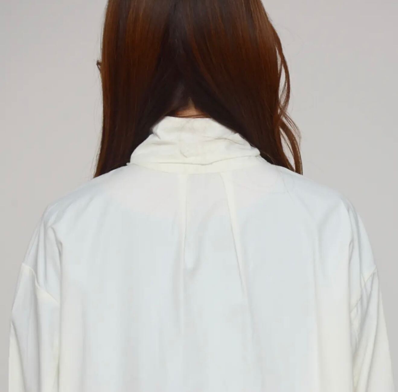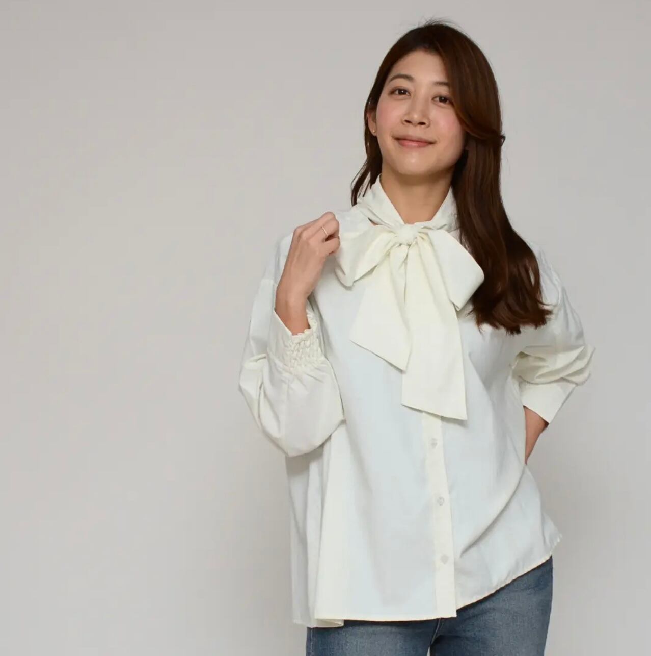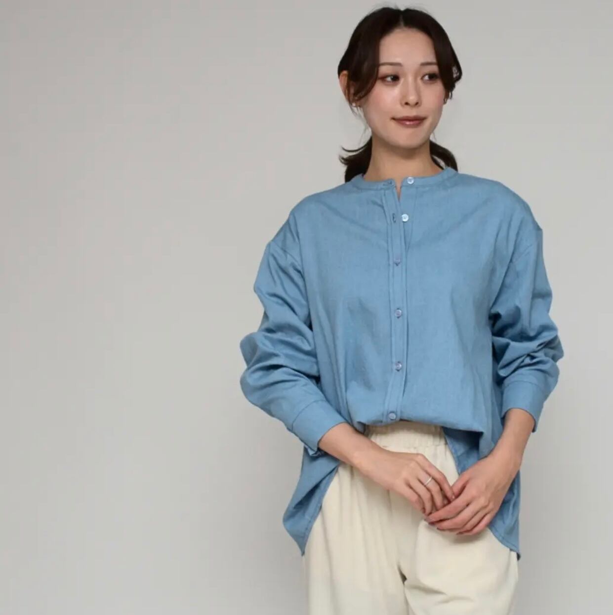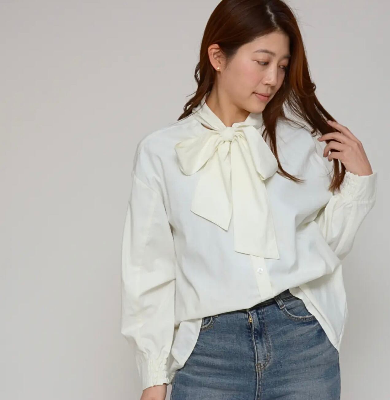 ● 「ボウタイが描く端正な表情、ノーカラーが魅せる抜け感。変化的なディテールを纏う2WAYデニムブラウス」首元のリボンタイが目を惹くアレンジ自在な2WAYデニムブラウス。 最大の特徴は、自由なスタイルを叶えるマルチウェイ仕様のネックデザイン。付属の共布ヒモをボウタイとして結べばクラシカルで華やかな印象に、ヒモを抜けばミニマルなノーカラーシャツとして、
