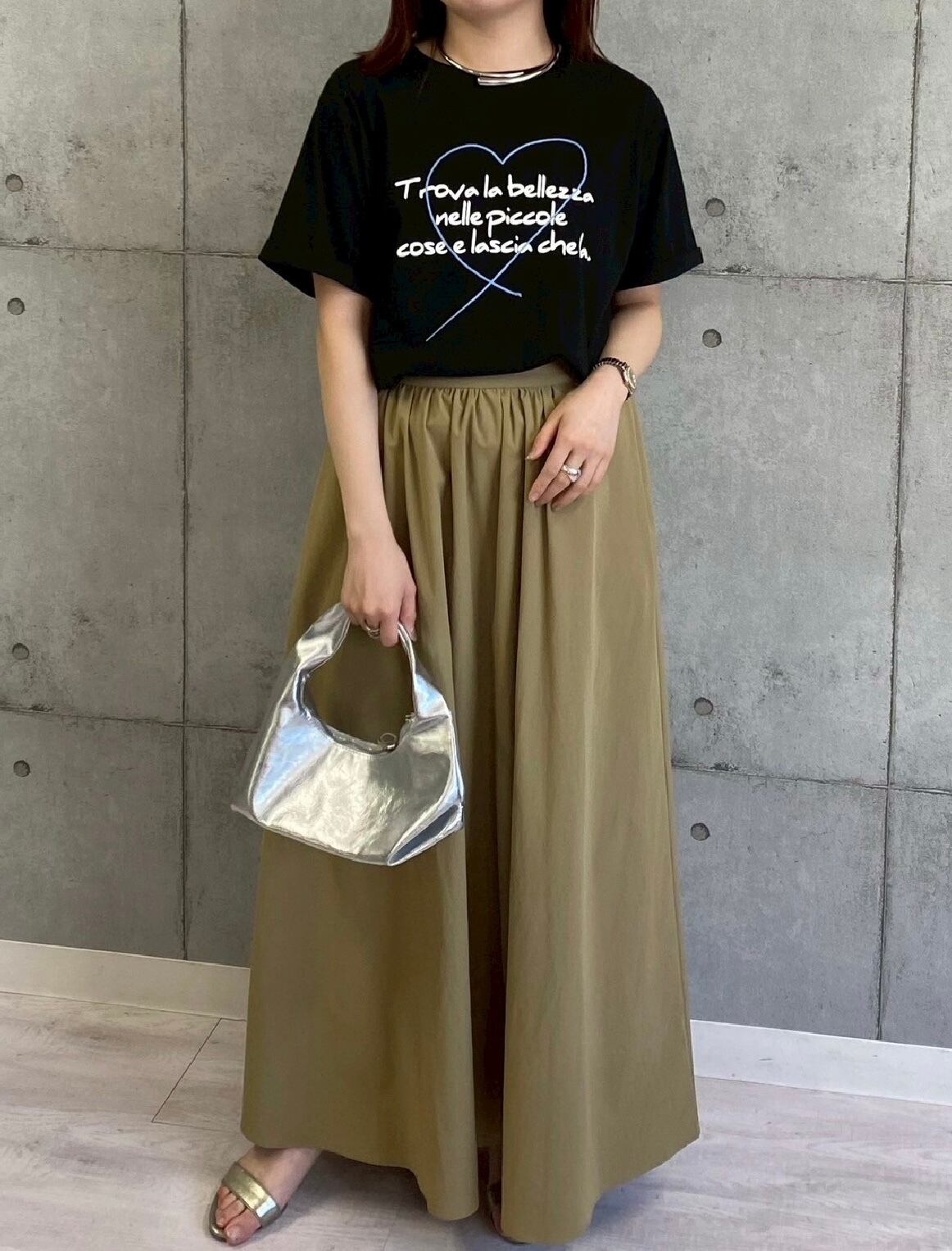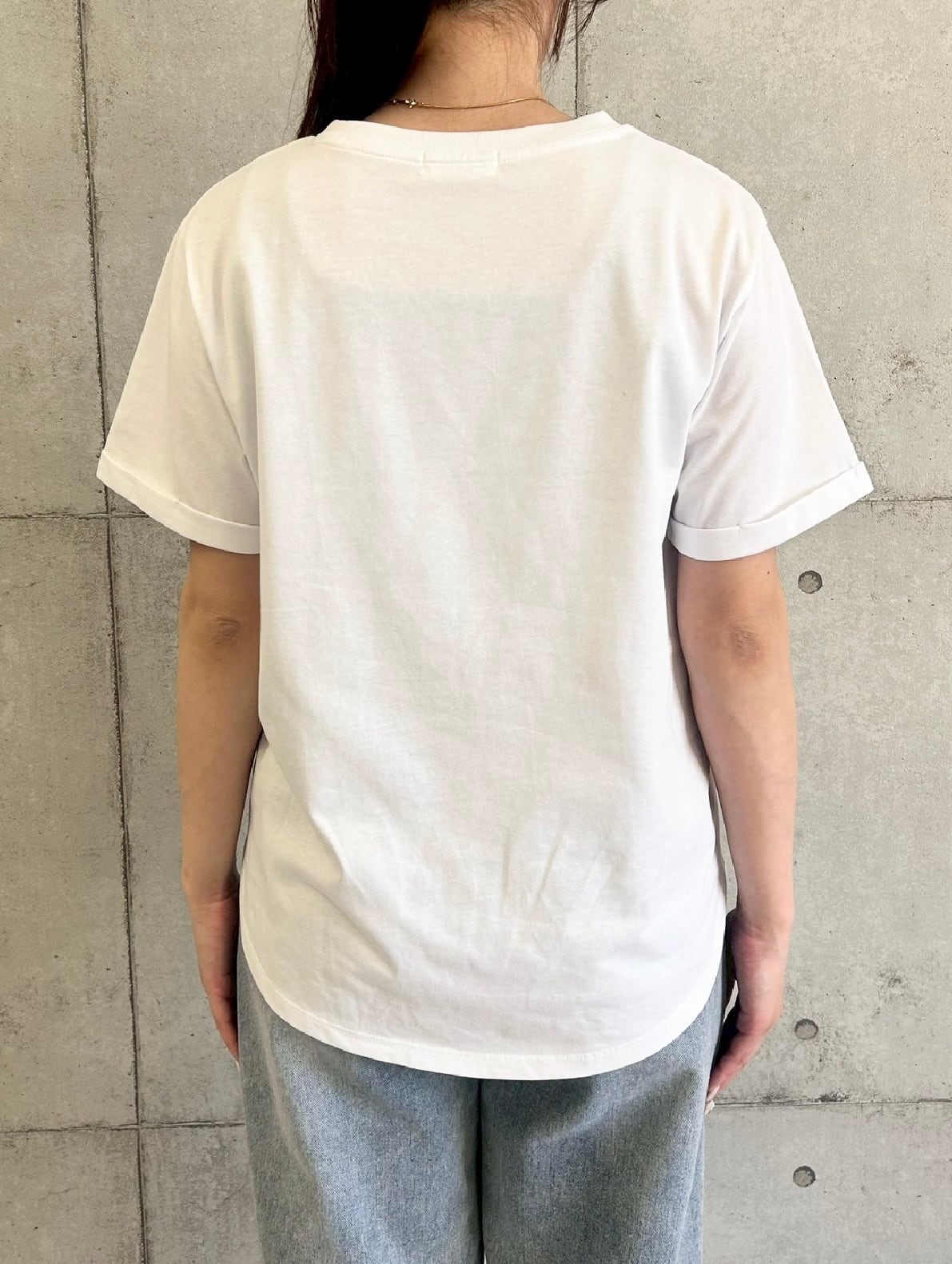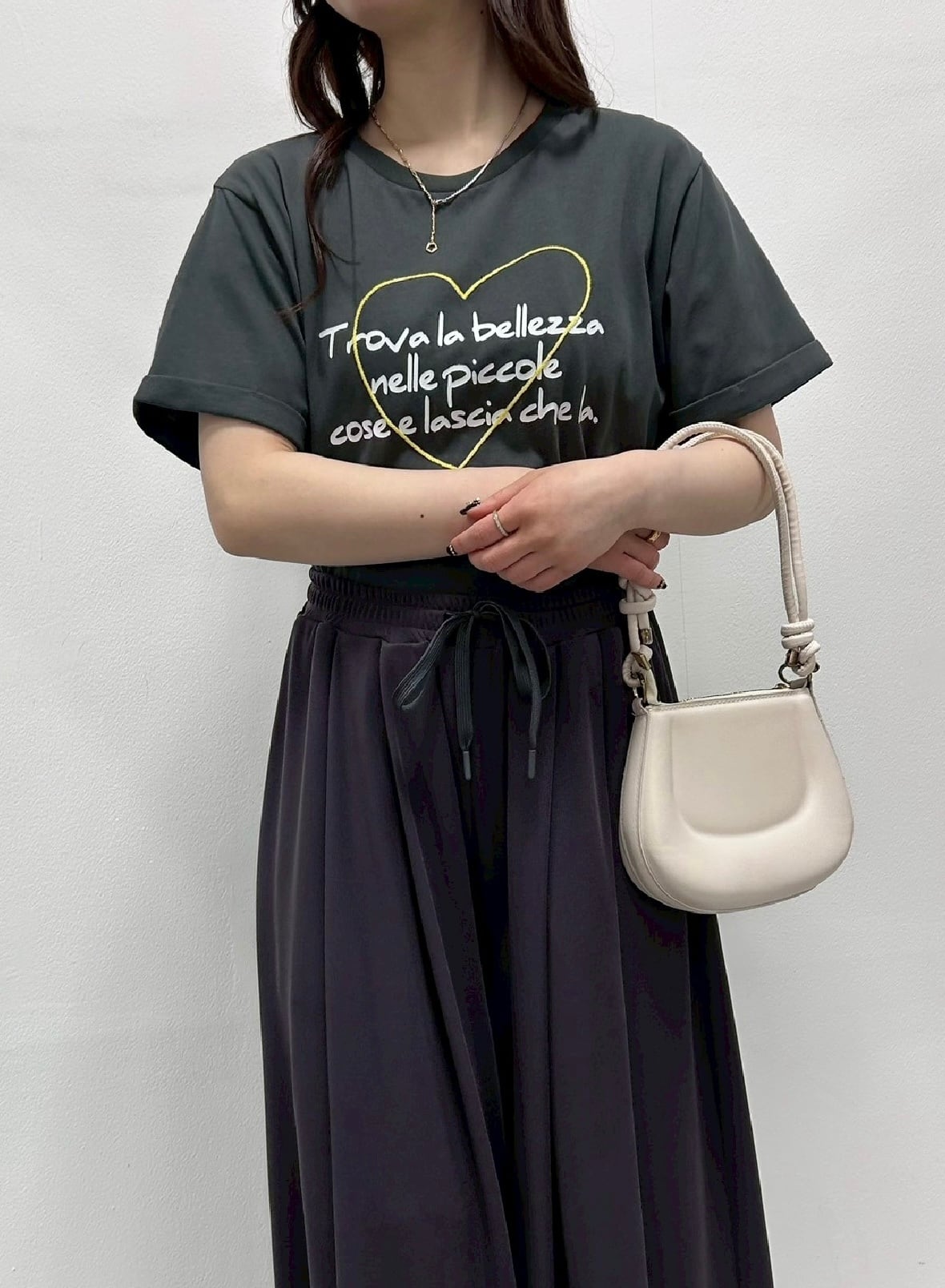 ● 手書き風のロゴとハートのコード刺繍が施された半袖Tシャツ。形はコンパクト過ぎず、裾がラウンドになったシルエットです。袖の折り返しもポイントです。手書き風のロゴ刺繍が大人カジュアルな雰囲気を醸し出し、ハートのコード刺舗でかわいらしい印象になります。