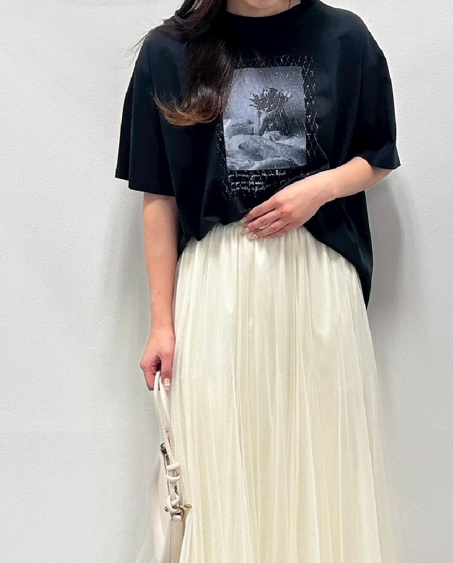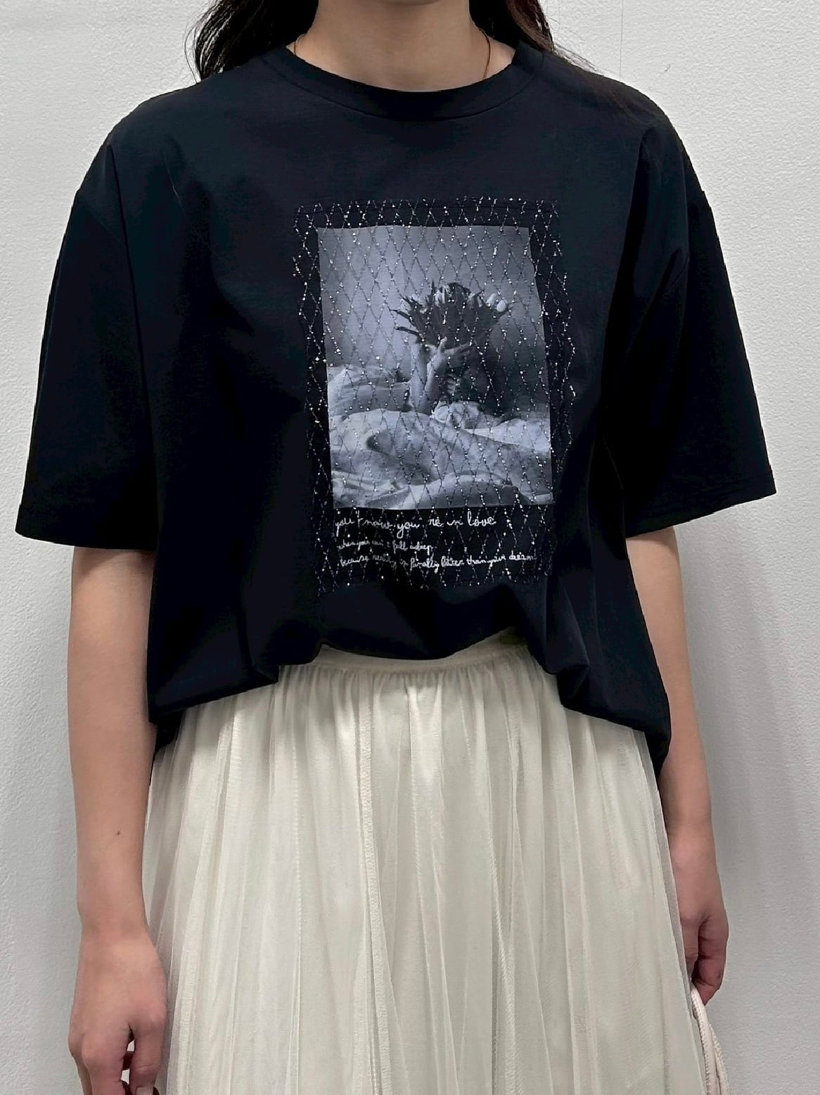 ● フォトプリントの上からラメ糸混のチュールを重ねた半袖Tシャツ。少しゆとりのあるオーバーサイズですが、生地が比較的薄手でテンセル混のため特有のとろみ感があるのでカジュアルになりすぎず落ち感がキレイで女性らしいTシャツアイテムです✨