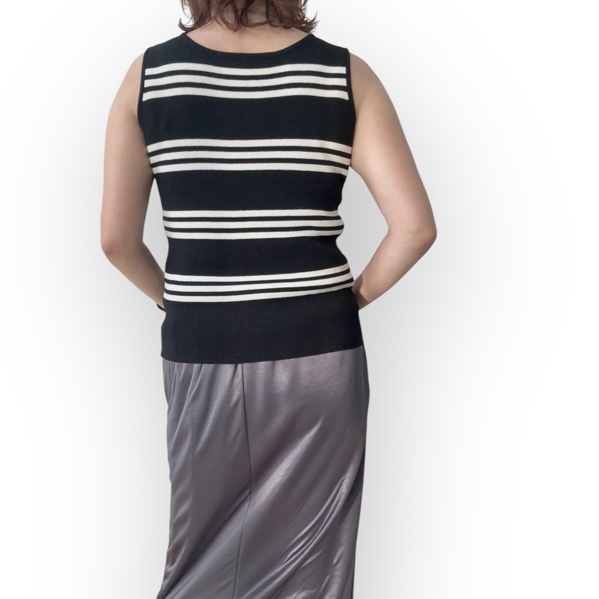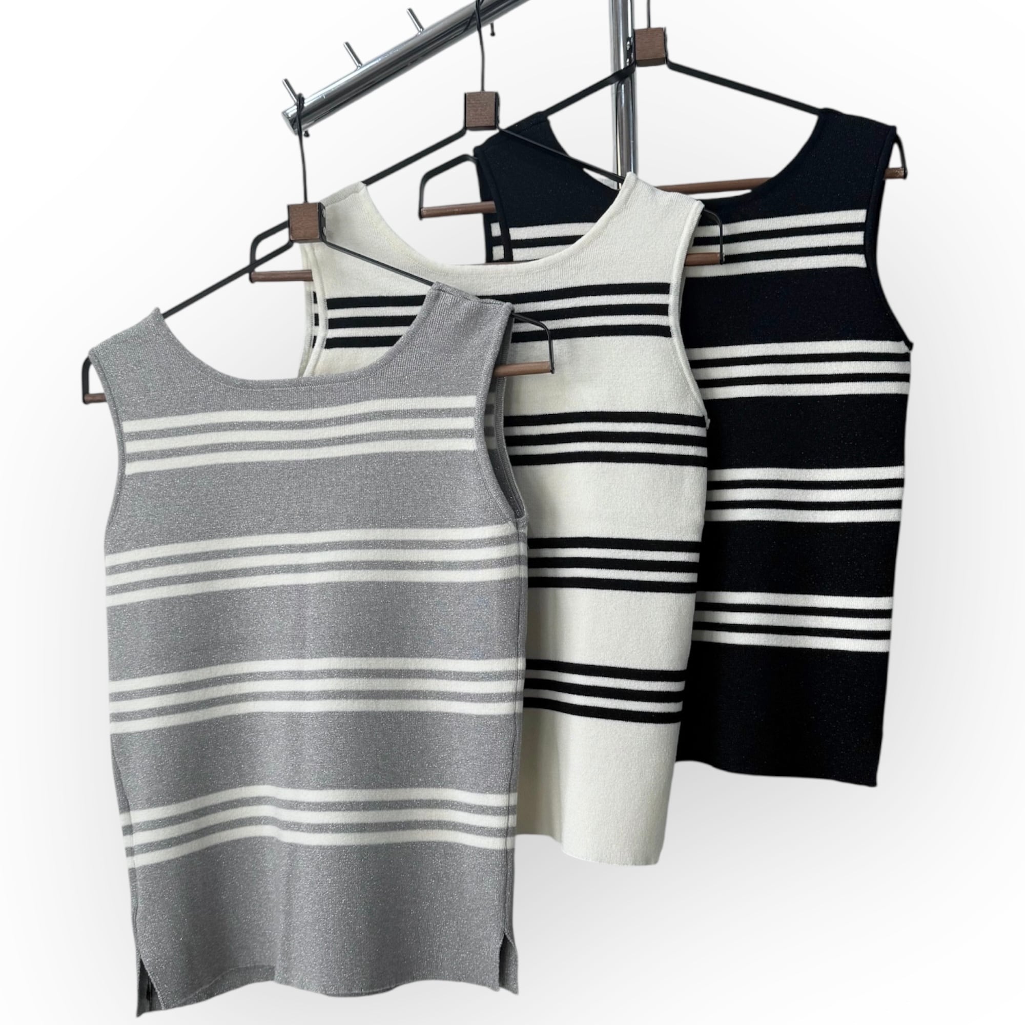 ●大人気シリーズが今年のデザインで入荷!!ひんやり感のある薄手ニット素材です。オールシーズン使えるのも魅力的!細かい小さなラメがほんのりキラっとします。細いボーダを三段にすることでキレイめ感が引き立ち通常のボーダーと差をつけてくれます。さらに前後2wayでVネックとスクエアで楽しんで頂けます✨