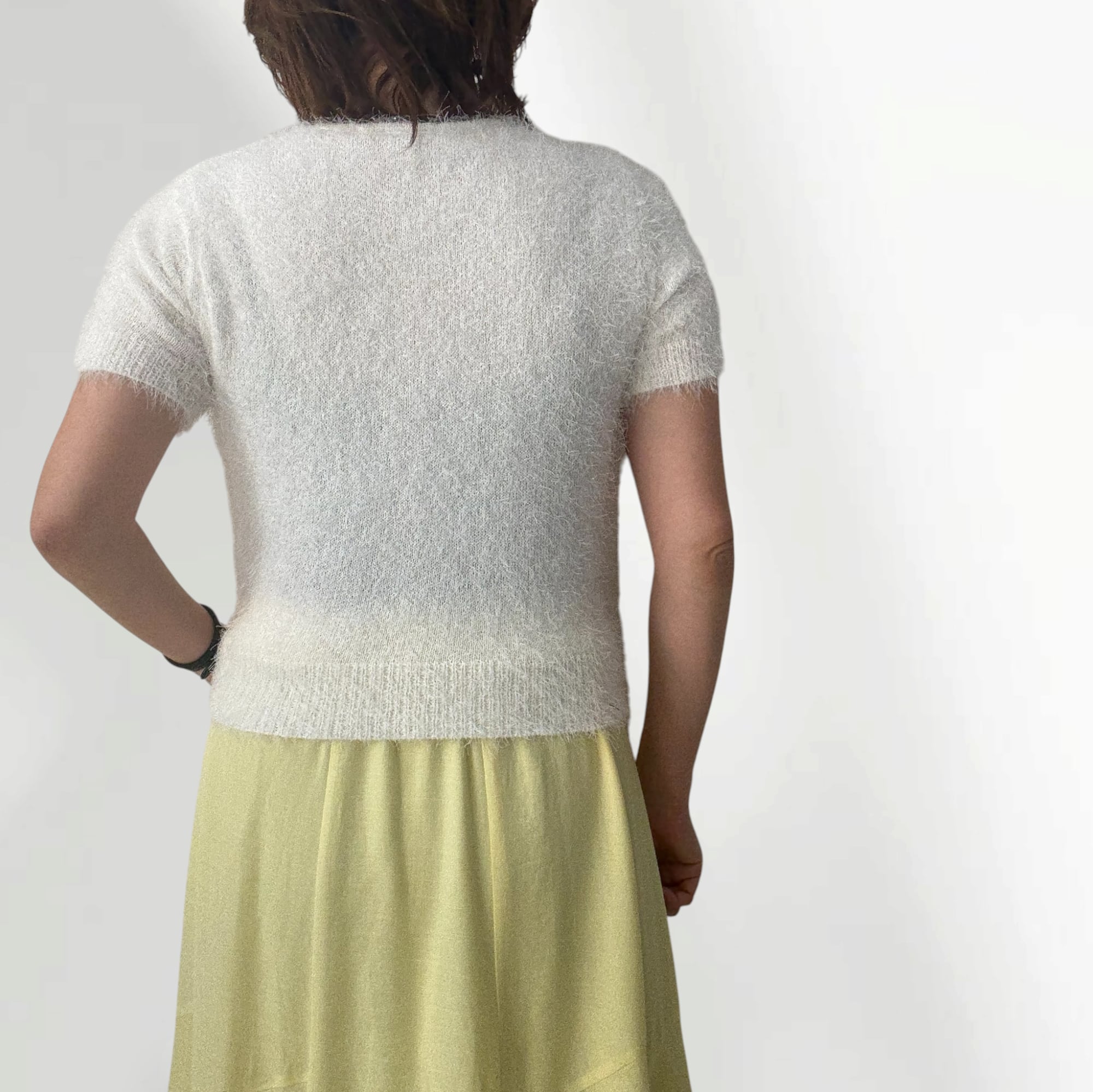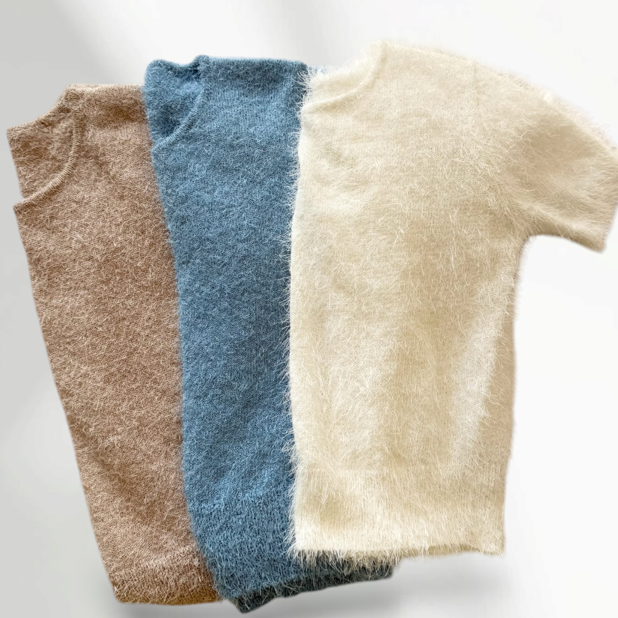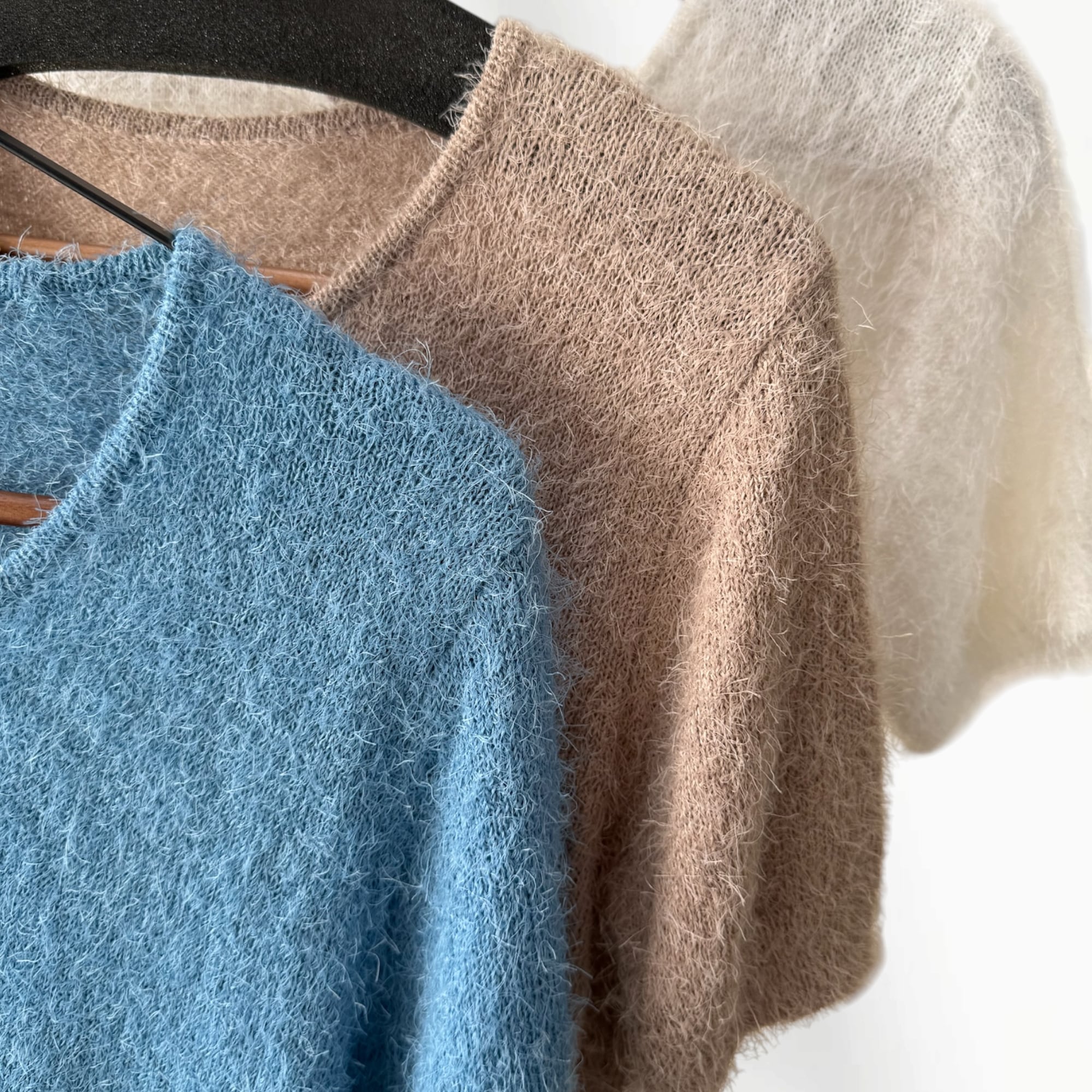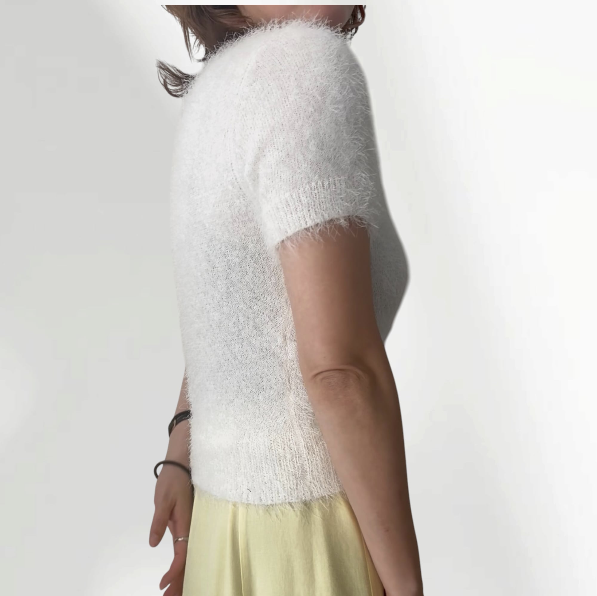 ● 軽やかで柔らかなサマーニットを使用したコンパクトTシャツ。ふんわりとしたシャギー感が女性らしさを引き立て、シンプルながらも特徴的なデザインが魅力的です。コンパクトなシルエットで、デイリーユースはもちろん、お出かけシーンでも存在感を発揮します。これからの季節に適した素材感で、爽やかなコーディネートをお楽しみいただけます✨