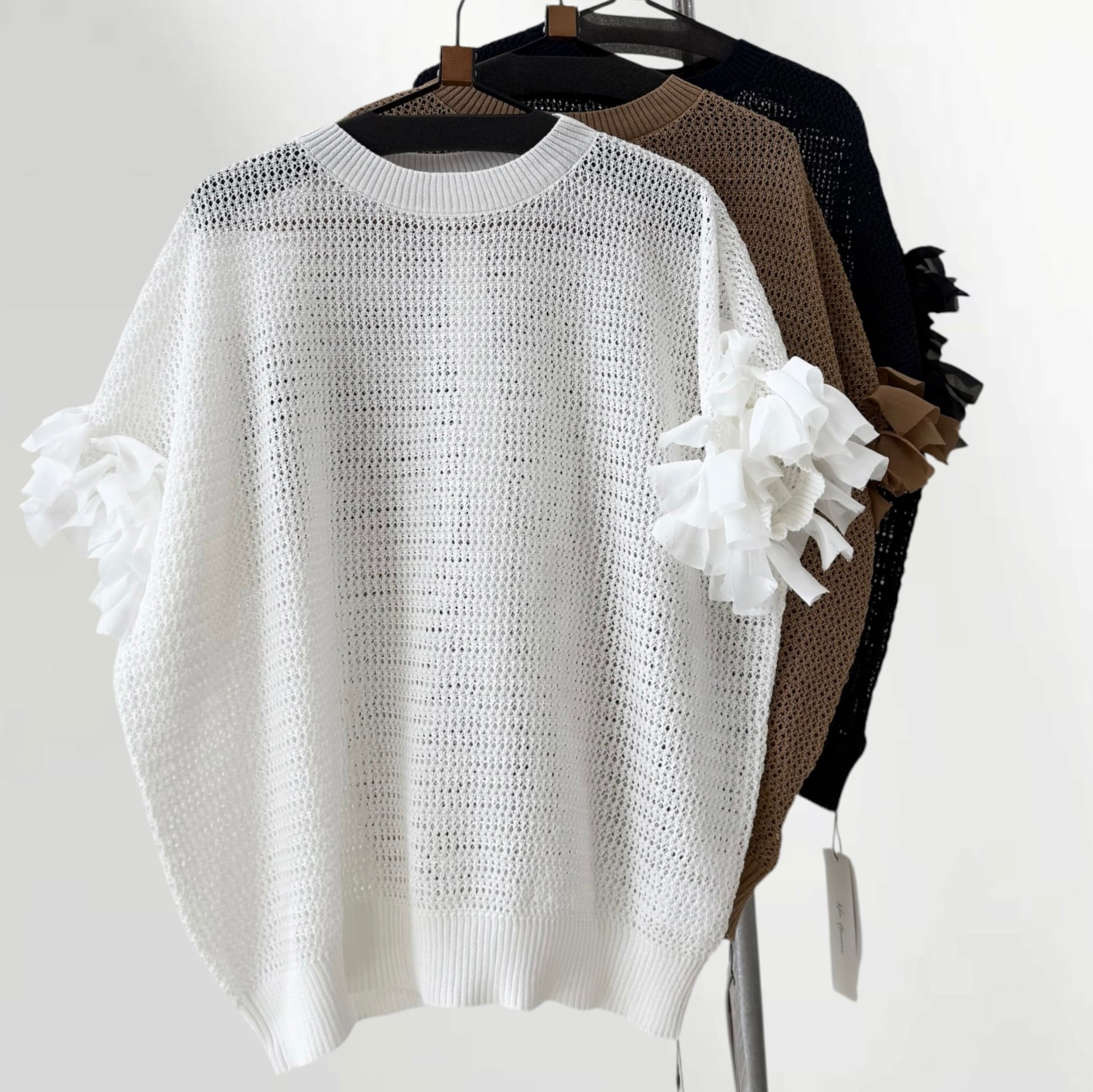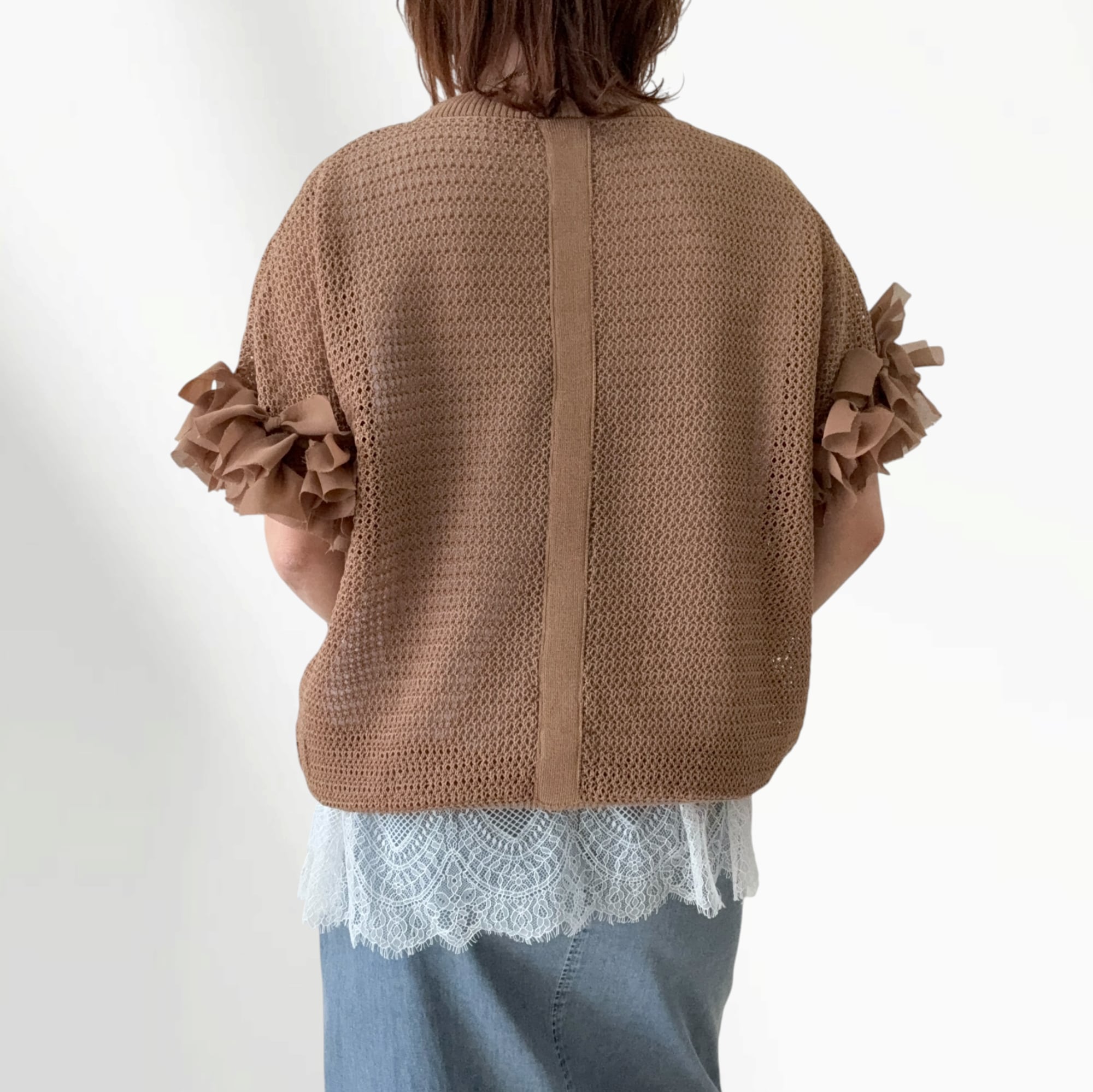 ● 袖にシフォン素材を使用したフェミニンな鍵編みプルオーバー。柔らかく軽やかなシフォンが、動くたびに華やかな印象を与えます。鍵編みデザインが特徴的で、シンプルなコーディネートを一段と引き立て、様々なシーンで活躍するアイテムです。カジュアルからデートやお食事会まで幅広くご利用いただけるます✨