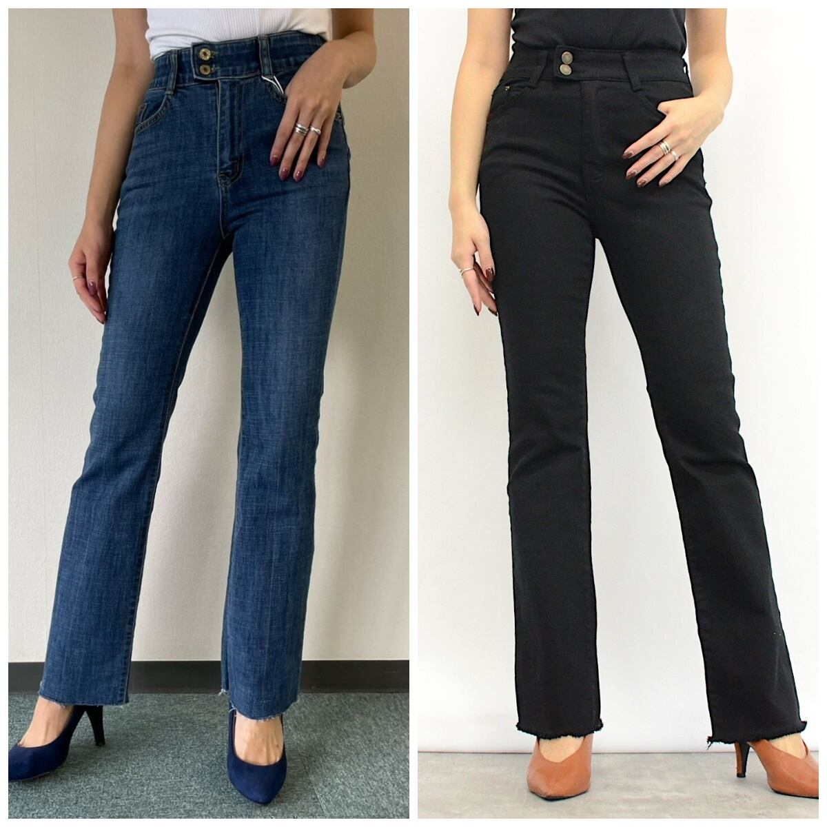 ●スッキリ脚長効果抜群のブーツカットデニム✨ヒップから膝まではスッキリとやや細めのシルエット、膝から裾までをフレアーなシルエットが特徴。ストレッチ性もあり、ウエスト裏はゴム仕様、お腹周りを楽にオシャレを楽しんでいただけます✨