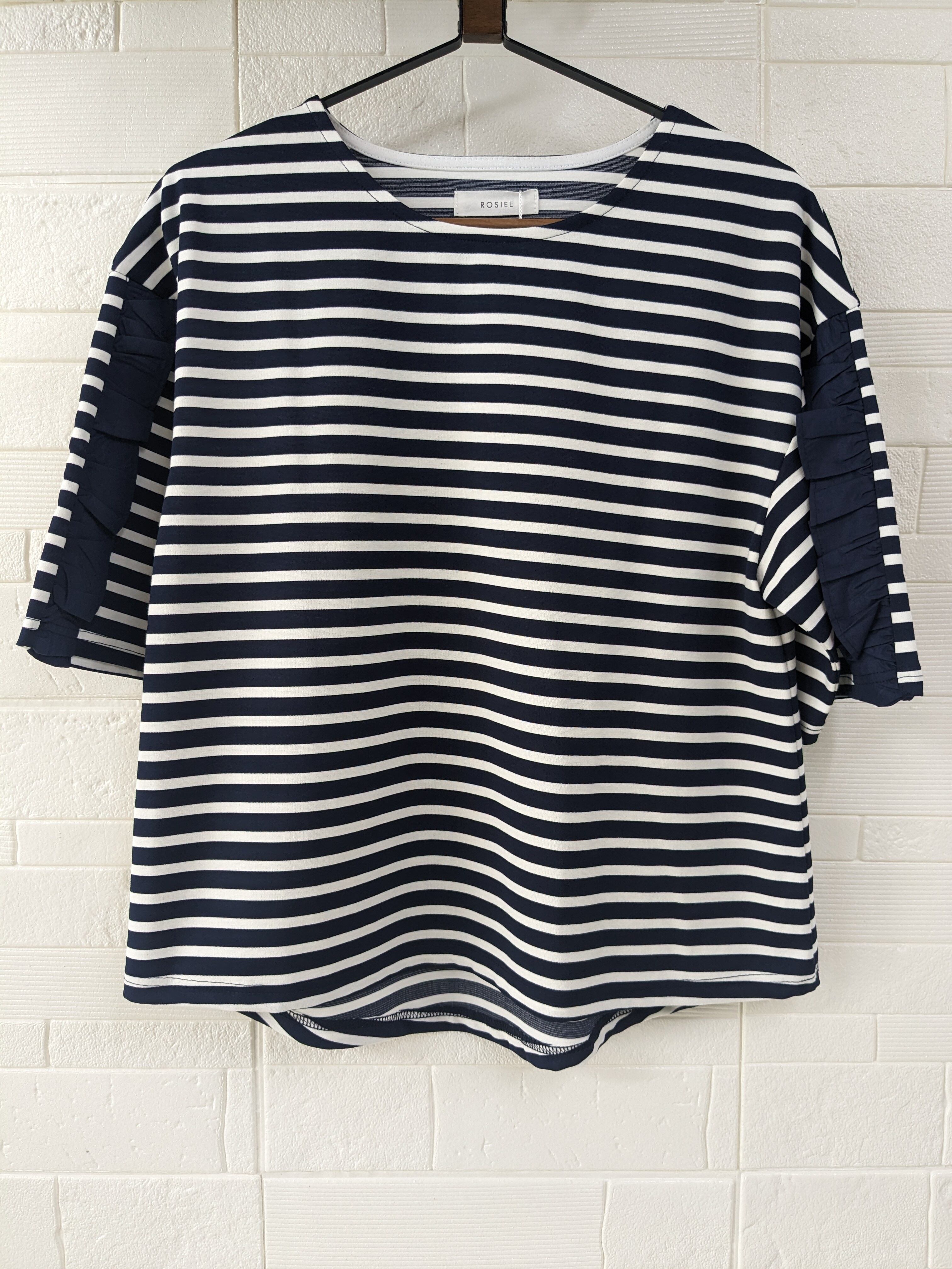 ●カジュアルに見えながらカットソーに袖フリルを施したトップス。身頃はシンプルなデザインで袖フリルがさらに華やかな印象。衿元はクルーネックですっきりとした印象に気になる二の腕もカバーしてくれる袖丈も嬉しいポイント。大人のカジュアルスタイルに大活躍。