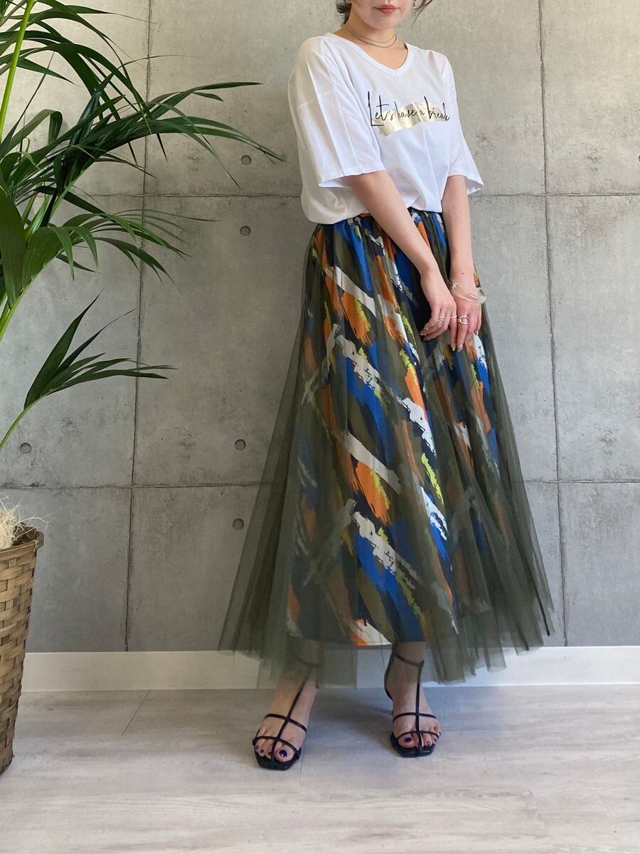 ●様々なカラーを使用したペイント風の柄にチュールを重ねた軽やかで爽やかな印象のフレアスカートです。