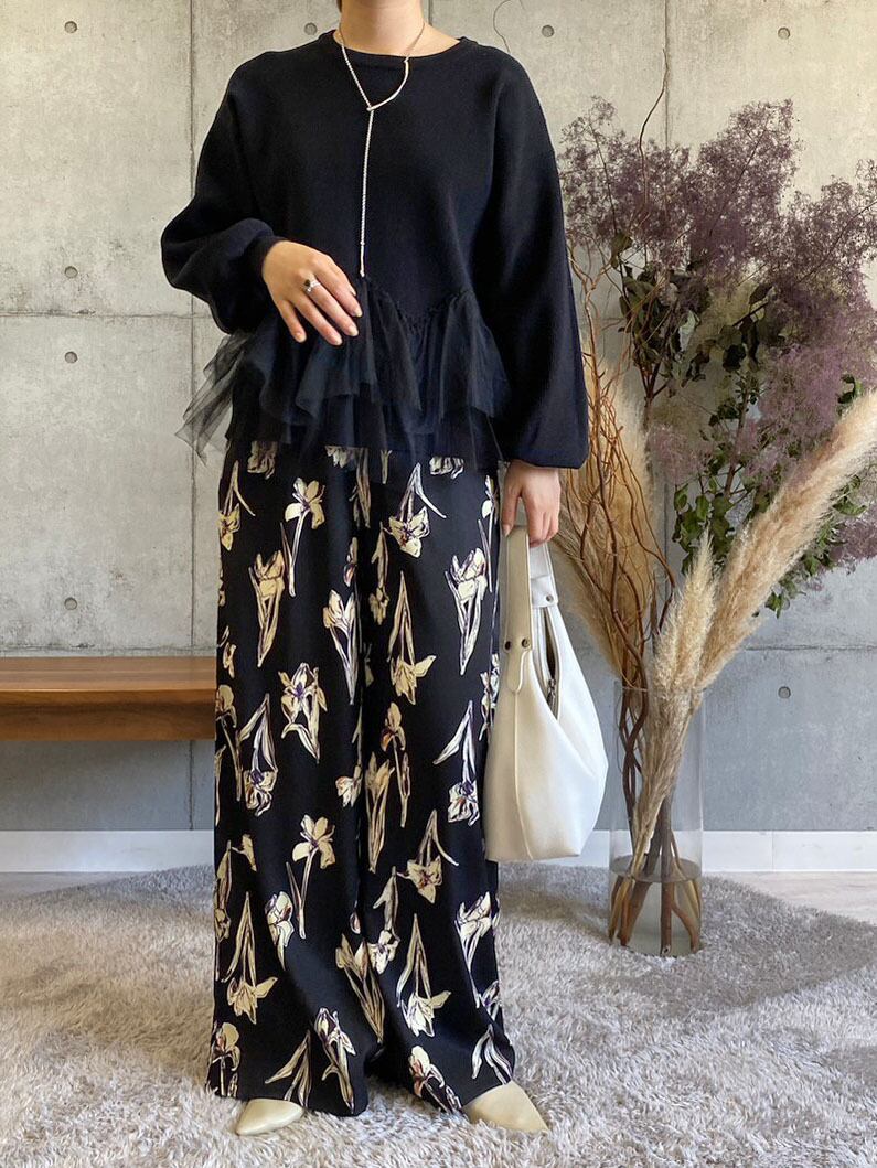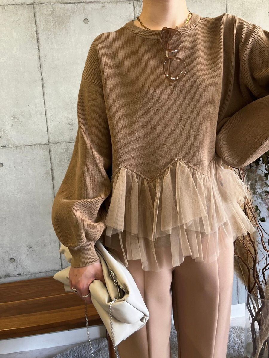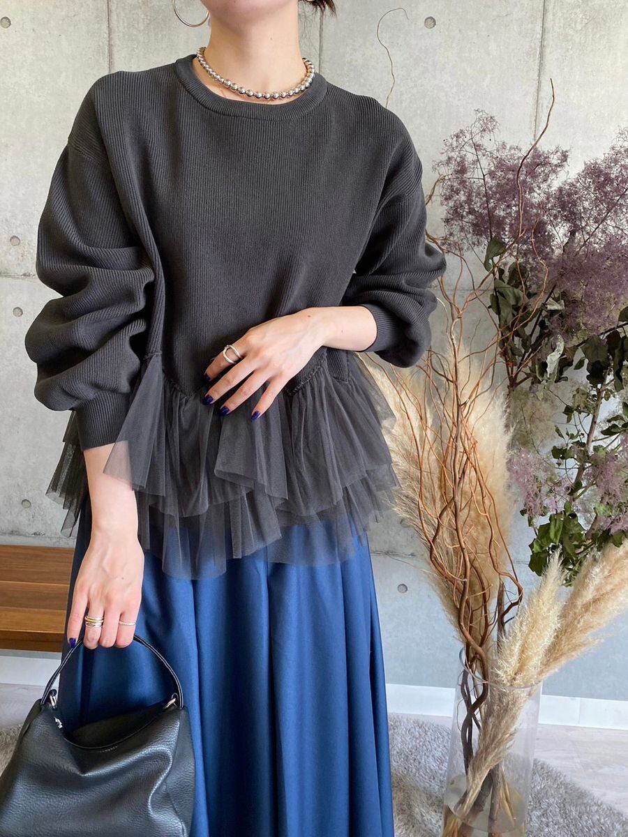 ●今までにないドッキングデザインがワンランク上のスタイリングを叶えます。ふんわりとしたチュールが、上品な印象を演出し、女性らしい繊細さも引き立てます。このニットはフェミニンなコーディネートにぴったり。秋から冬へと季節が移り変わる時期にぴったりの一着で、特別な日にも最適です。もちろん、普段のおしゃれにも役立つ一枚です。 一枚で主役級の存在感を放ちます✨