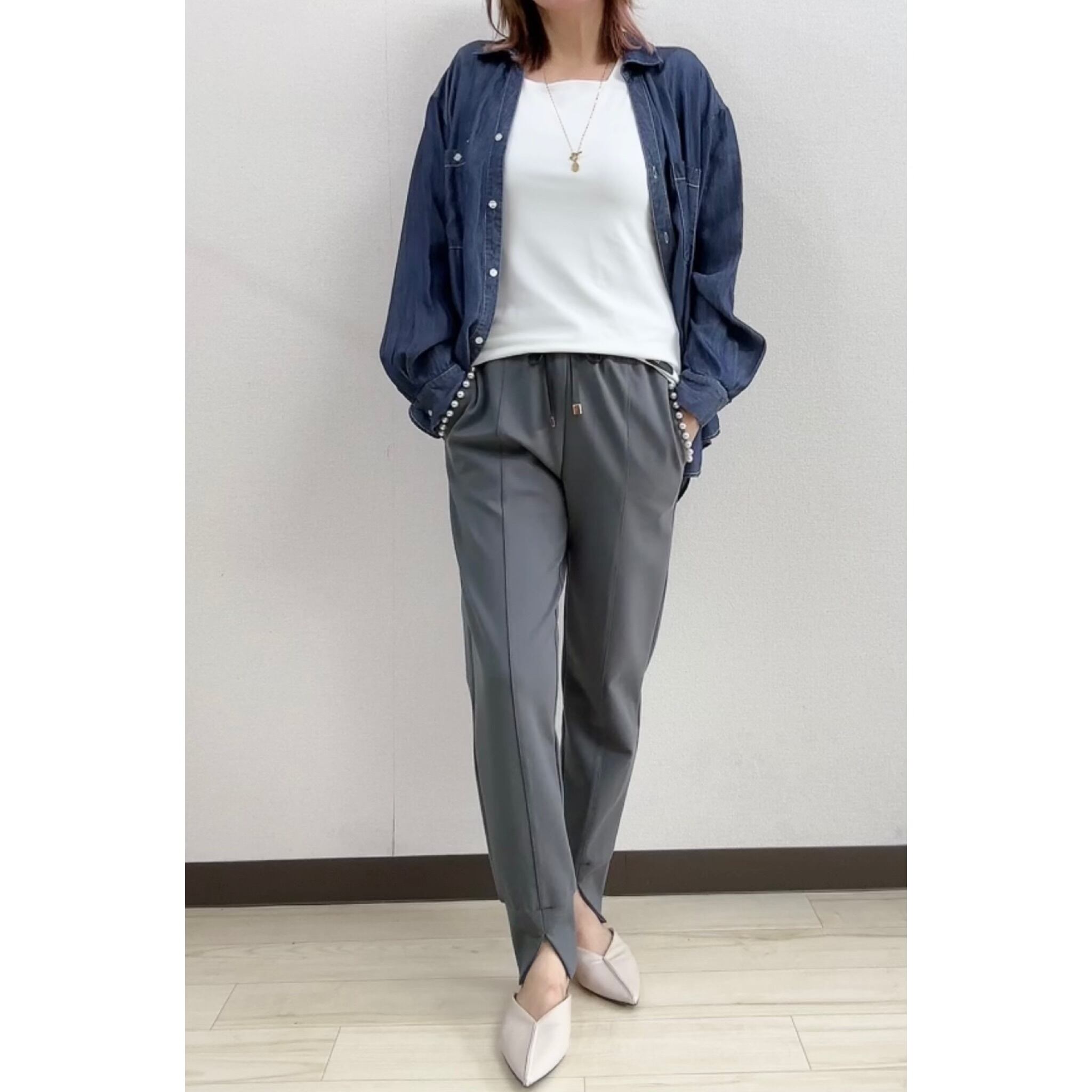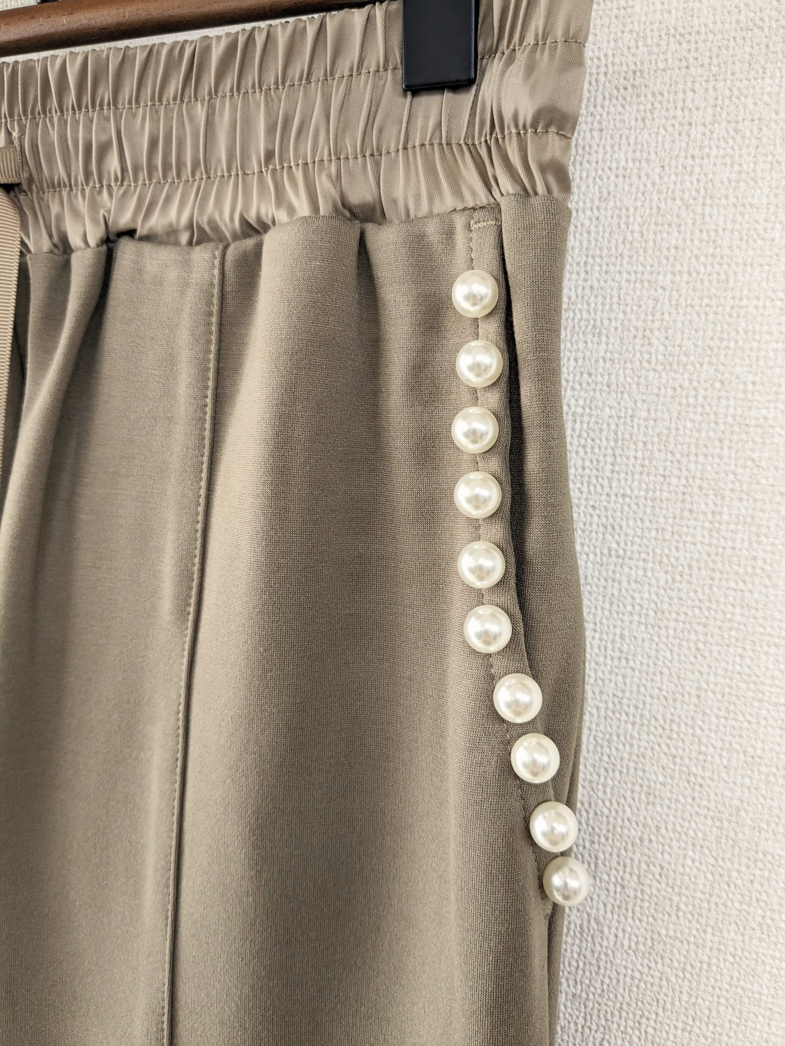 カットソー素材でセンターステッチデザインが美脚シルエットを演出。ポケットのパールやウエスト部分にサテン、細かい部分にもオシャレなポイントあり✔カジュアルな中でも微光沢がありキレイめのジョガーパンツ。