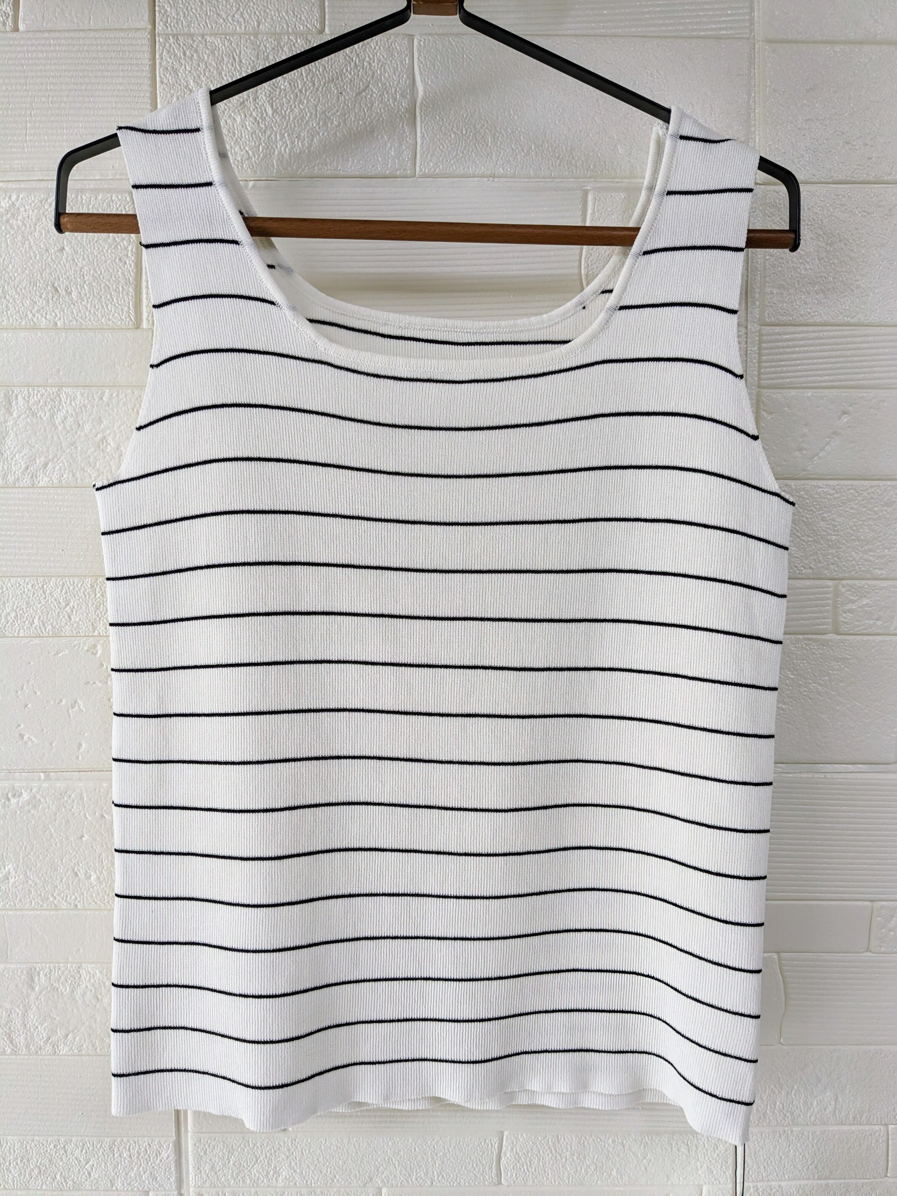● ひんやり感のある薄手ニット素材です。細く控えめなラインボーダーなのできれいめスタイルにも相性抜群です✨インナー使いにも便利なタンク。同素材で五分袖も御座います。