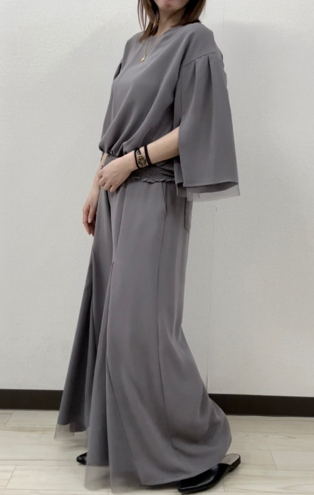 袖チュール裾シャーリングポンチ
