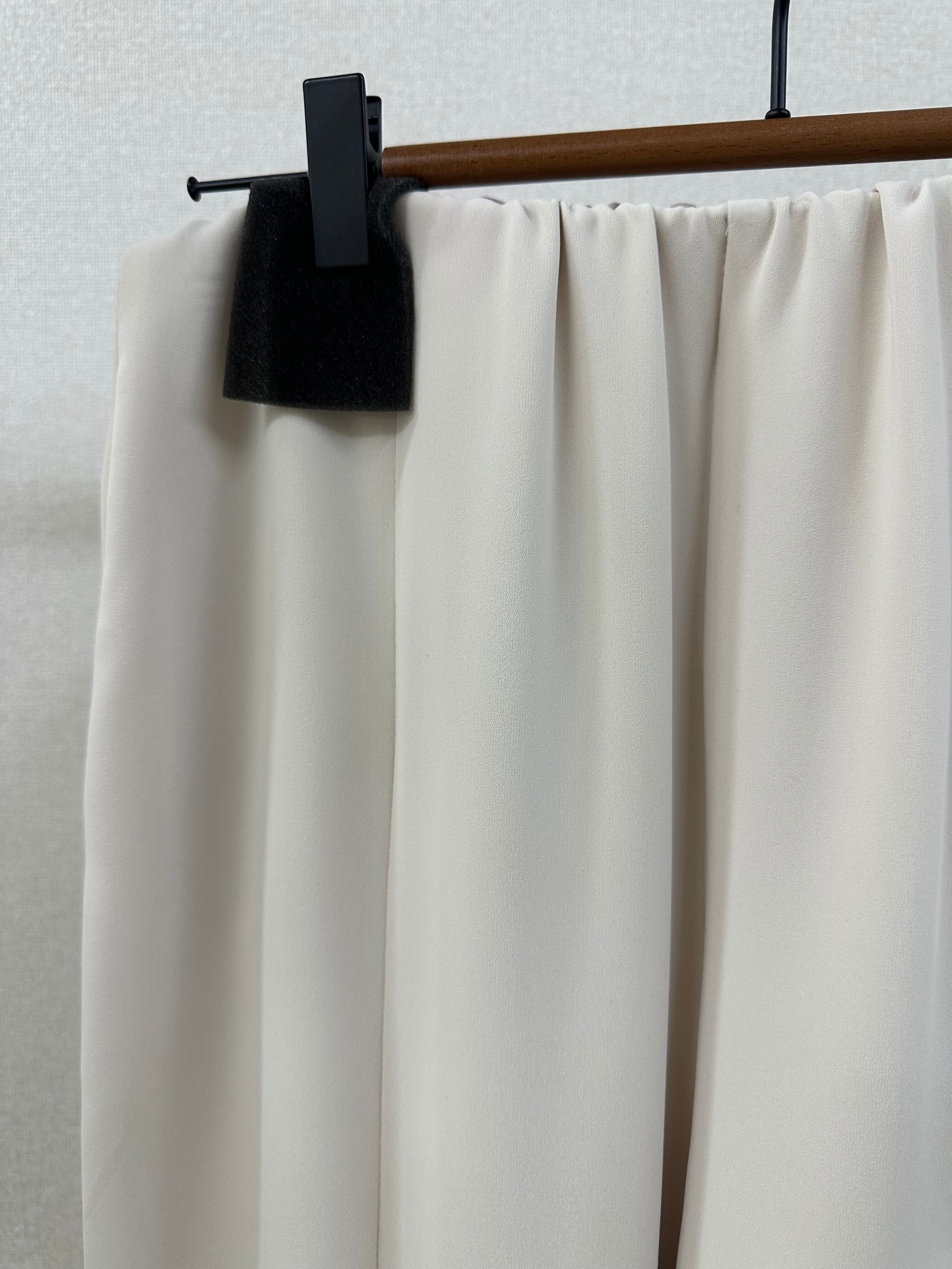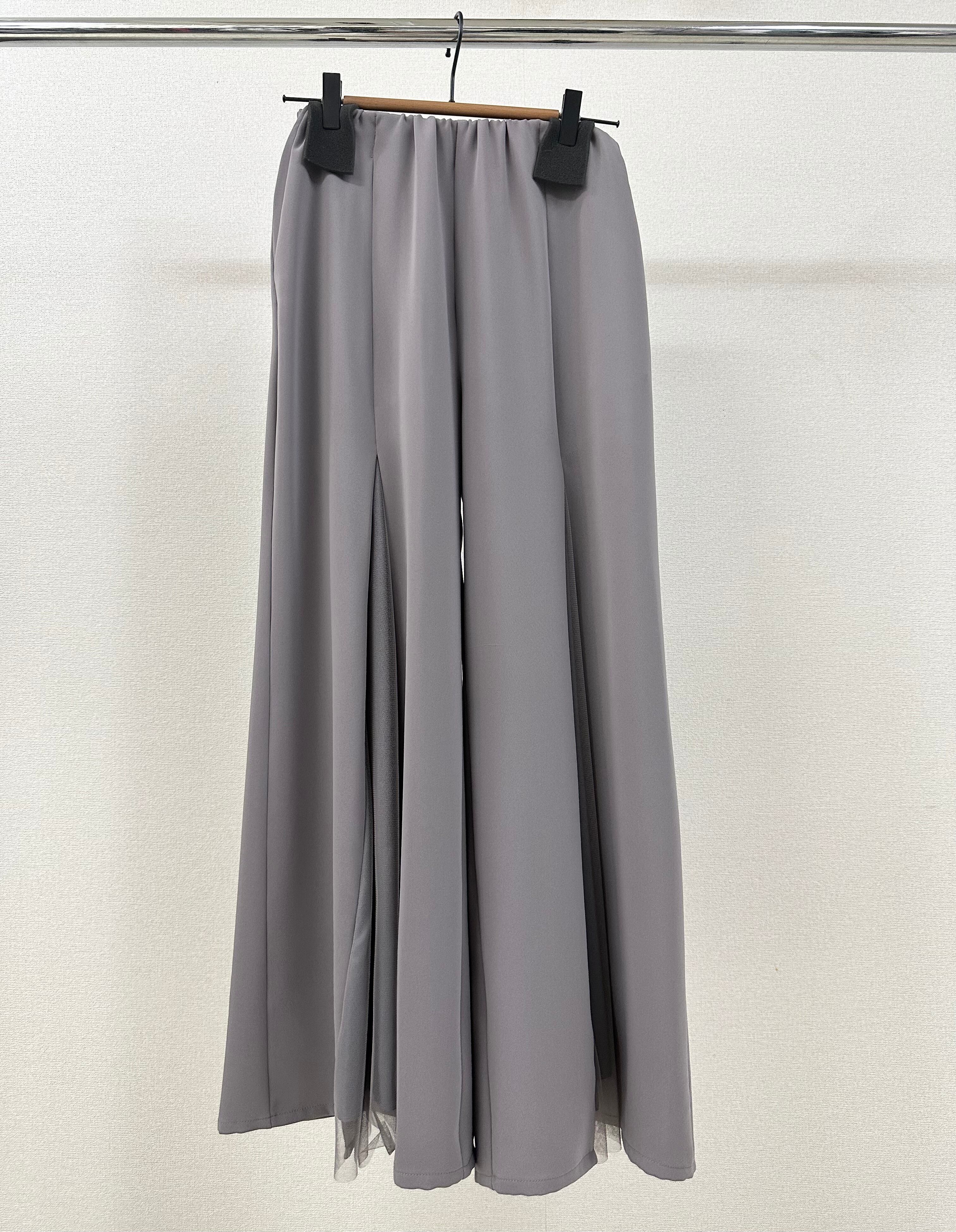 ● トレンディなデザインと女性らしいスタイルを叶える一着です。フロントに施されたチュールが華やかさをプラスし、ワイドなシルエットが美脚効果を発揮します。薄手のポリエステルポンチ素材なのでカジュアルになり過ぎずとろみ感のあるドレープ感がキレイです✨