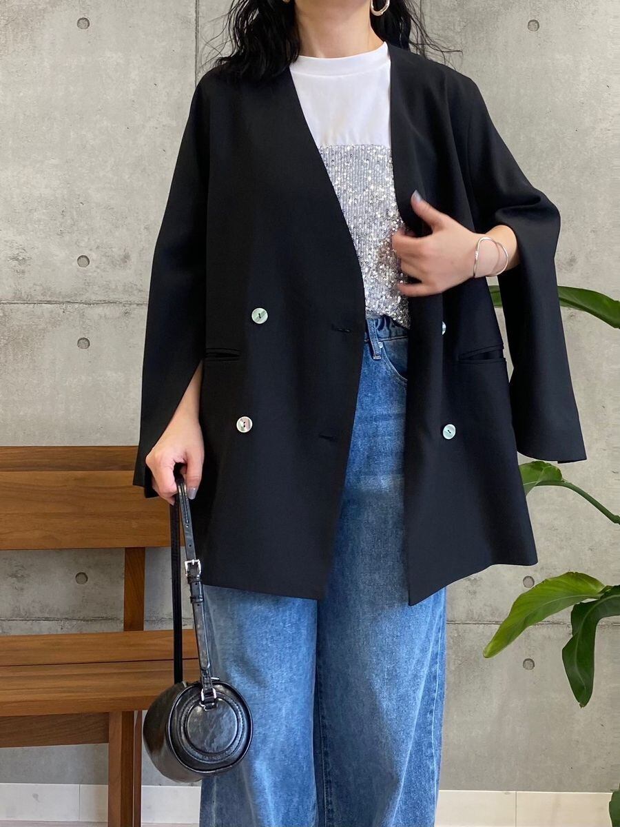 ●着るだけでお洒落な雰囲気漂うノーカラージャケット✨スリットスリーブはトレンド感あふれ、程よく緩いシルエットがカジュアルなアイテムや上品な大人レディスタイルとも相性抜群。オフィスやセレモニーなどにも着用できるのでオンオフ問わず着回しやすいアイテム。