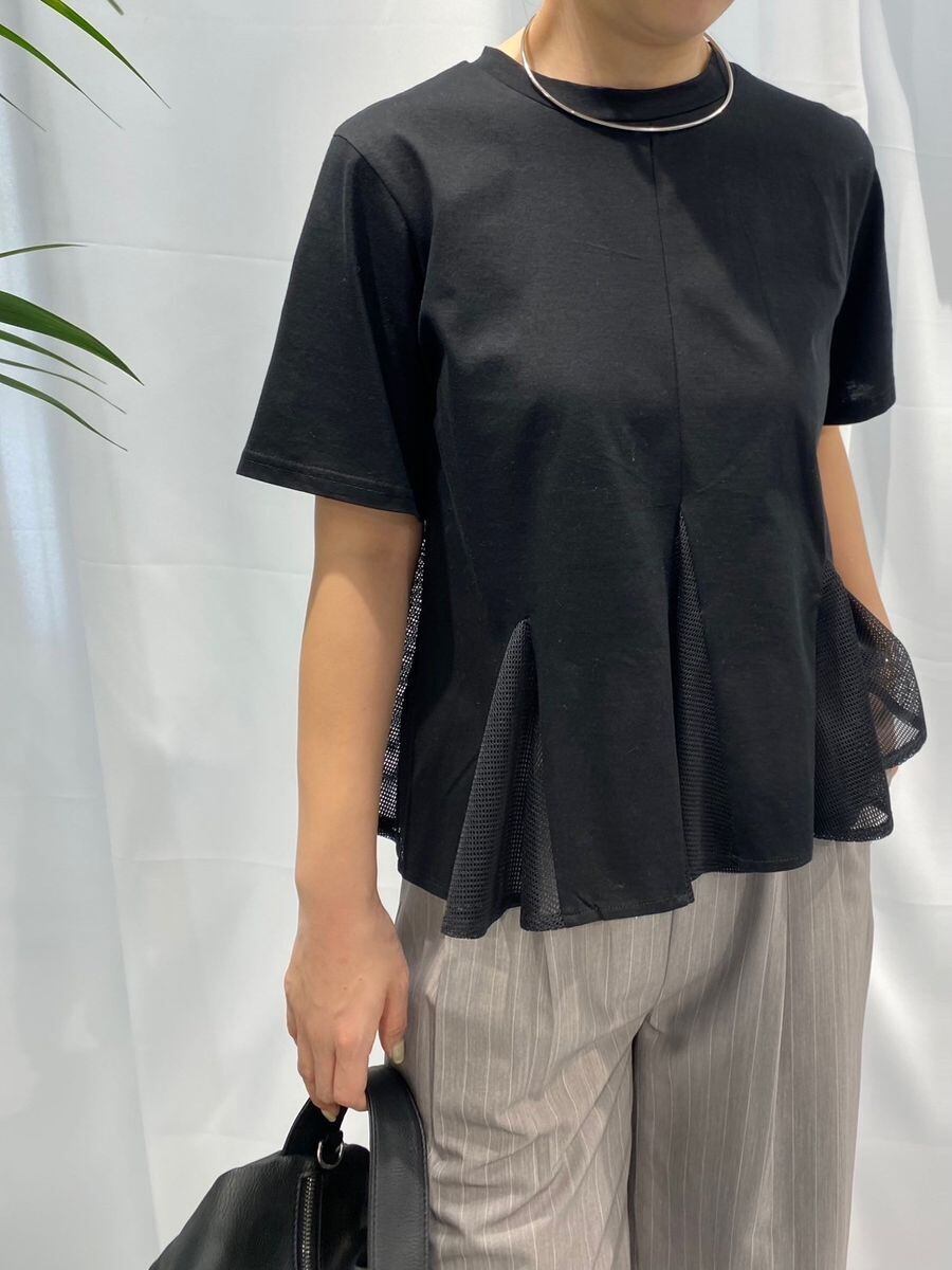 ●メッシュパネルがアクセントのトレンド感満載トップス。メッシュ素材が涼しげです。綿素材の身生地部分もシルケット綿なのでサラサラスルスルとした気持ち良いTシャツとなります。