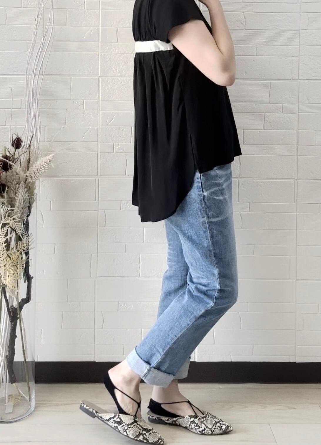 スソに向けて細くなるテーパードシルエットでルーズさもありながら、大人のシルエットライン✨デニムの色合いも加工感が絶妙。ストレッチが効いており、柔軟性に優れ、着心地がよく、動きやすさバツグンです。ウエスト裏はゴム仕様。お腹まわりもストレスフリーで過ごせます。