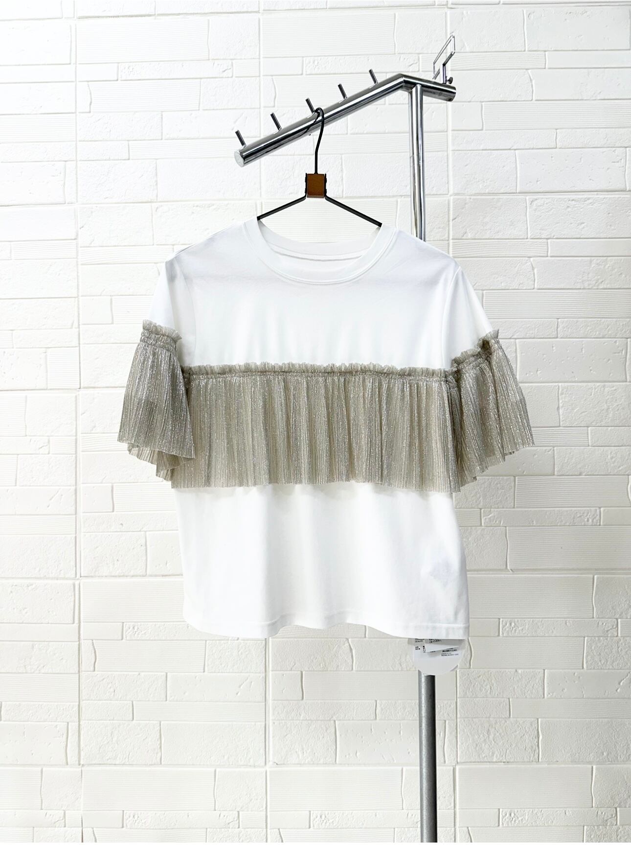 ● キラキラとした輝きをまとったラメチュールが、さりげなくTシャツに装飾されていて華やかな印象を演出してくれます。カジュアルなスタイリングにも取り入れやすく、一枚で主役になれる存在感を持っています✨ このラメチュールラッフルTシャツで、日常をちょっぴり豊かに彩ってみませんか?