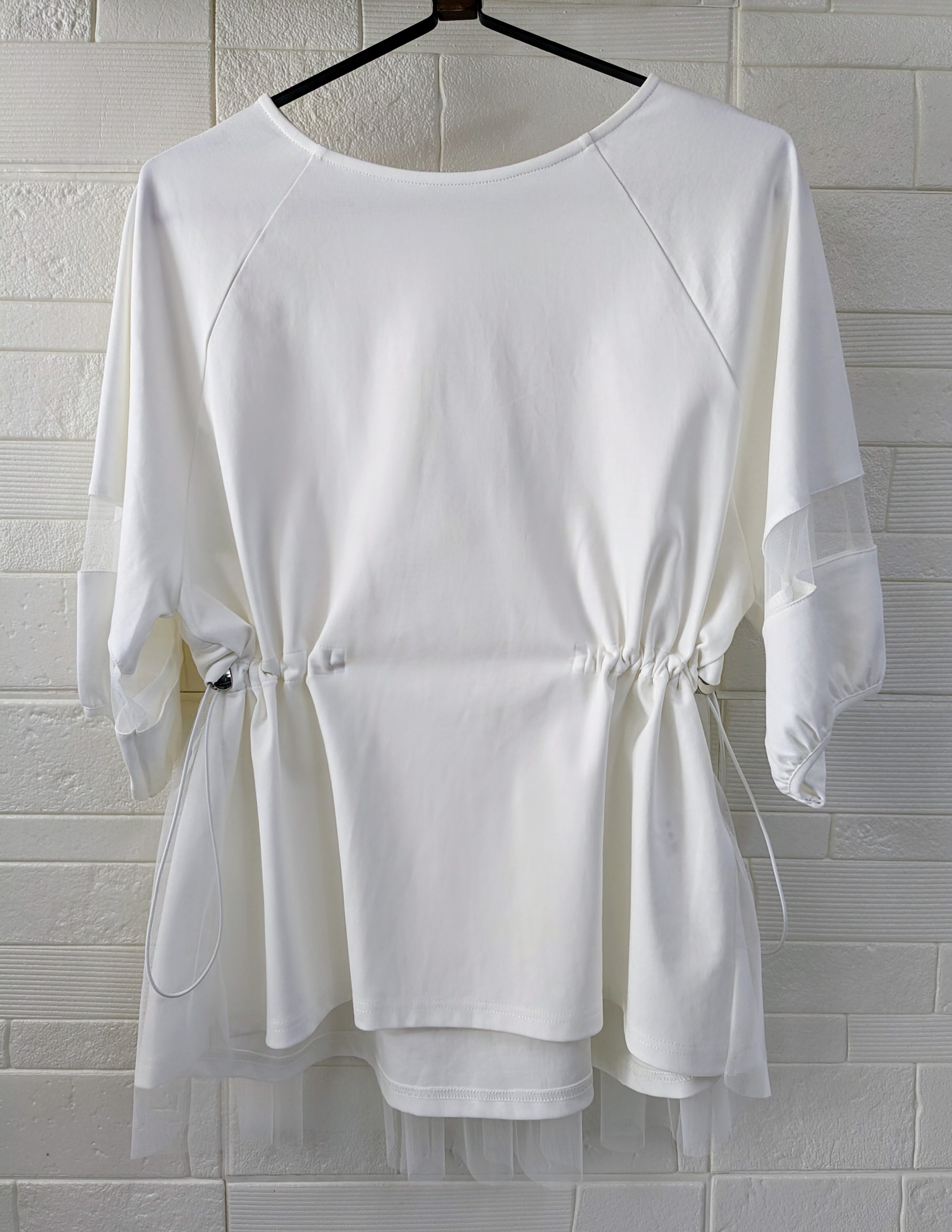 ●後ろの切り替えチュールデザインが魅力的なTシャツ✨ウエストはドロストでお好みに絞ってペプラムデザインが可能。袖にシアーラインが抜け感もありふんわりしたシルエットが二の腕もカバー◎