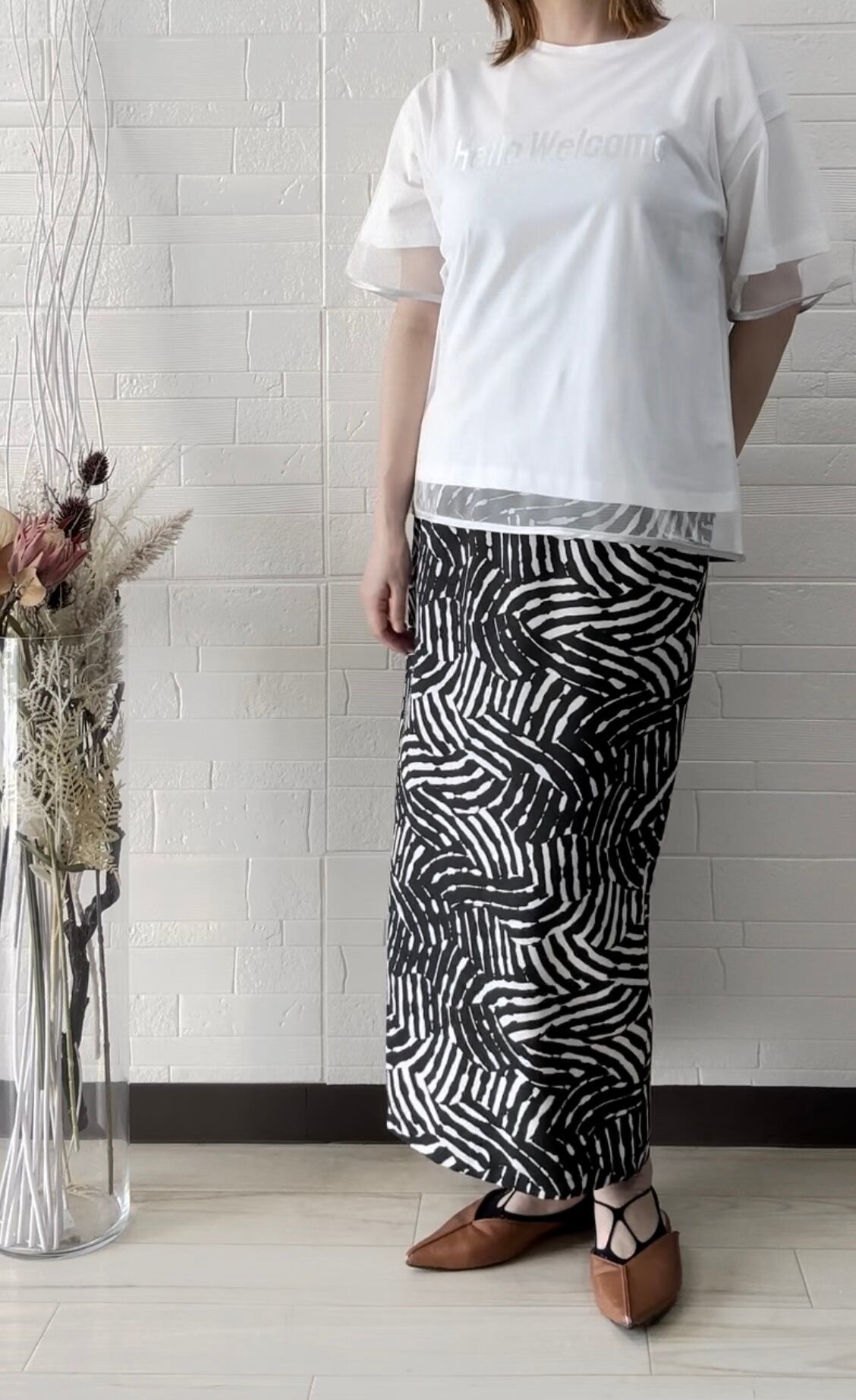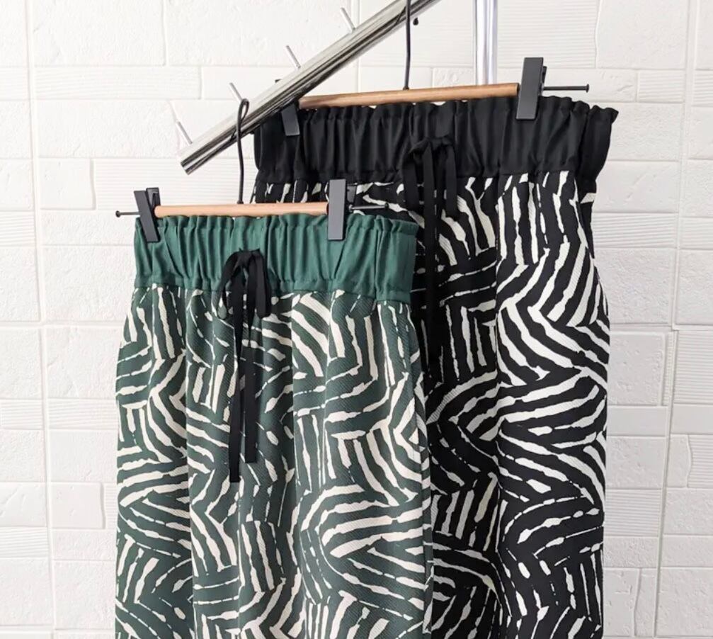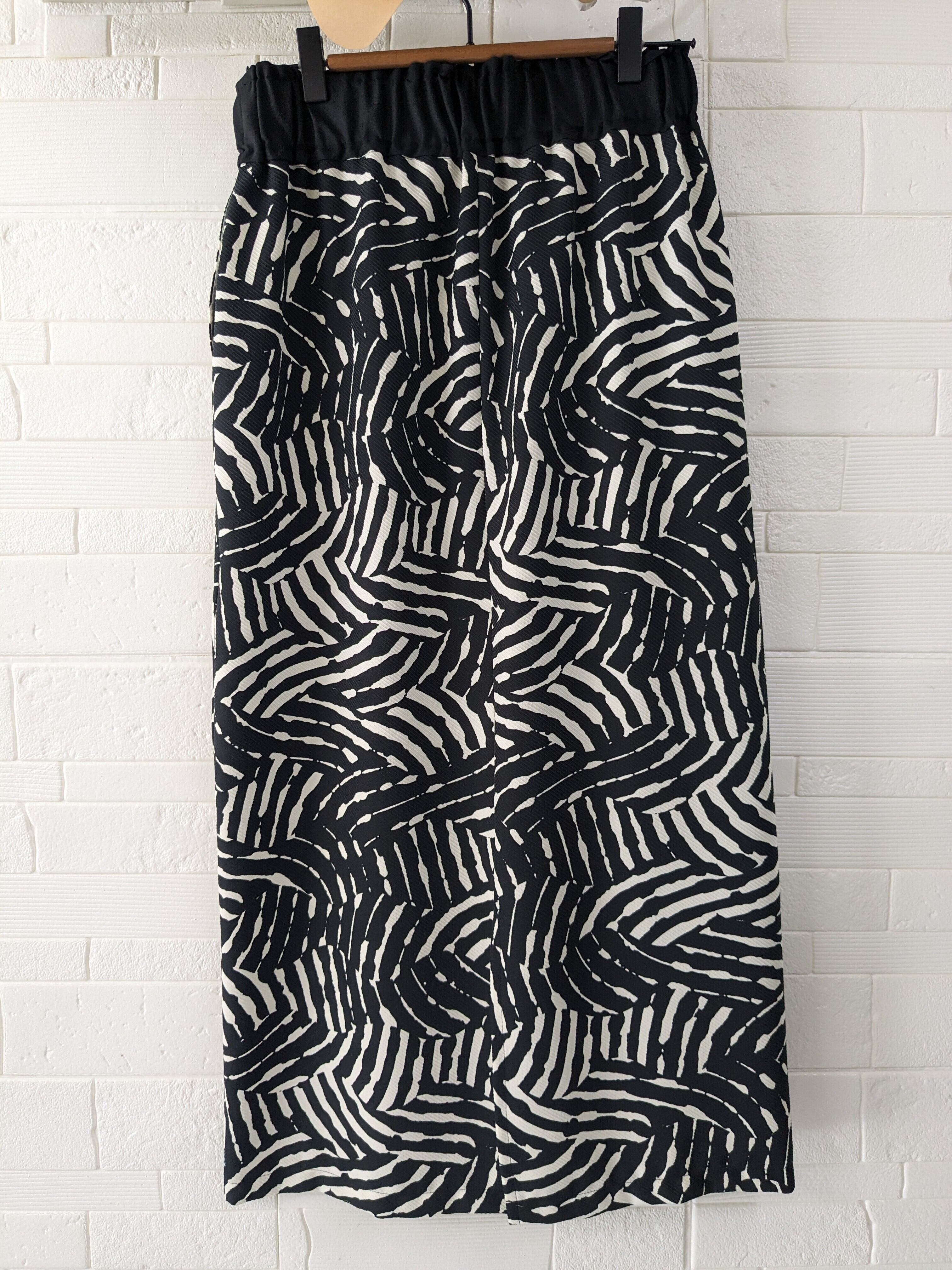●薄手ツイル生地にプリントされた裏地のないタイトスカート✨品のある光沢感、柔らかさな肌触りを兼ね備えたスカート。主役になる柄スカートはウエストゴム、バックスリットで穿き心地抜群。