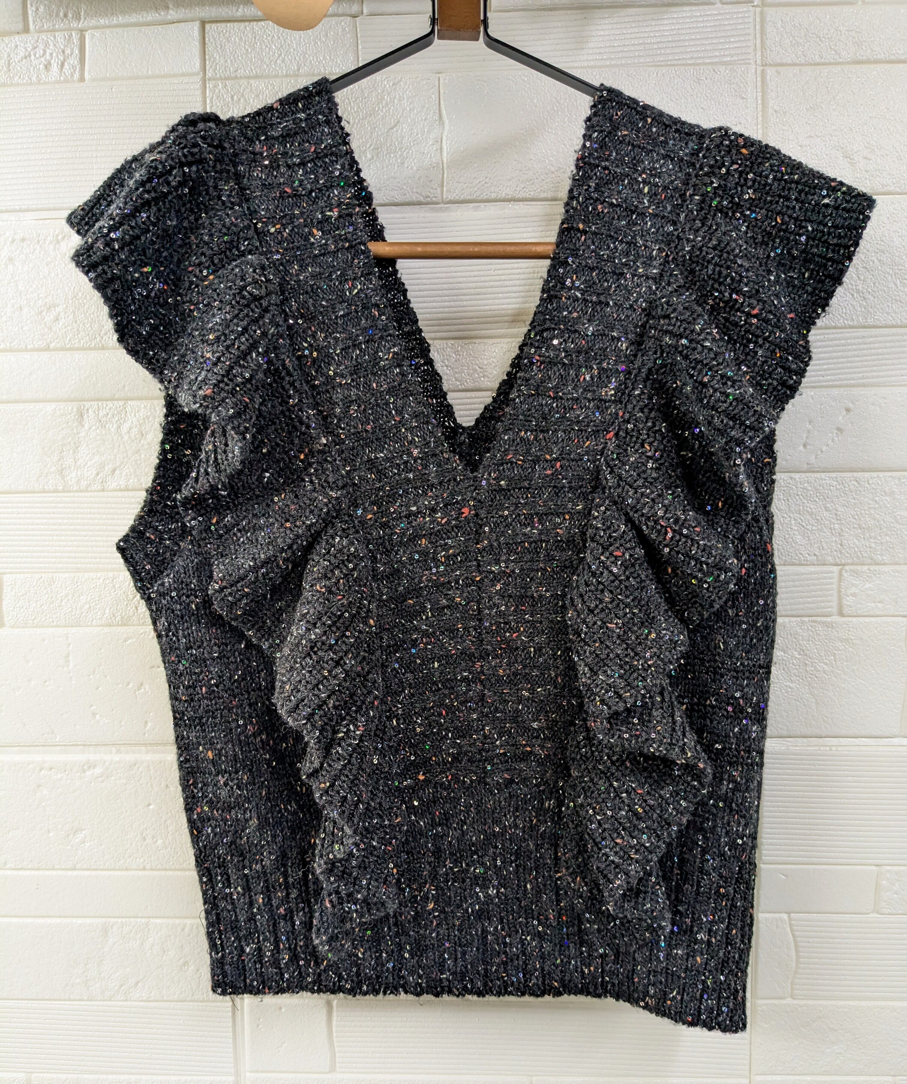 ●カラフルな糸、小さなスパンコールな表情豊かに演出してくれるフリルニットベスト。
