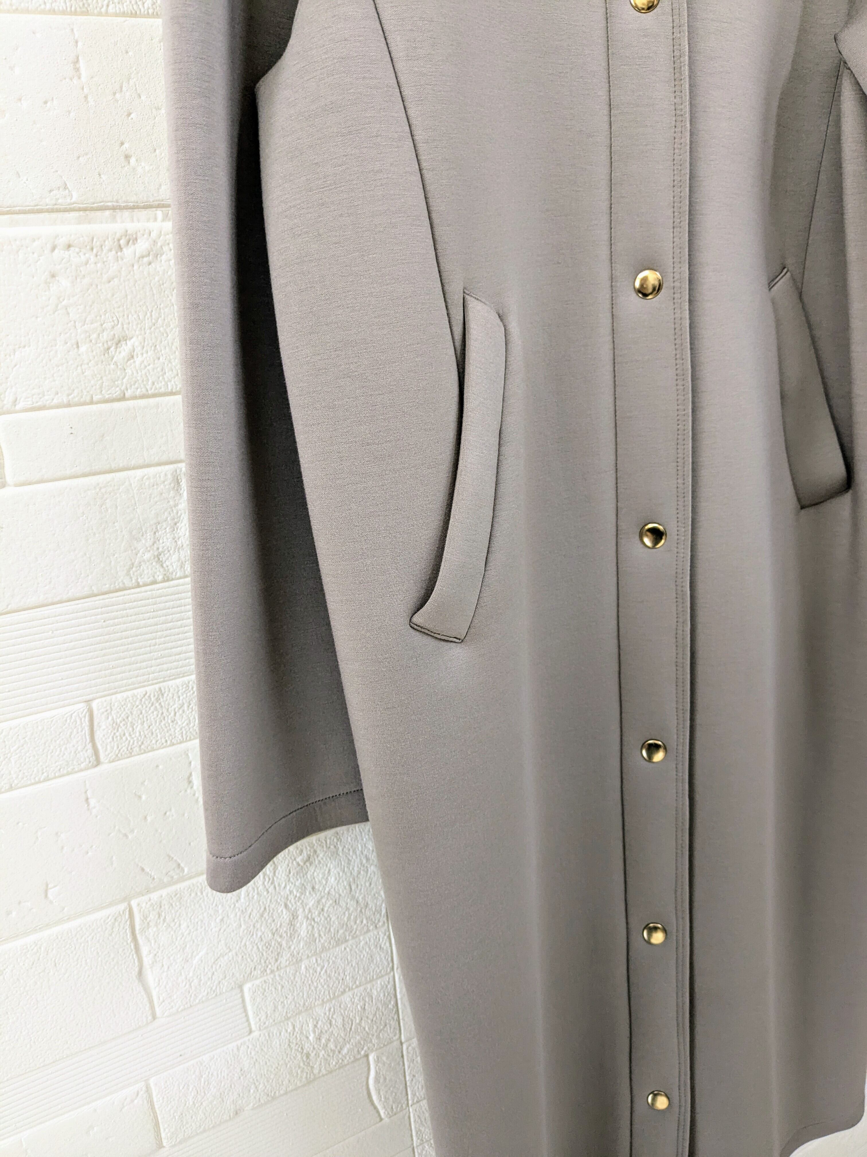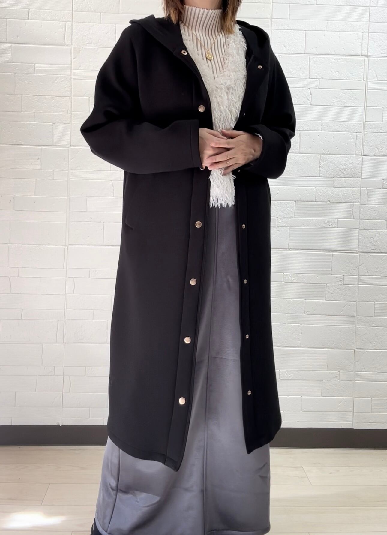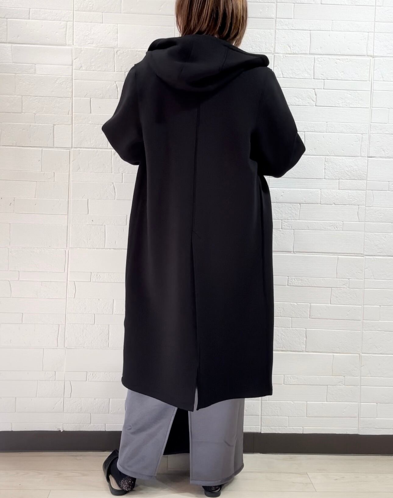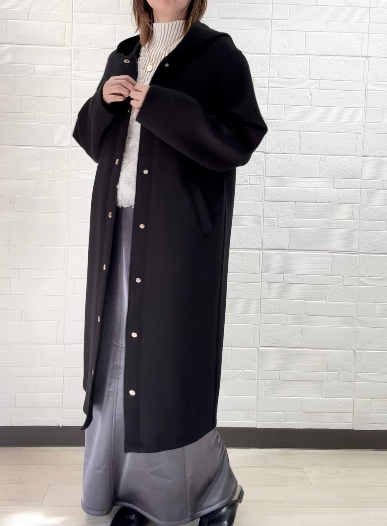 ●スムースな肌触りでIラインシルエットがスタイルアップしてくれます。ロングコートの中でも軽量で、大きく開いたベンツ仕上げのスリットは目を惹きつけるデザイン。