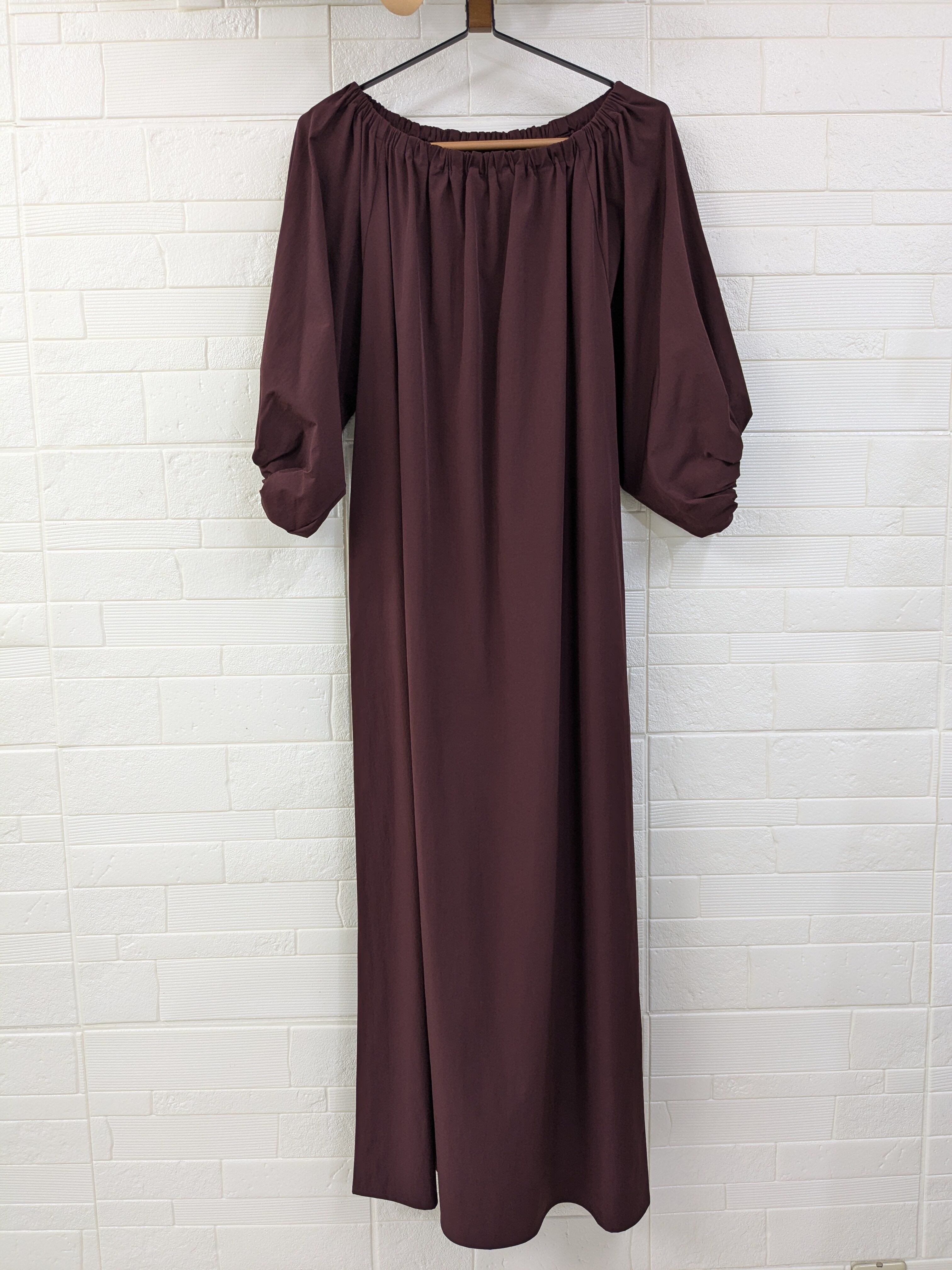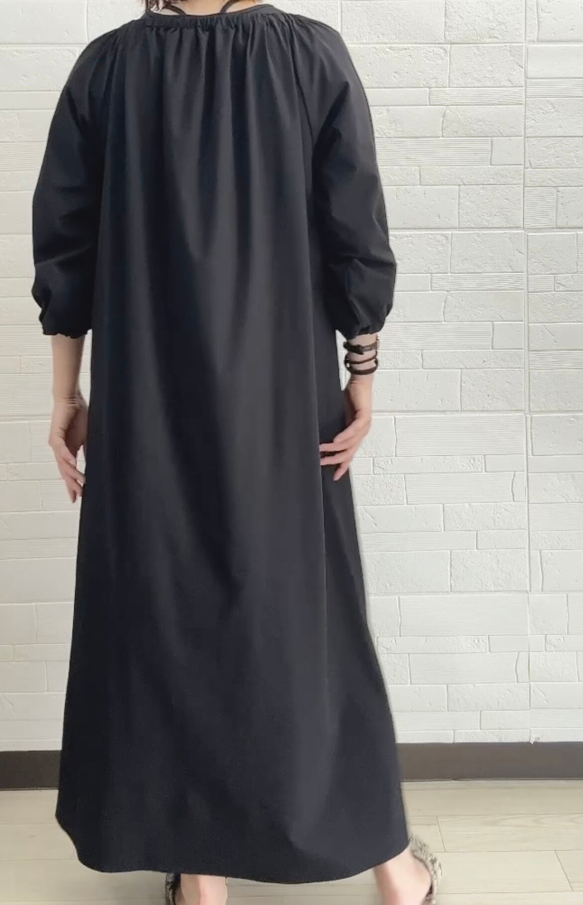 ギャザーデザインでデコルテラインを綺麗に魅せ、袖口のパフデザインがふんわりとした印象を与えながらも落ち感のある女性らしいシルエットのワンピース。